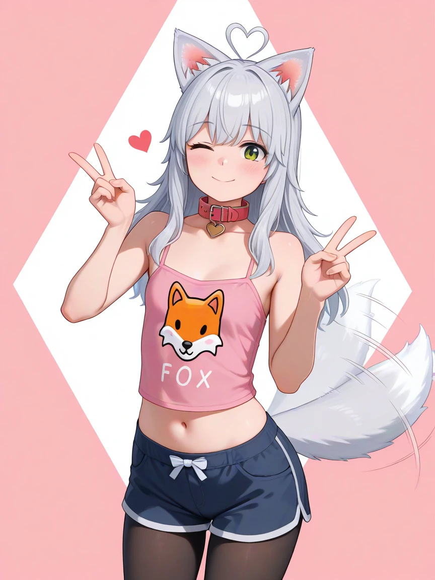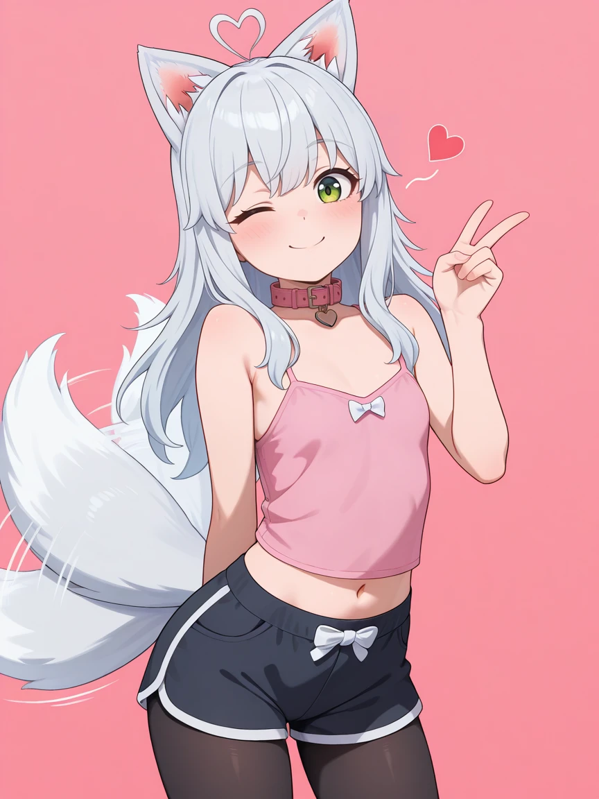 kitfox, animal ears, long hair, ahoge, tail, collar, heart, green eyes, heart ahoge, grey hair, pink camisole, midriff, navel, shorts, black pantyhose, boots, brown boots,
