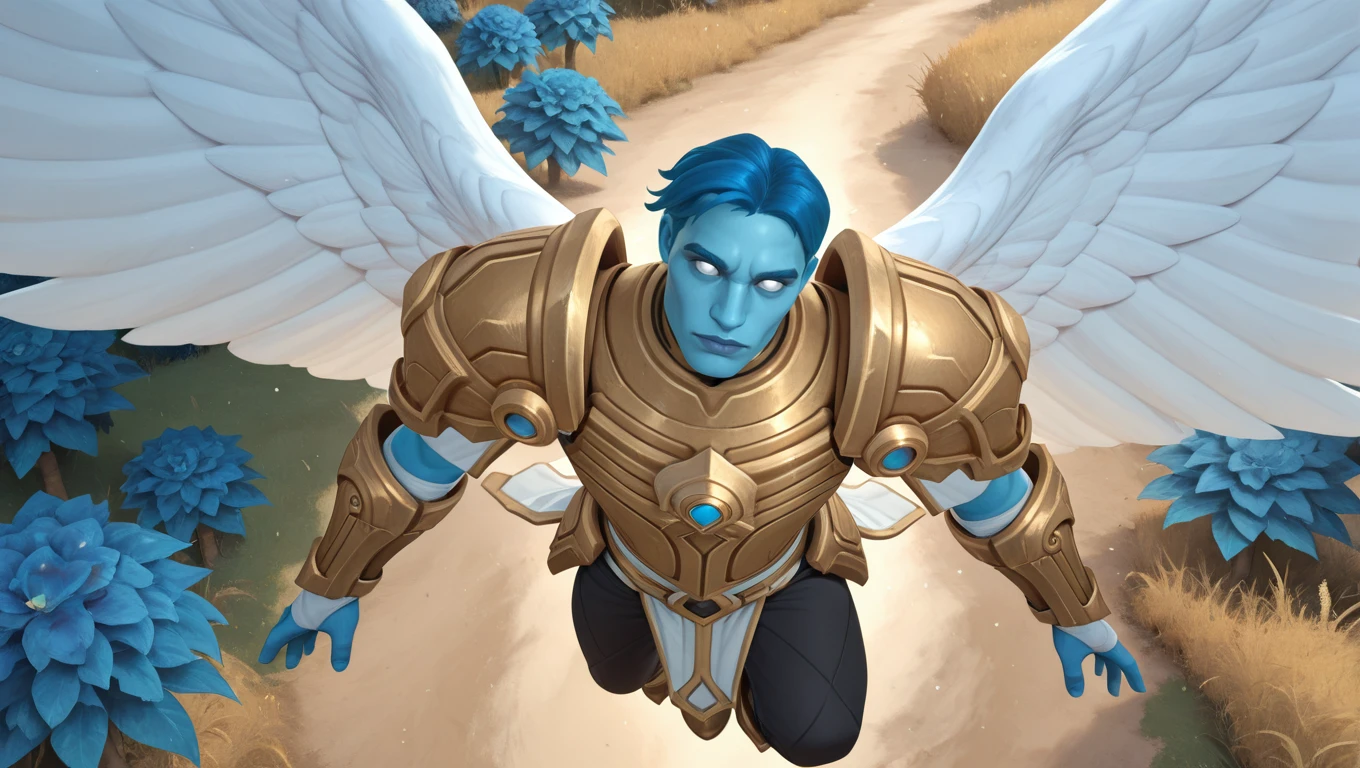 wowkyrian, 1boy, adult male, mature, blue skin, blue hair, short hair, white eyes, no pupils