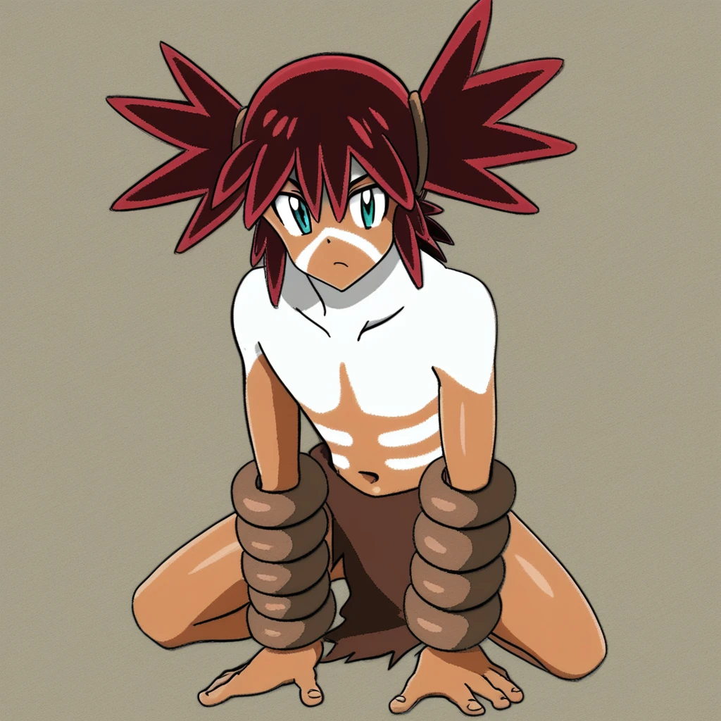 full-length portrait, dynamic pose, forestal background, a sexy male, 1boy, male focus, squatting, barefoot, bangs, dark skin, red hair, dark-skinned male, toes, solo, green eyes, twintails, tribal, all fours, ??????? male, frown, collarbone, hair between eyes, full body, spiked hair, loincloth, navel, bodypaint, knees, short hair, solo focus, feet, eyelashes, groin, aqua eyes, bracer, facepaint, bracelet, hair tie, bound wrists, ???????, wristband, facial mark, v-shaped eyebrows,