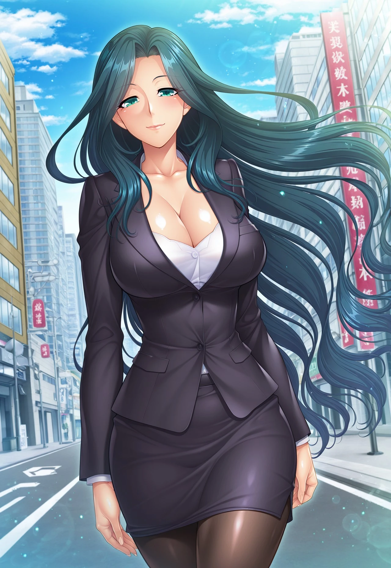 4th outfit: official alternate costume, formal, black suit, cleavage, skirt suit, pencil skirt, black pantyhose