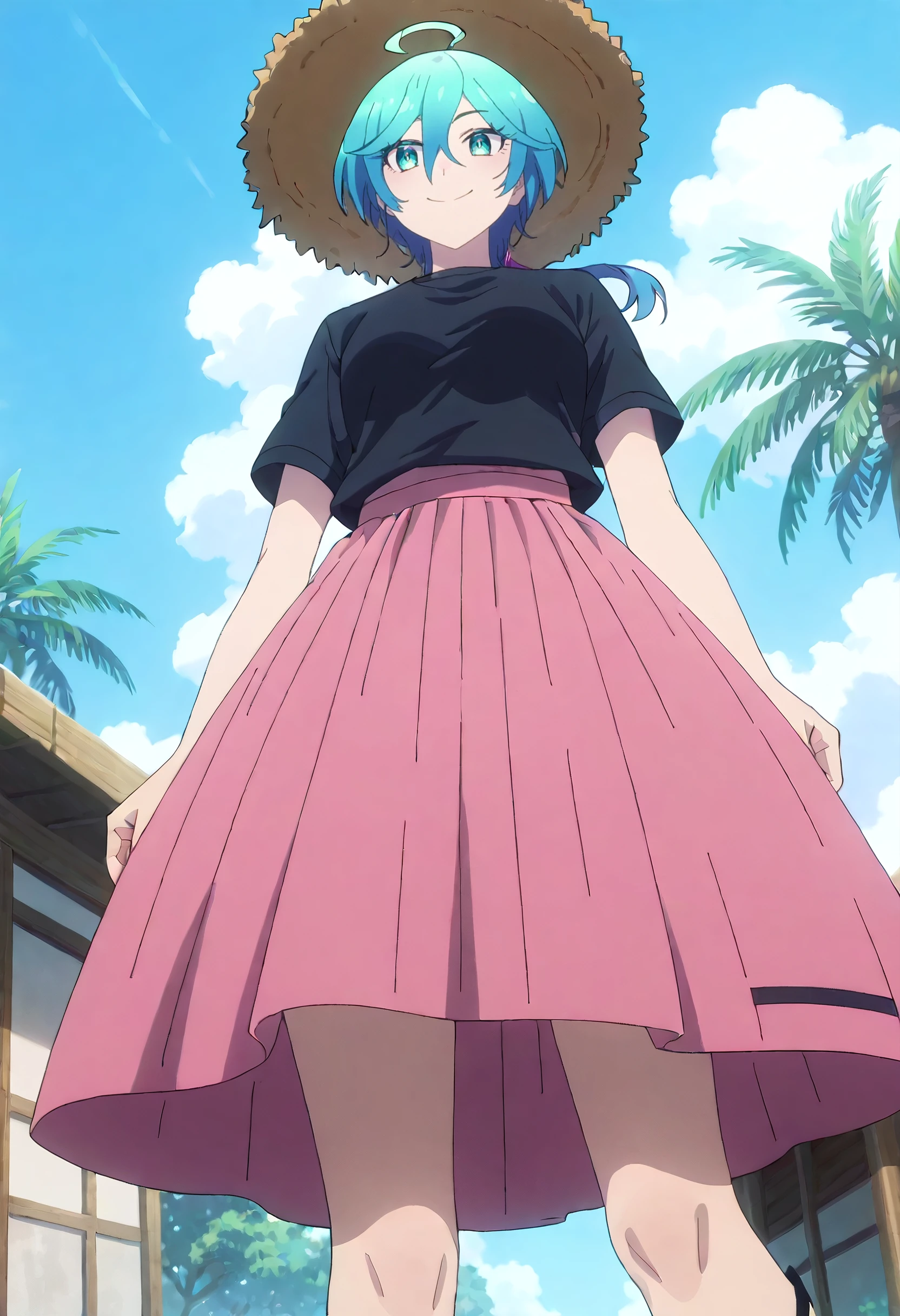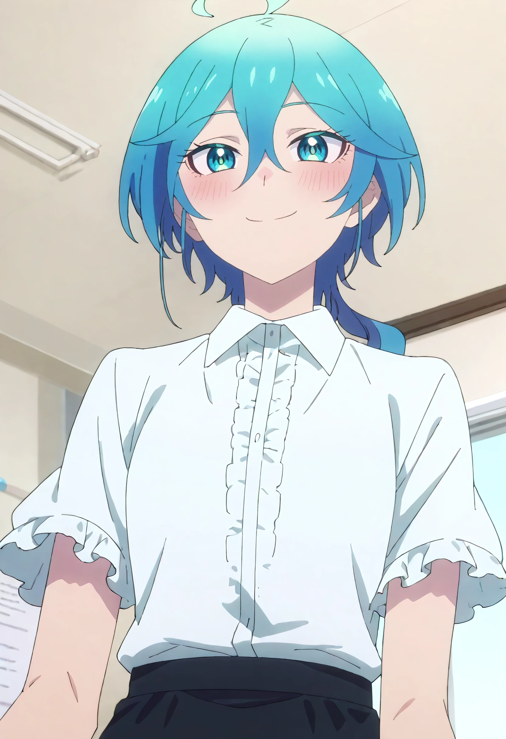 RWLTina, blue hair, ahoge, aqua hair, multicolored hair, blue eyes, short hair, low ponytail, hair between eyes,