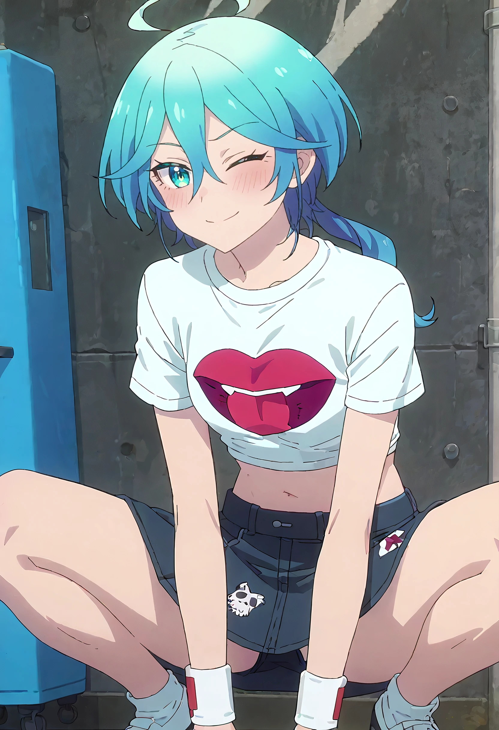 TinaShirt, white shirt, short sleeves, ponytail, t-shirt, print shirt, midriff, crop top, cropped shirt, black skirt, miniskirt, navel, denim skirt, wristband, lowleg skirt,