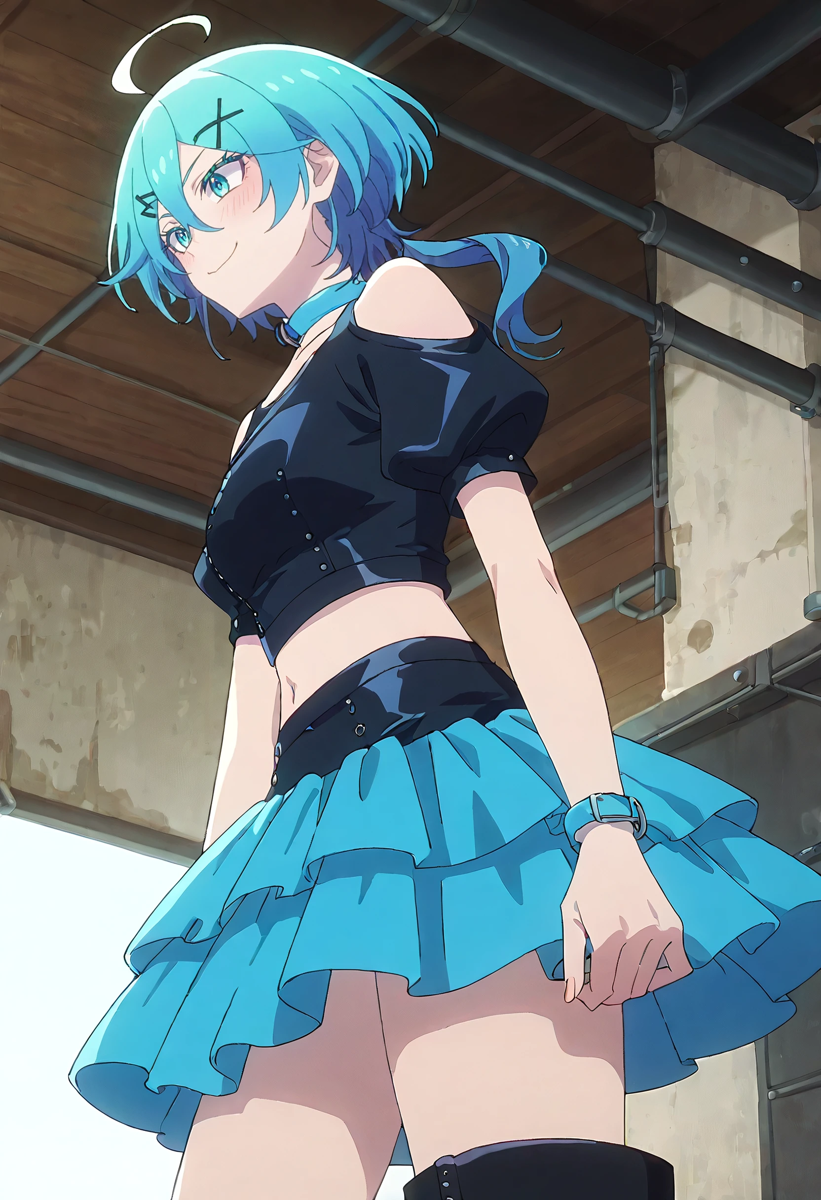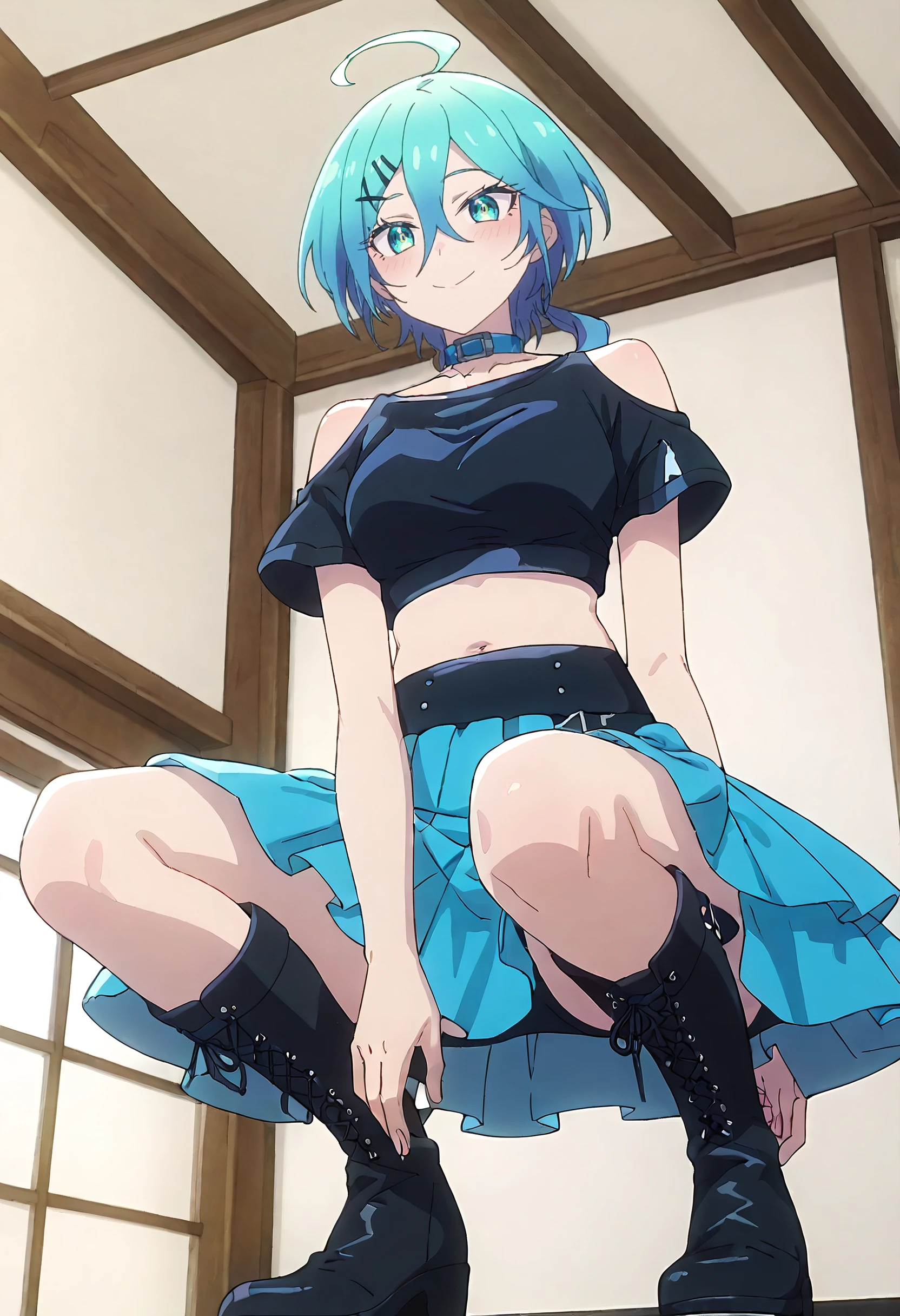 TinaSkirt, black shirt, midriff, crop top, aqua skirt, hair ornament, hairclip, shoulder cutout, x hair ornament, blue choker, cropped shirt, collar, miniskirt, bare shoulders, boots, black footwear, clothing cutout, knee boots, layered skirt, pleated skirt, short sleeves, frilled skirt, navel,