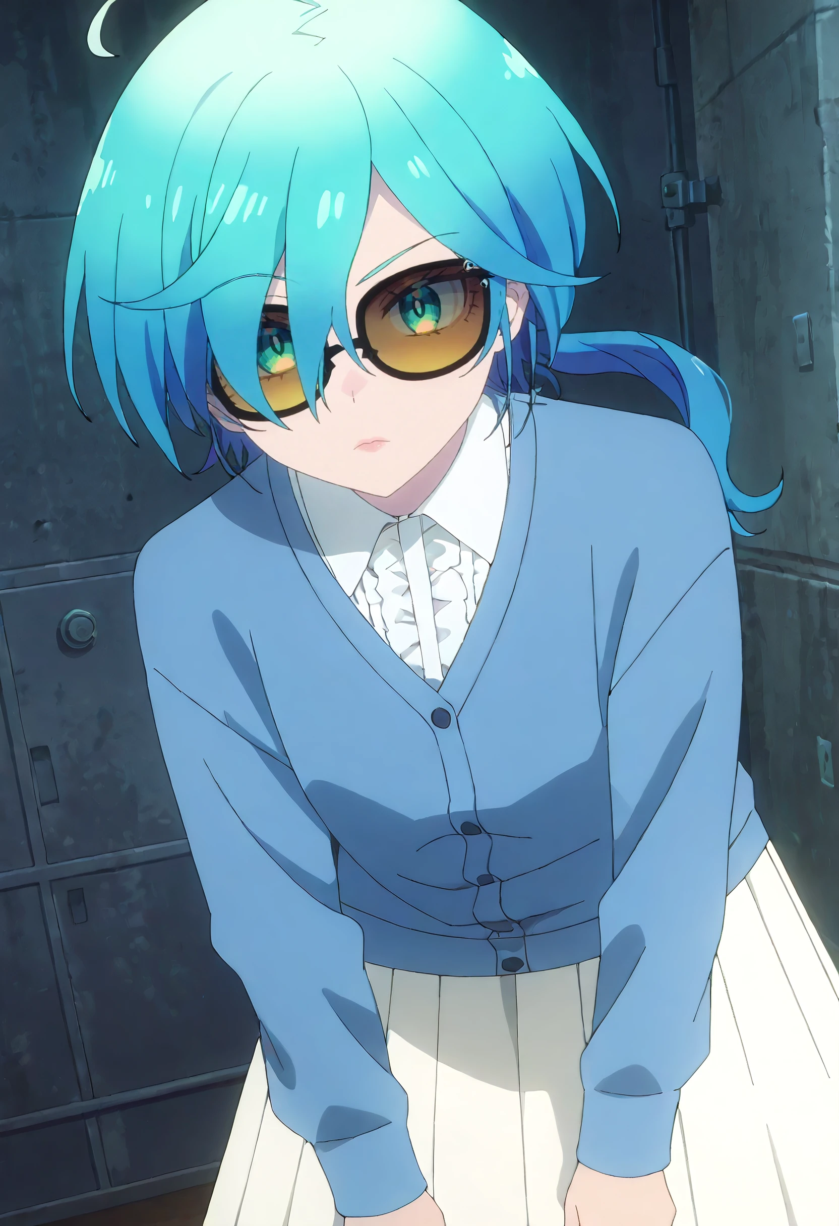 TinaSchoolB, sunglasses, white shirt, collared shirt, hair over one eye, blue cardigan, long sleeves, white skirt, pleated skirt, buttons, center frills, long skirt, black-framed eyewear, yellow-tinted eyewear, frilled shirt, tinted eyewear,