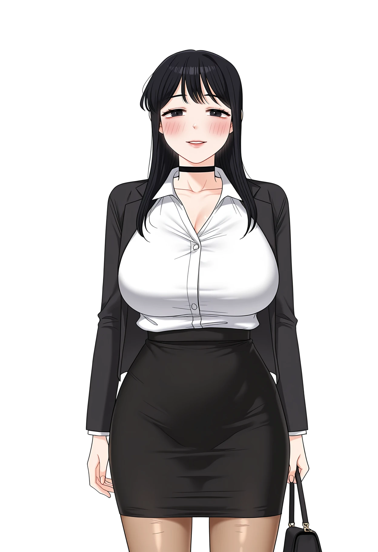 outfit4, black jacket, open jacket, black choker, white shirt, dress shirt, collared shirt, shirt tucked in, black skirt, pencil skirt, high-waist skirt, long sleeves, brown pantyhose, black footwear, high heels, collarbone, open clothes, handbag, holding bag,
