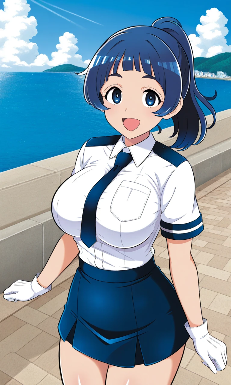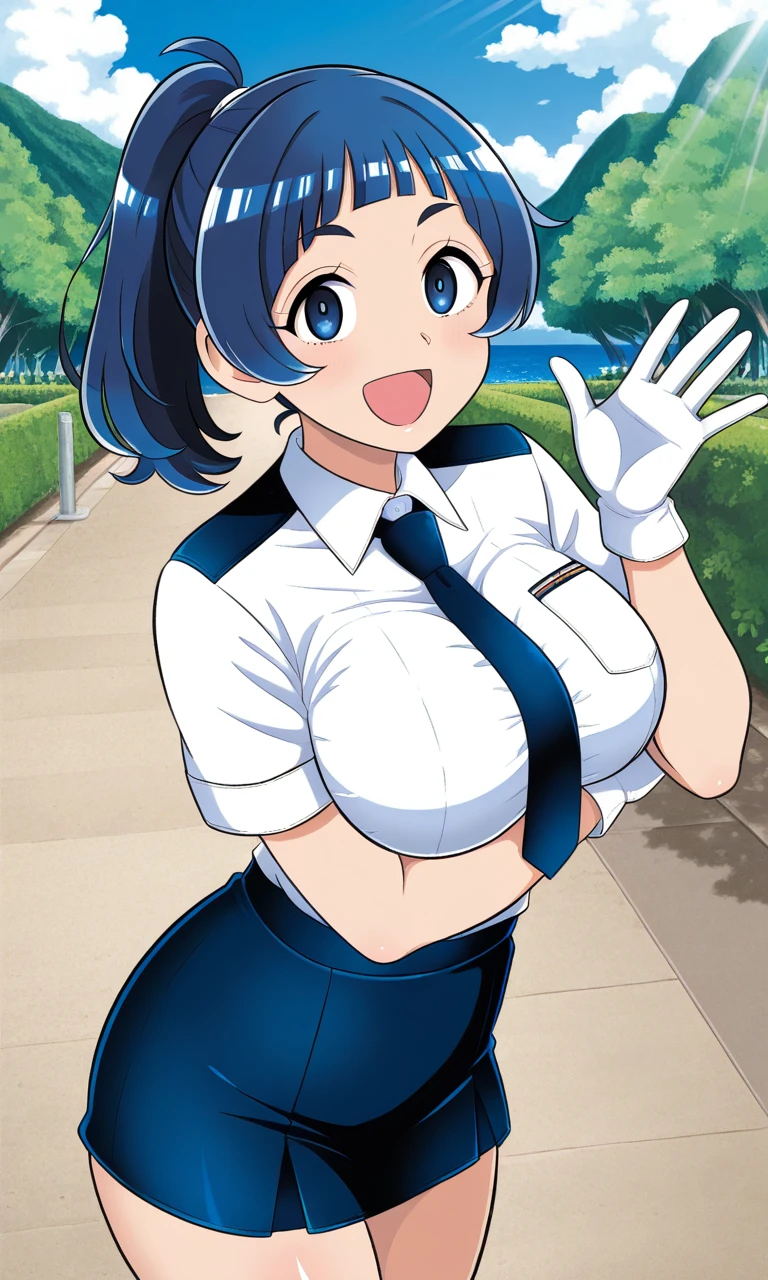 ponko,ponytail,blue eyes,blue hair,white shirt,navy tie,navy mini skirt,large breasts,white glove