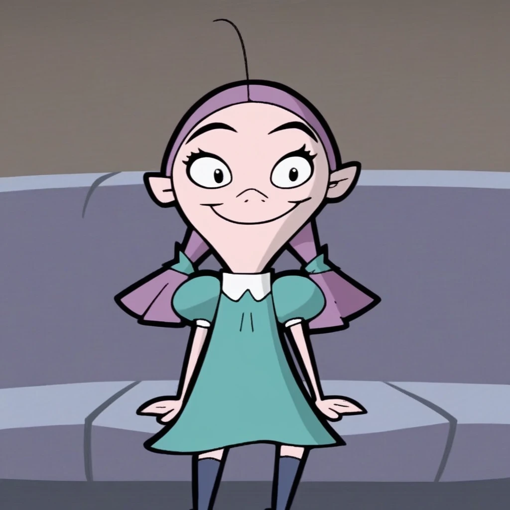 franduck, 1girl, purple hair, twintails, ahoge, dress, puffy sleeves