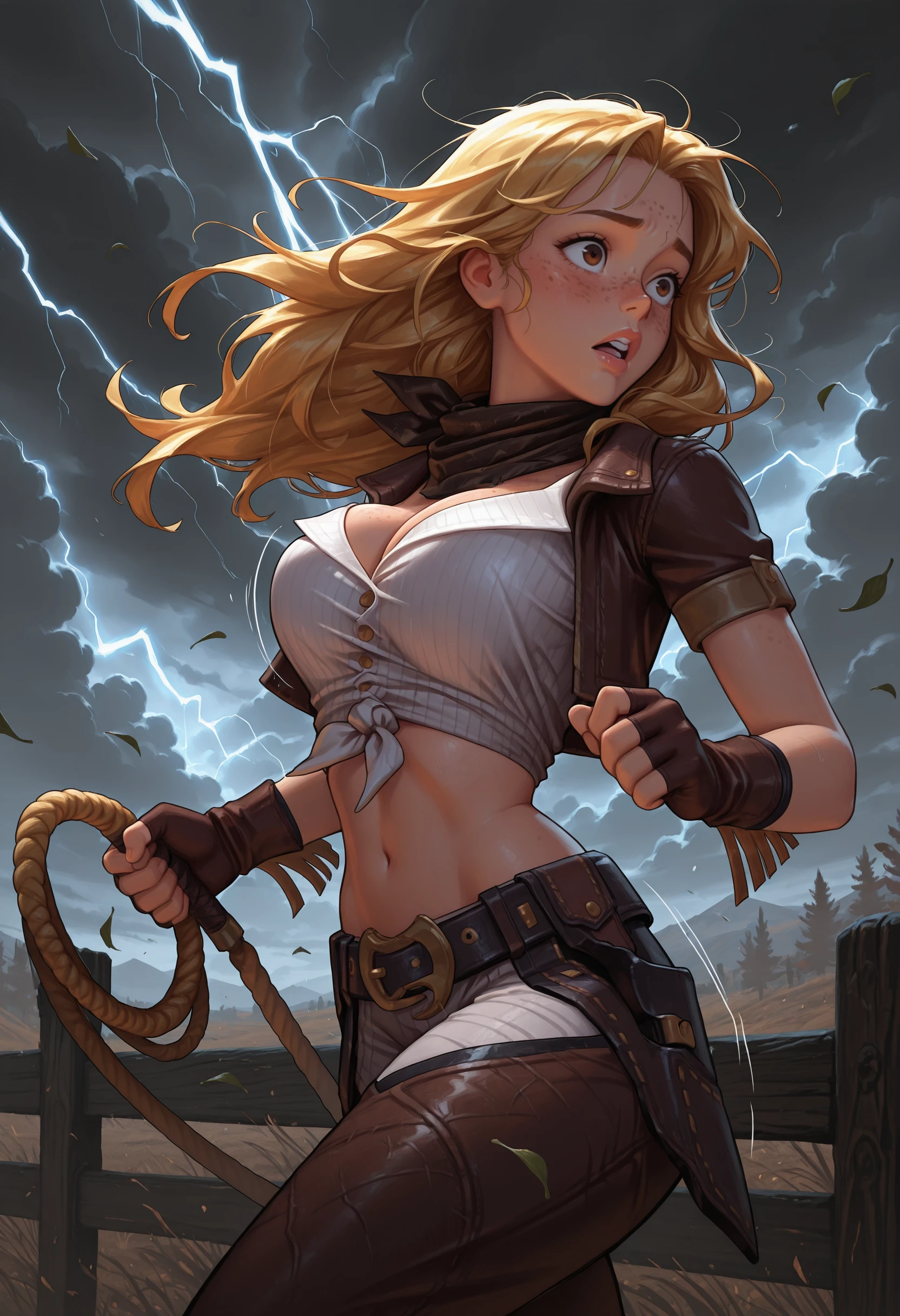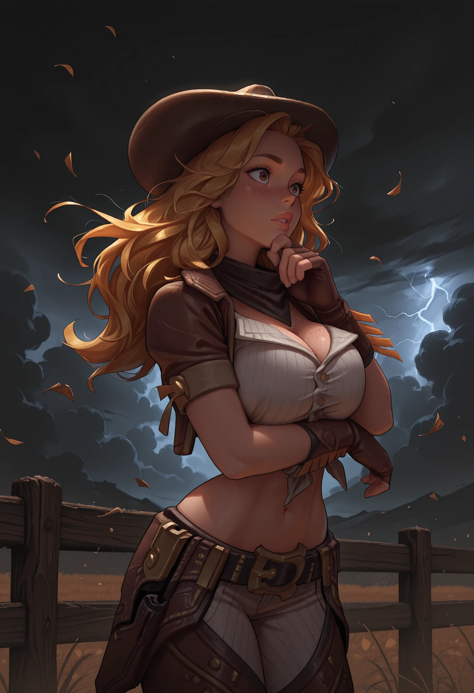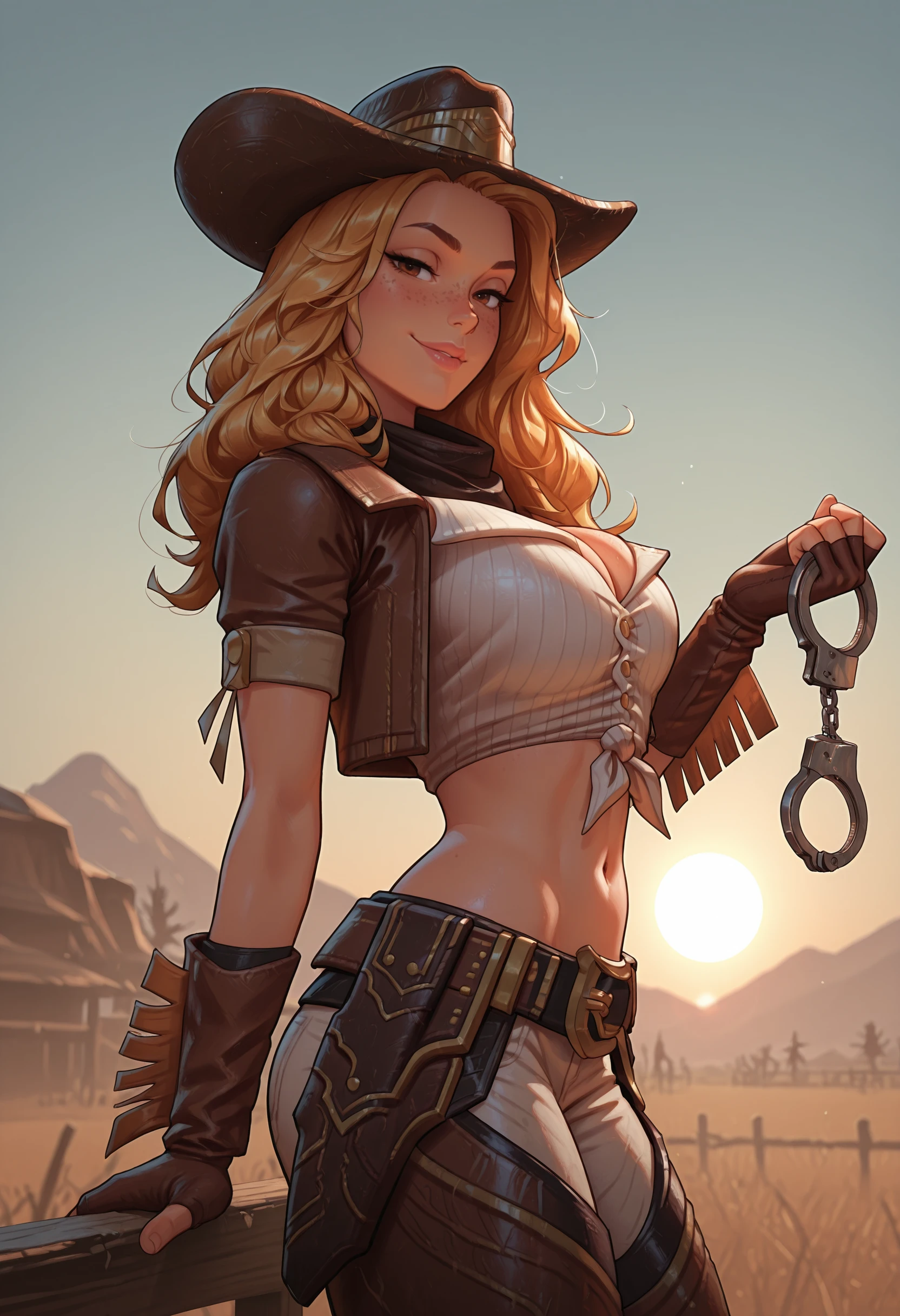 cgmfil, large breasts, long hair, brown eyes, blonde hair, lips, freckles, navel, pants, belt, midriff, fingerless gloves, crop top, brown gloves, cowboy hat, chaps, cowboy western, cowboy boots, belt buckle, tied shirt, holster, fringe trim, short sleeves, open jacket, cropped jacket,