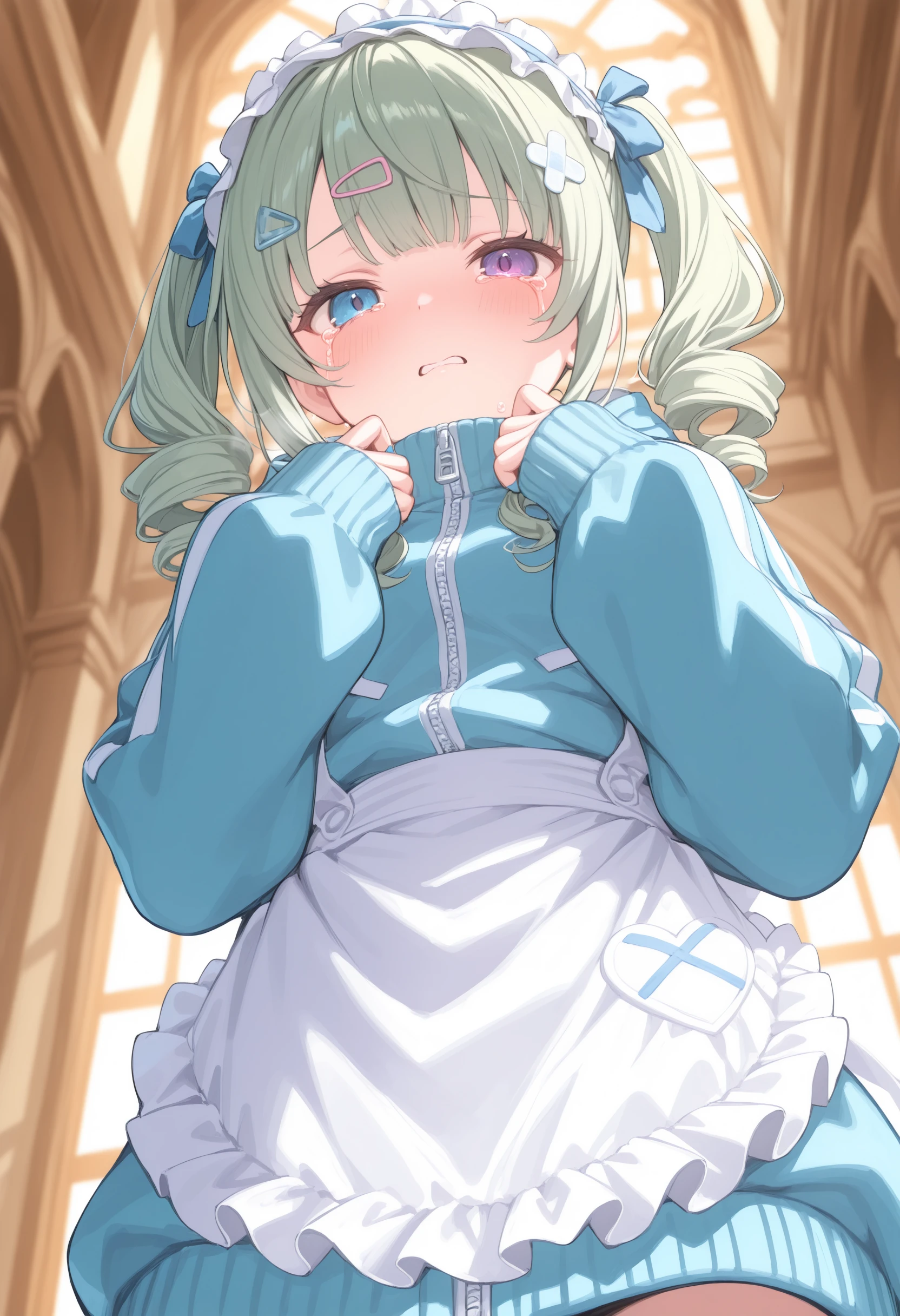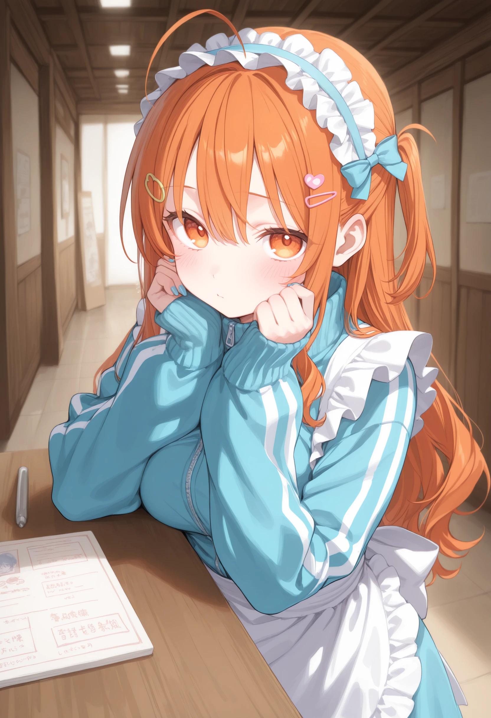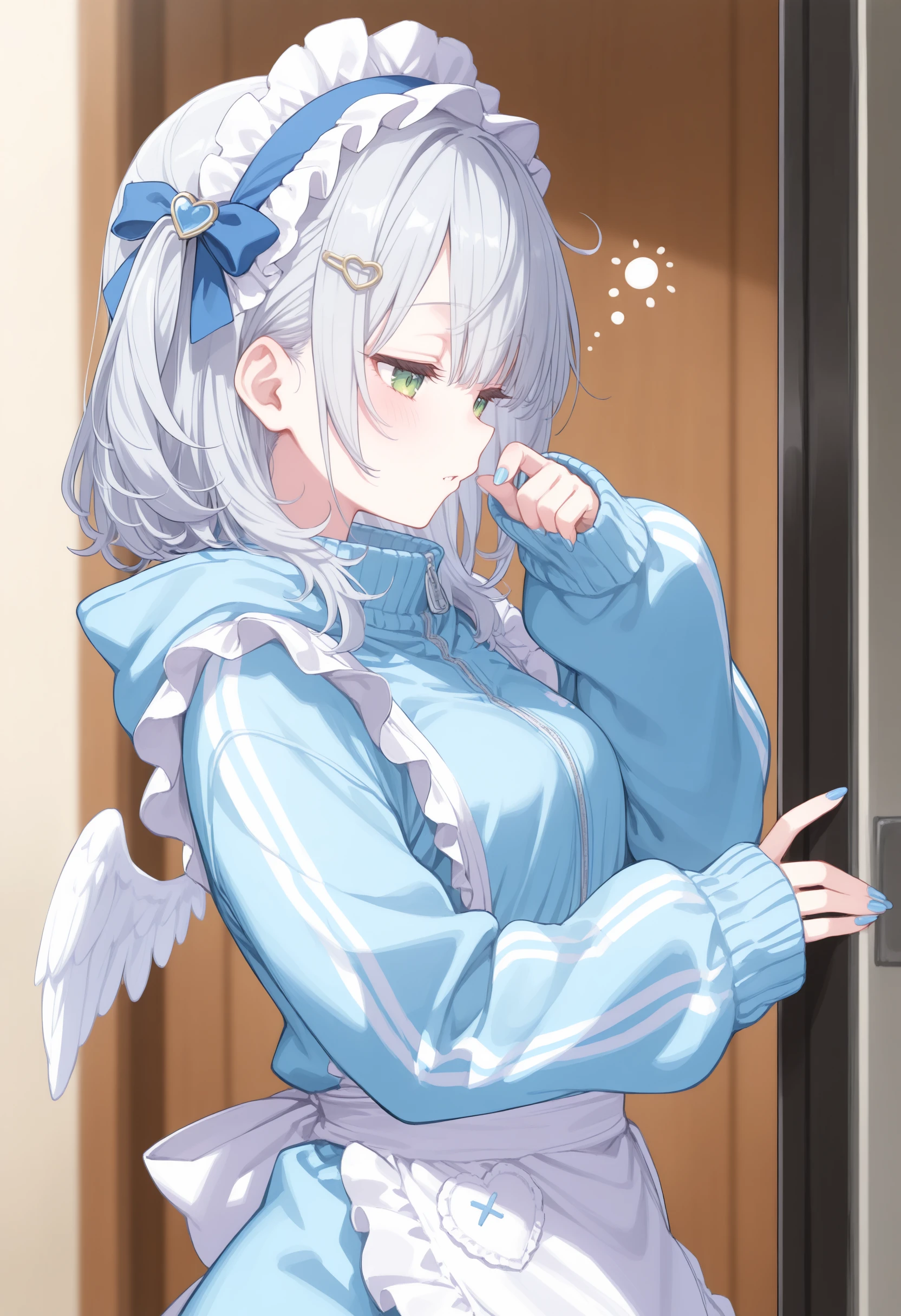 天使のような無垢さを表現しているファッションの服を着せるLoRAです。水色のジャージ素材のパーカーにアームウォーマーやレッグウォーマーなどコーディネートする事が多いです。