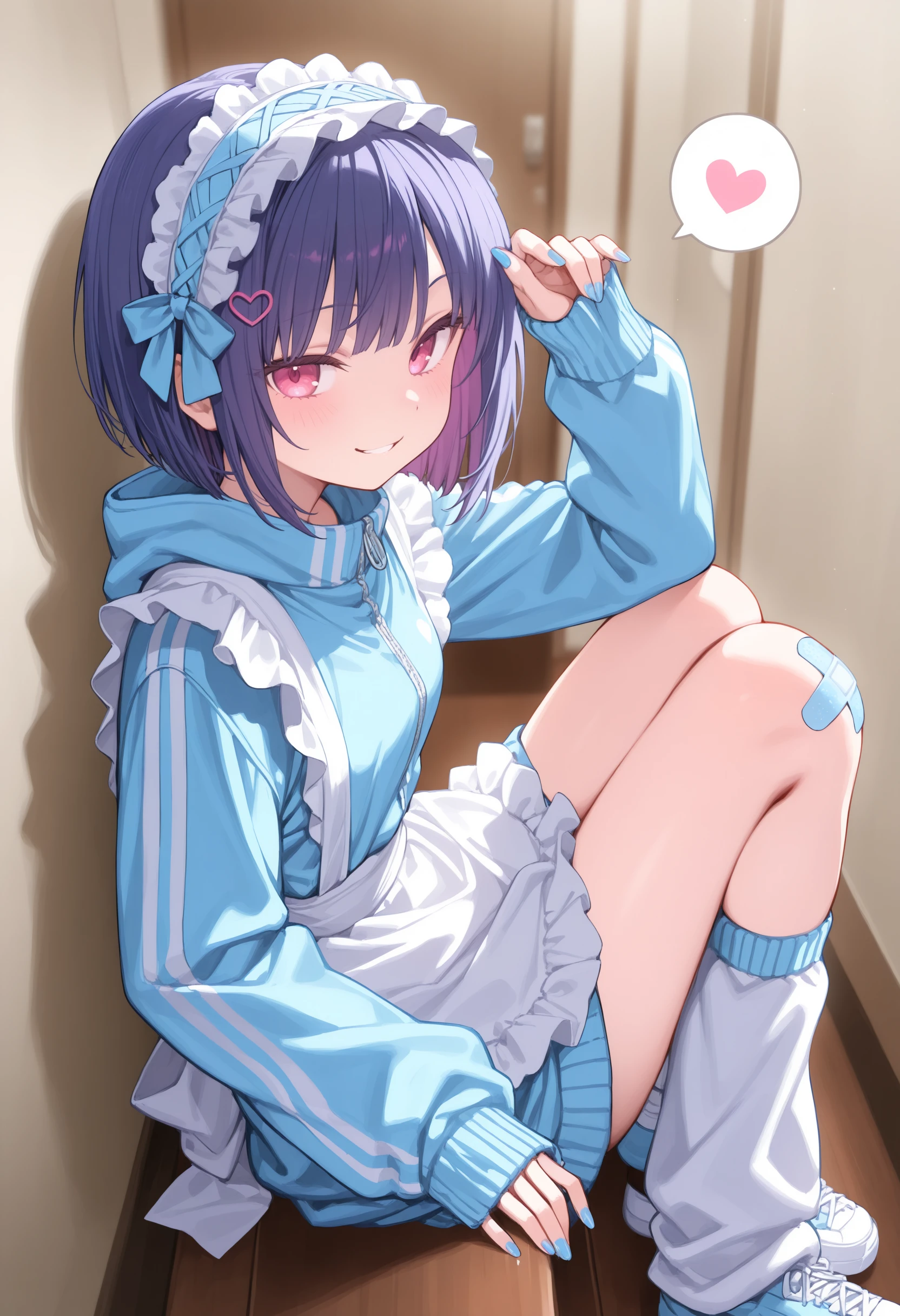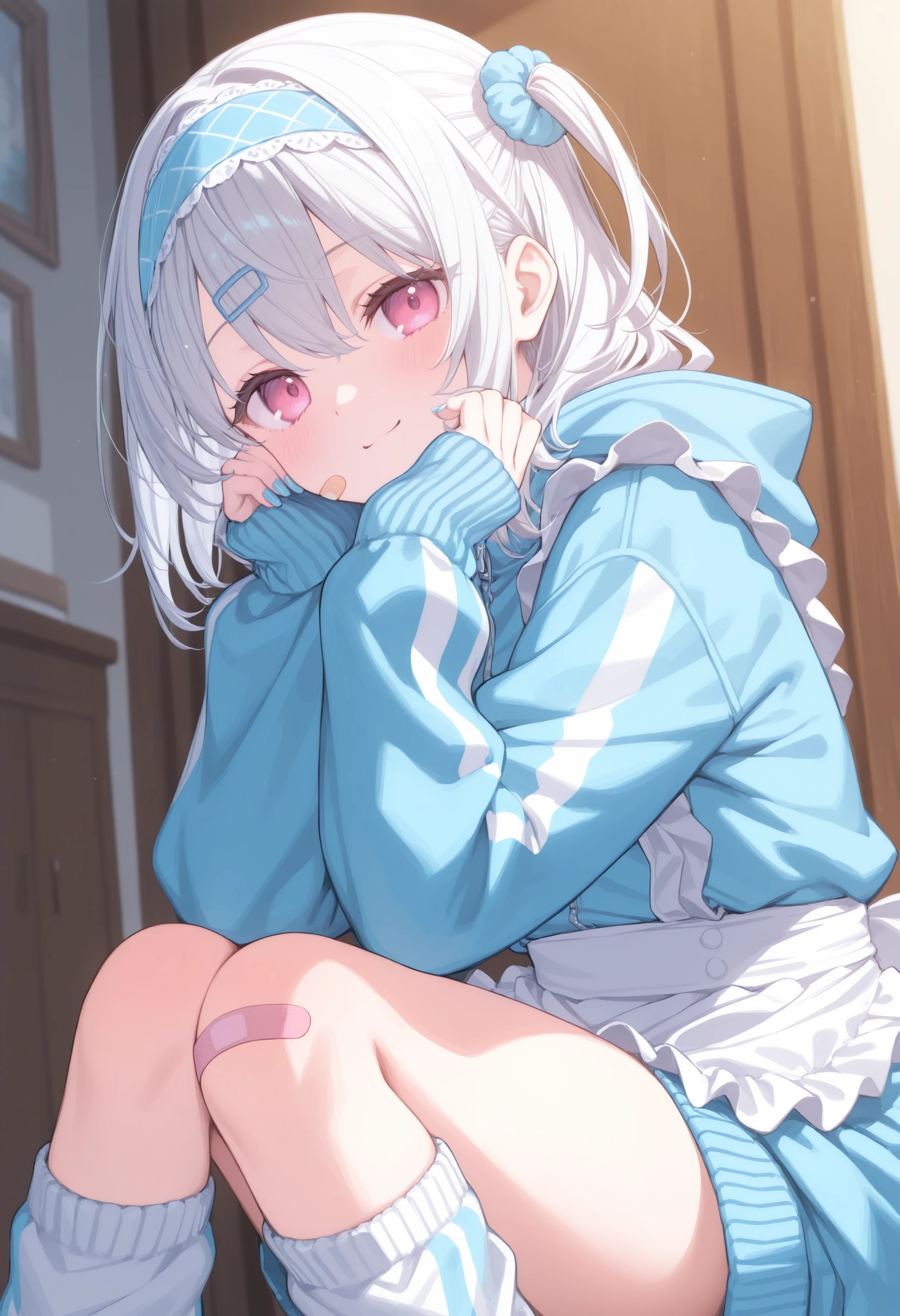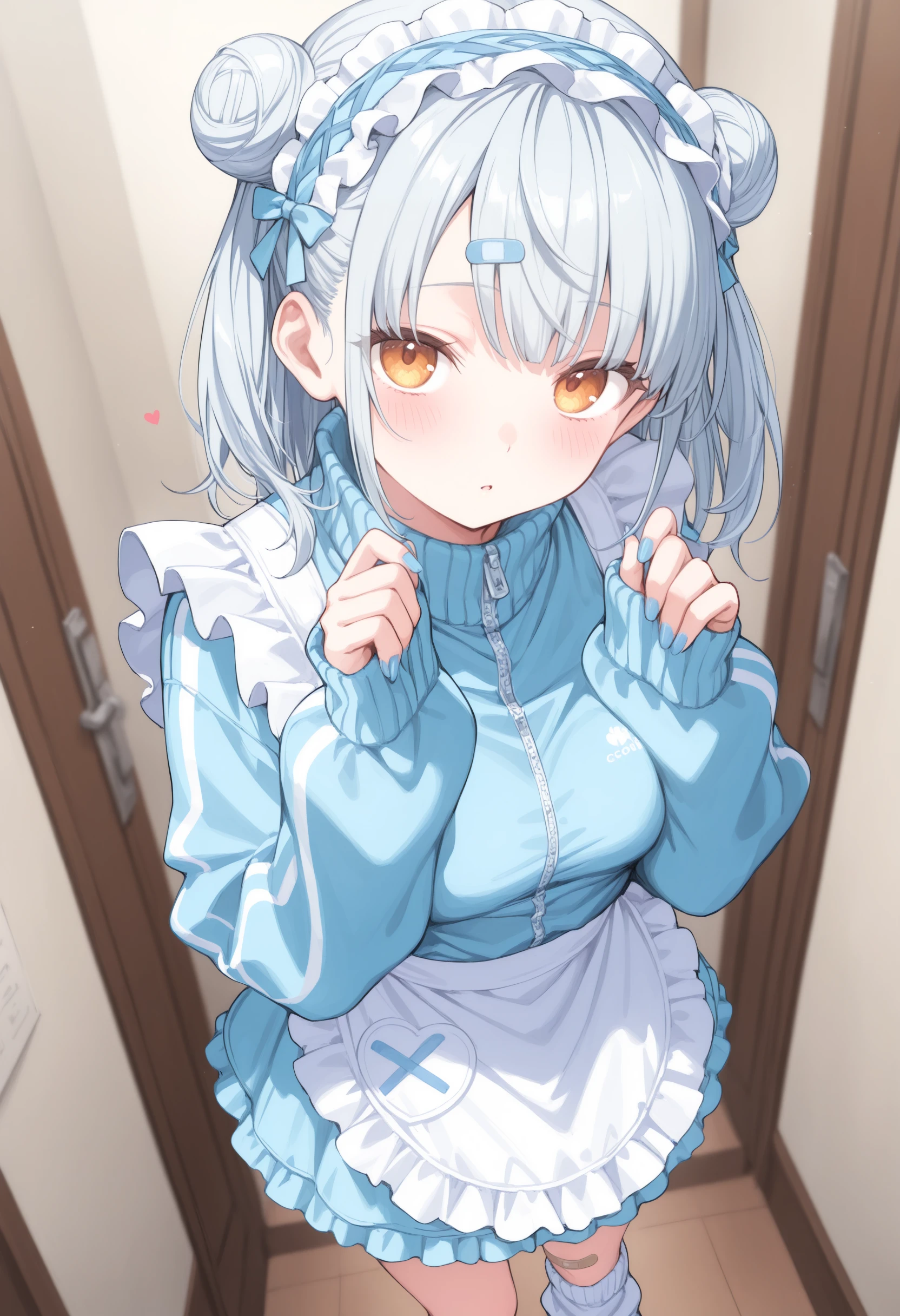 There is no specific clothing for this. long sleeves,hair ornament,blue jacket,frills,frilled hairband,track jacket,sleeves past wrists,blue nails,hairband, zipper,blue bow,bandaid zipper,blue bow,bandaid,waist apron ,hoodie,leg warmers,lolita hairband,detached sleeves,wide sleeves