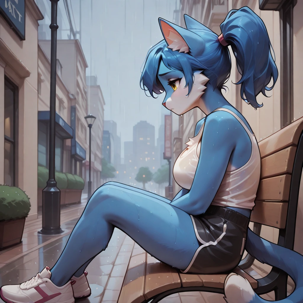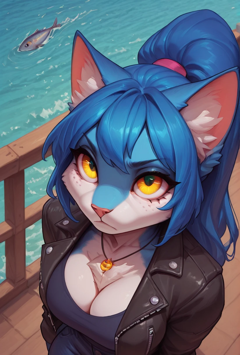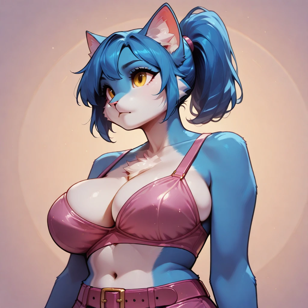 Creates an anthro cat with blue fur, yellow eyes and a blue ponytail.