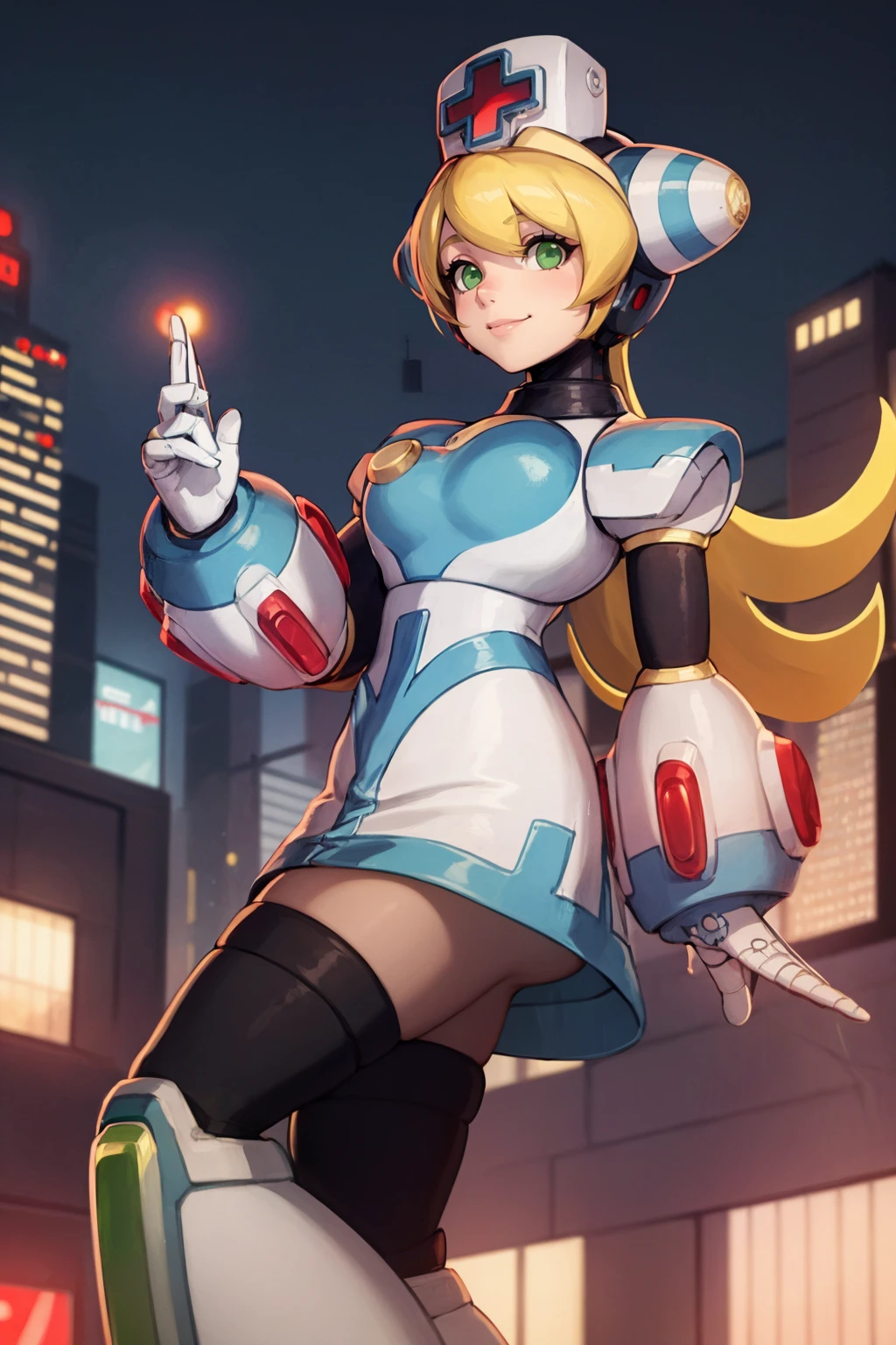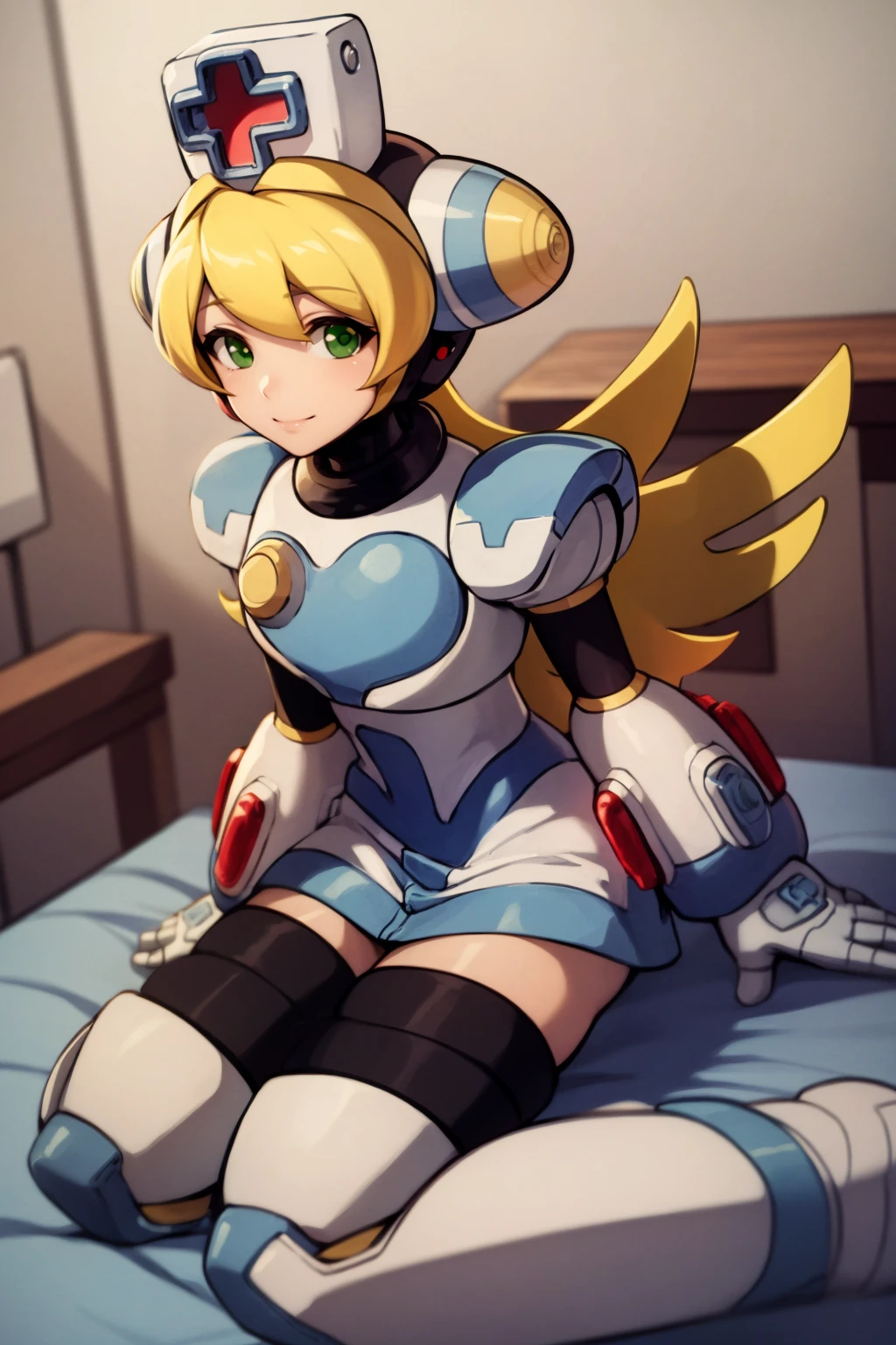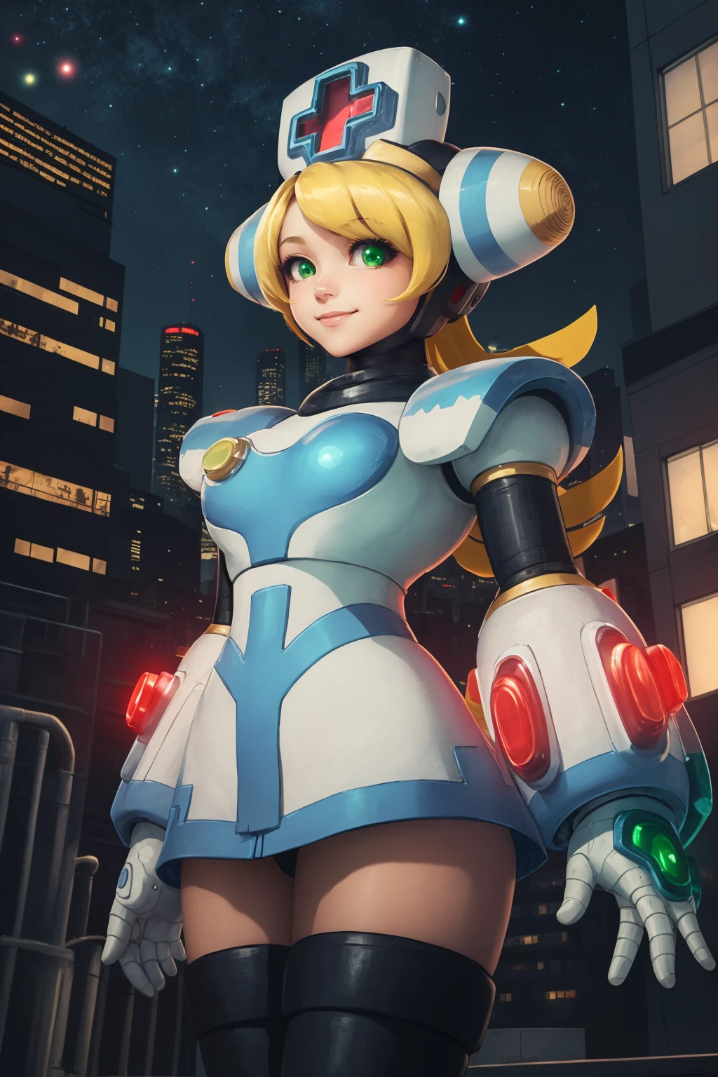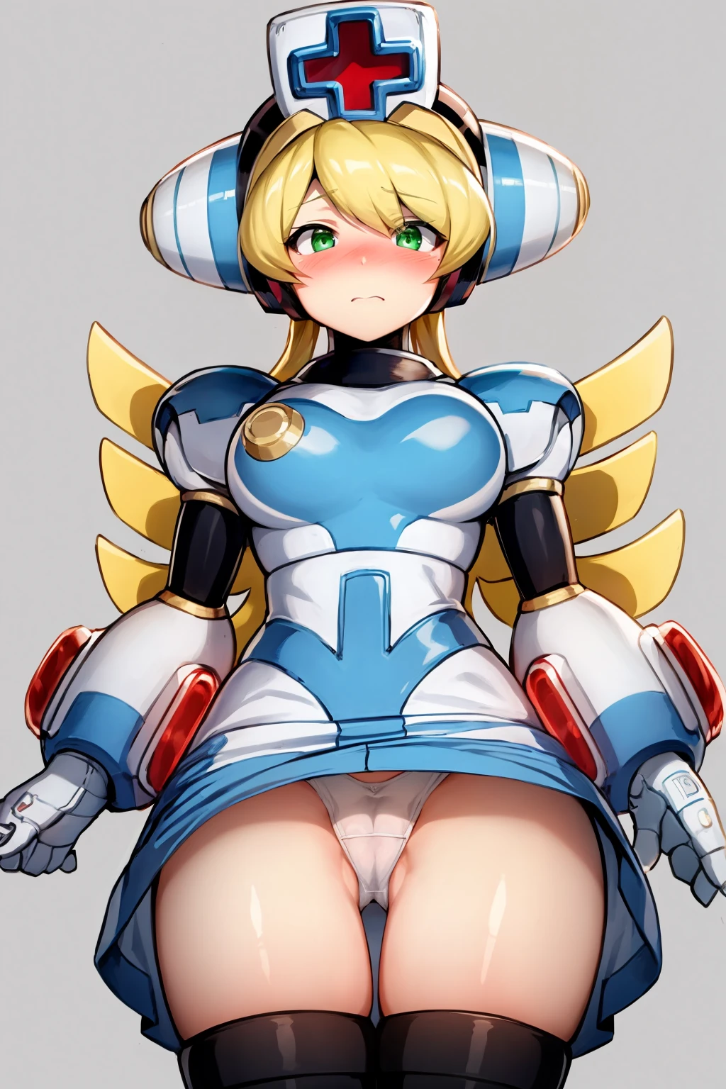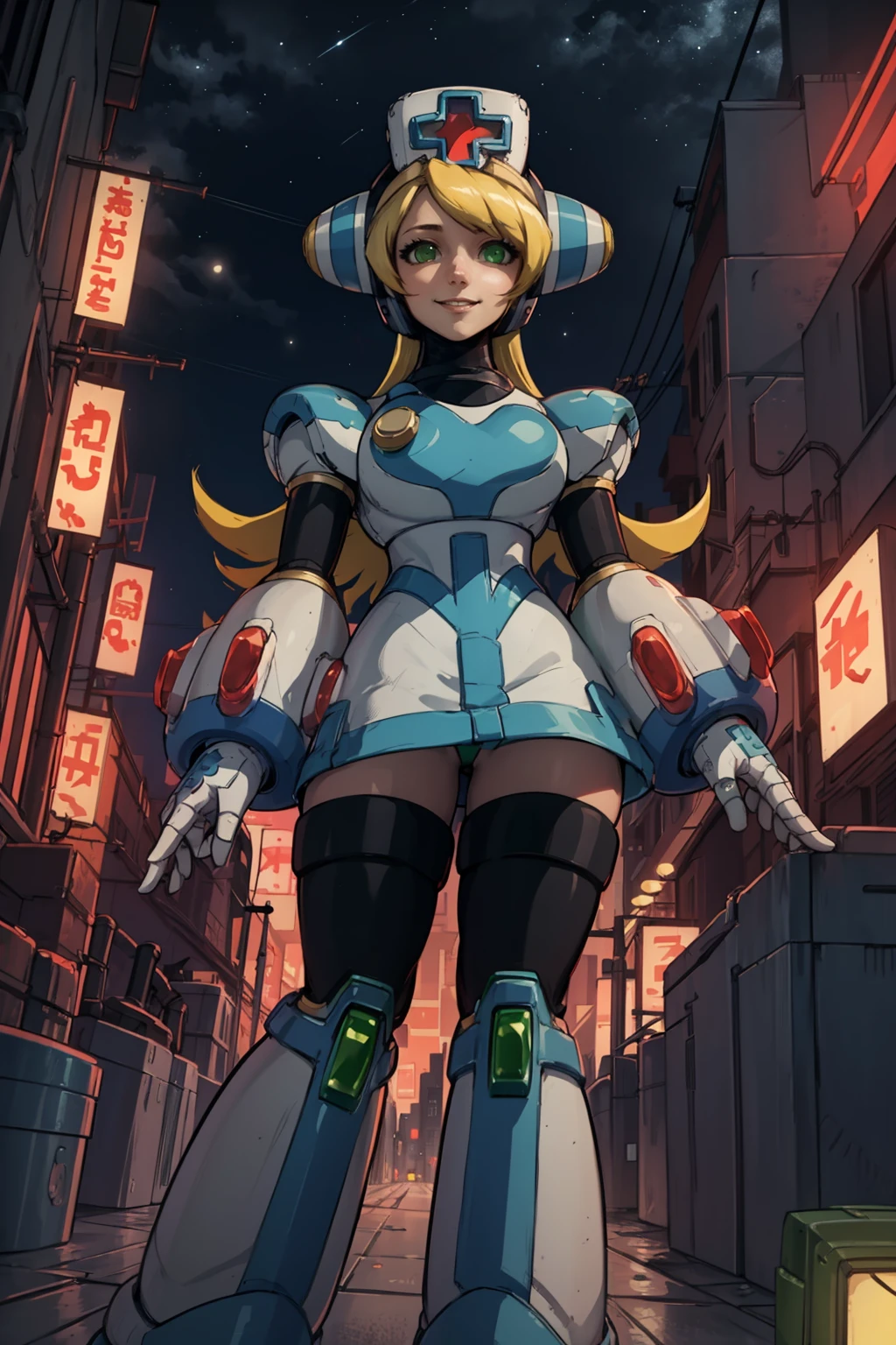 Basic prompts : 1girl, blonde hair, green eyes, long hair, nurse, nurse cap, android, robot, thighhighs