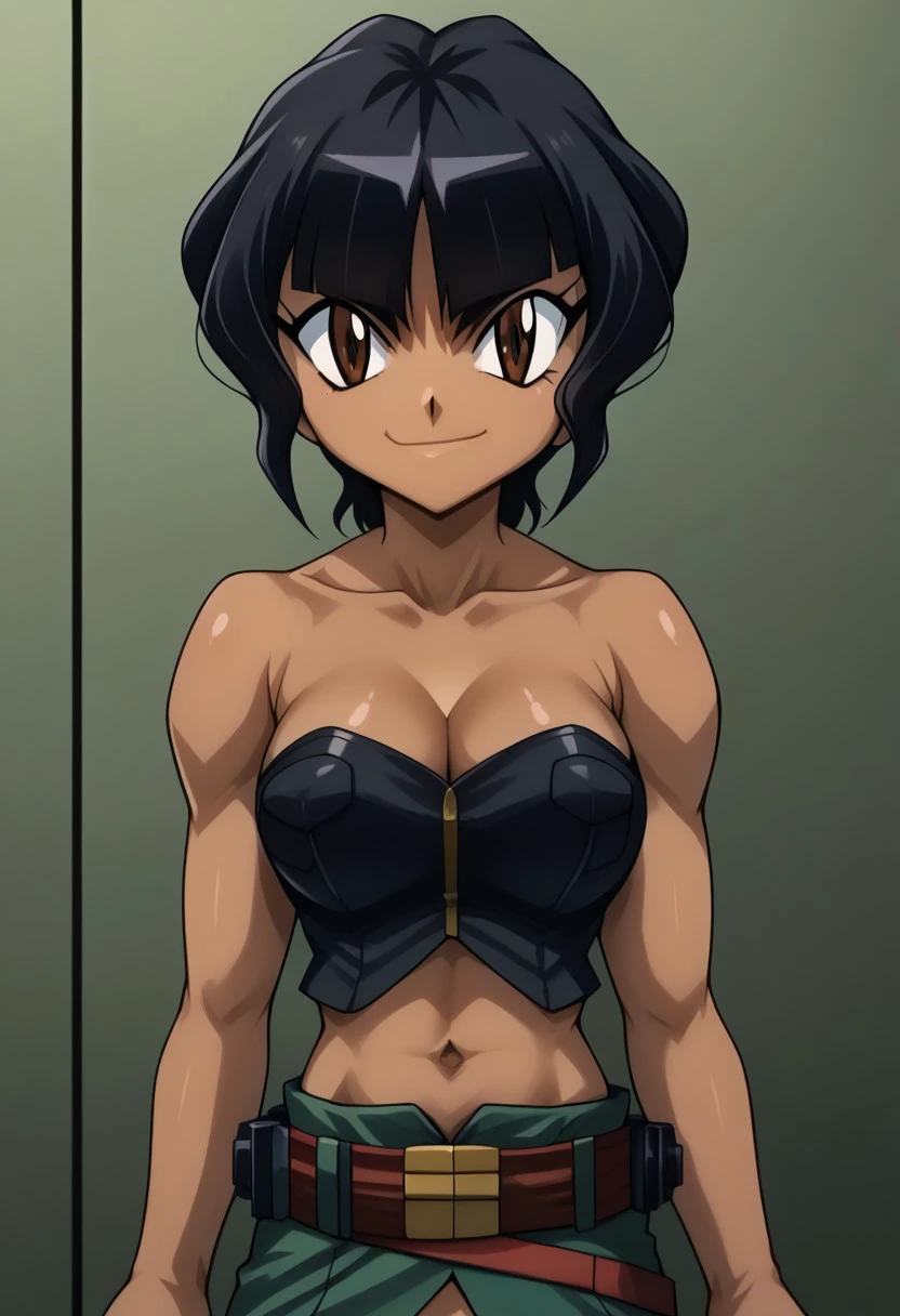 beyblade metal masters,selen garcia,outdoors,anime,1girl,breasts,solo,brown eyes,dark-skinned female,black hair,dark skin,cleavage,navel, scoffing face,large breasts,midriff,looking at viewer,short hair,collarbone,shiny,belt,green pants,strapless,bare shoulders,crop top,shiny skin,bangs,tube top,bustier,upper body,stomach,garter straps,sleeveless
