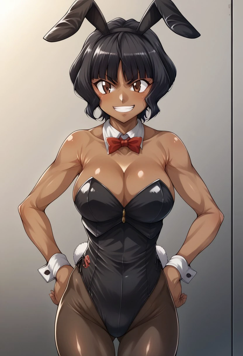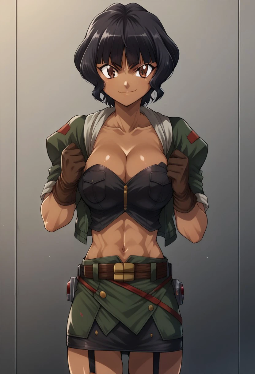 beyblade metal masters, selen garcia,outdoors,anime,1girl,scoffing face,breasts,solo,black hair,dark skin,large breasts,navel,dark-skinned female,cleavage,brown eyes,smile,midriff,looking at viewer,gloves,belt,jacket,short hair,black bra,garter straps