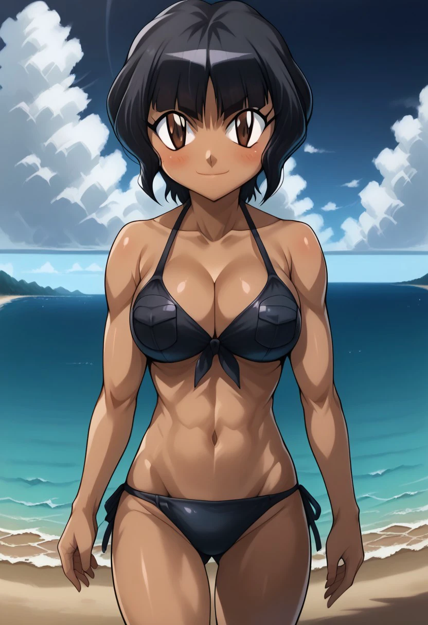 beyblade metal masters, selen garcia,outdoors,anime,1girl,swimsuit,bikini,breasts,dark skin,solo,dark-skinned female,black hair,black bikini,navel,short hair,brown eyes,beach,day,side-tie bikini bottom,smile,sky,cloud,ocean,collarbone,looking at viewer,cleavage,cowboy shot,blue sky,blush,closed mouth,large breasts,stomach,bare shoulder