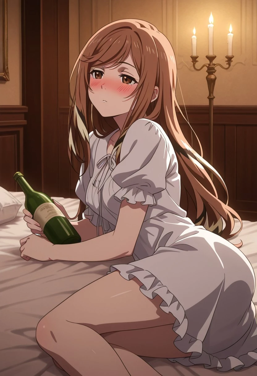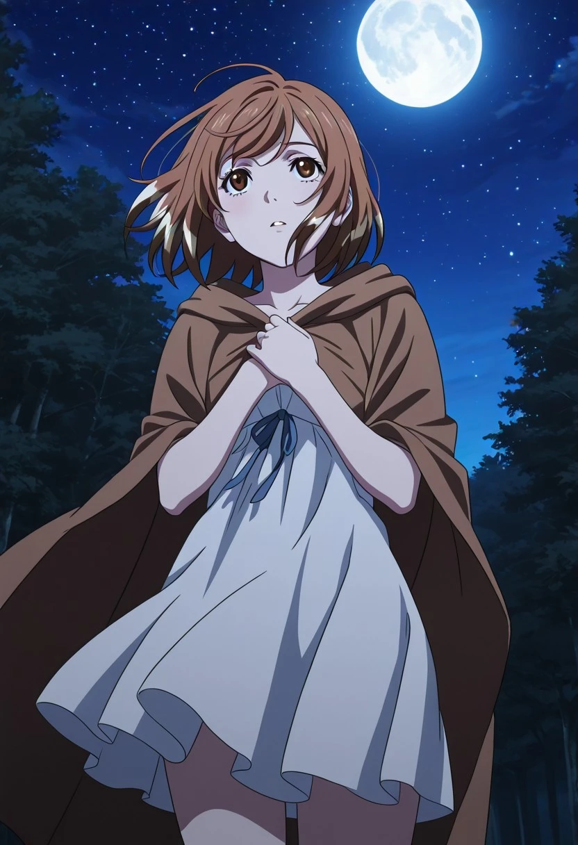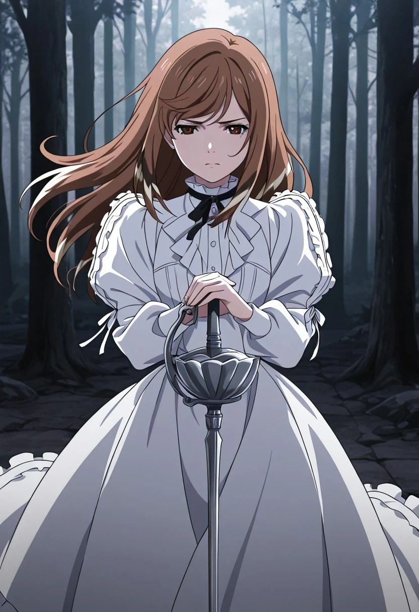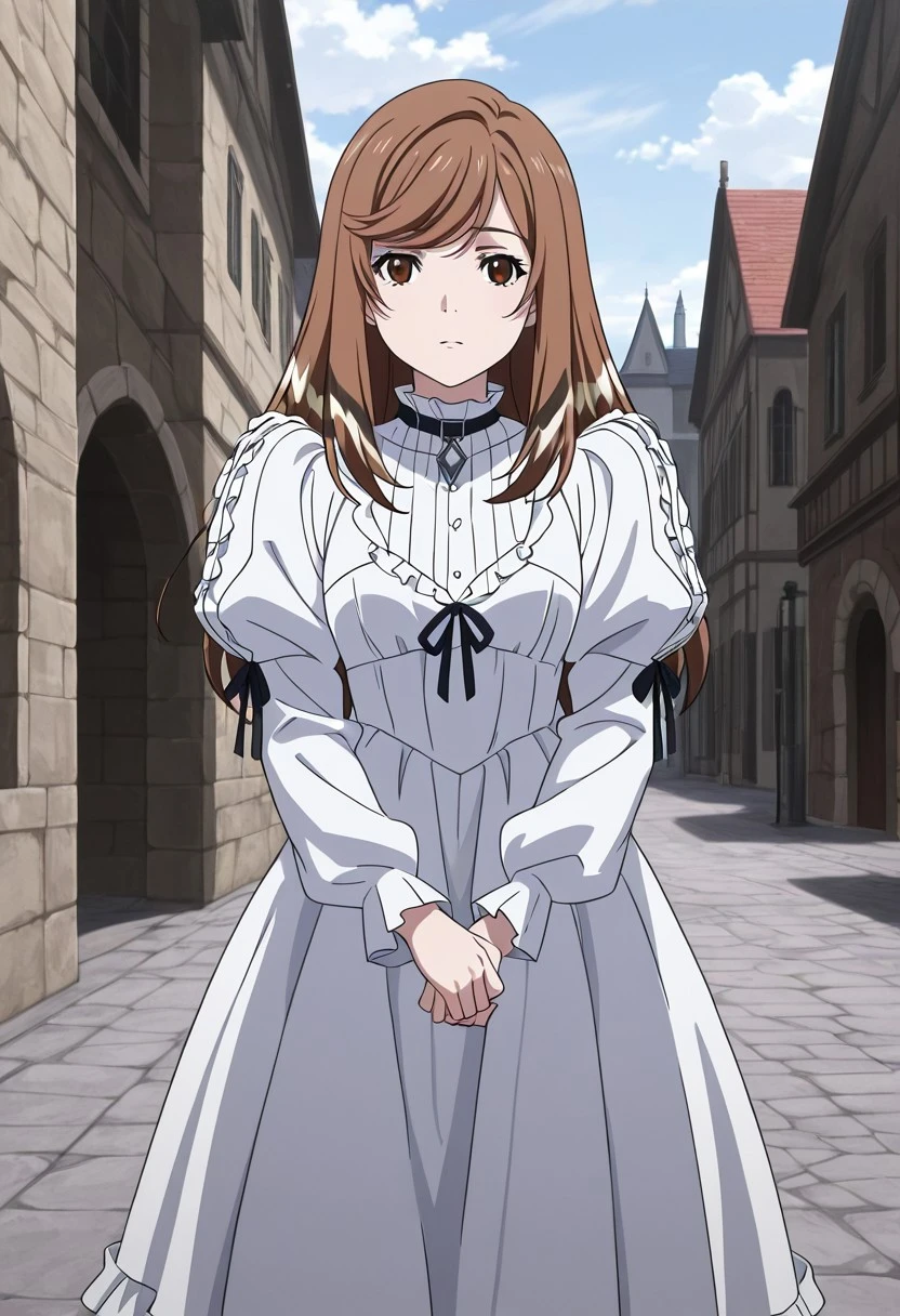 1 girl, solo, ShironByacornise, brown hair, brown eyes, long hair, multicolored hair, hair between eyes, long dress, white dress, long sheeves, frills, high white boots, ribbons