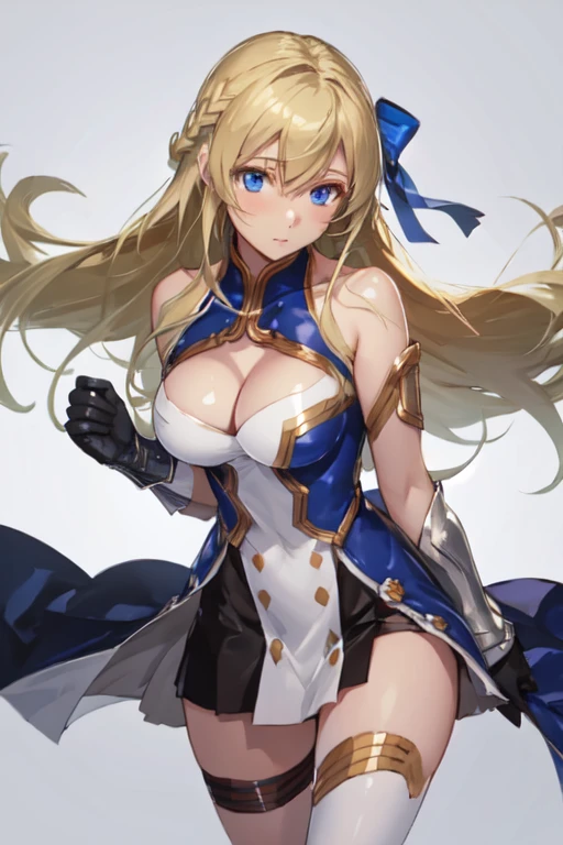 JeanneKaguyadArc, 1girl, solo, long hair, blue eyes, blonde hair, braid, single thighhigh, white thighhigh, black gloves, dress, cleavage, bare shoulders, medium breasts, hair ribbon, cleavage cutout, armor,