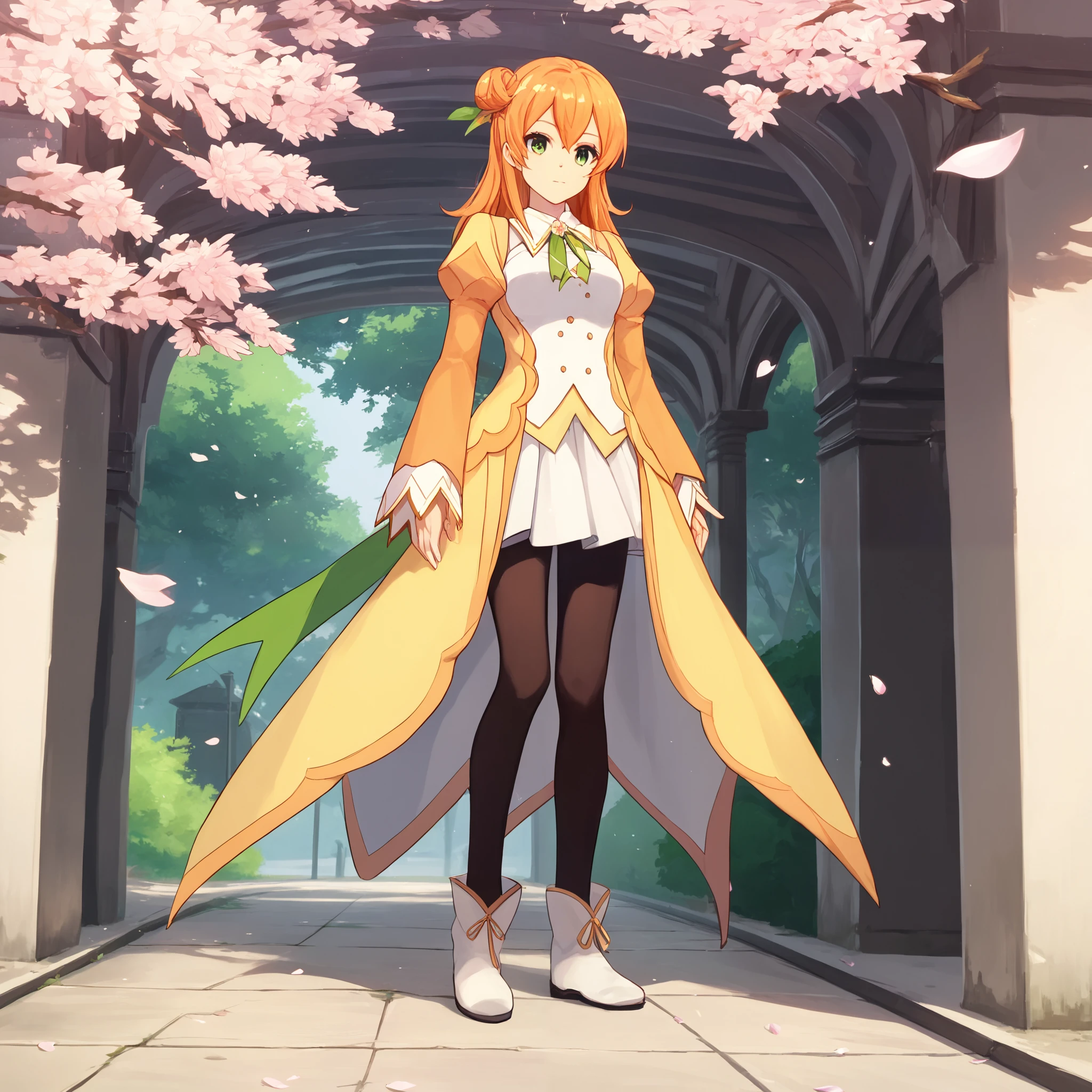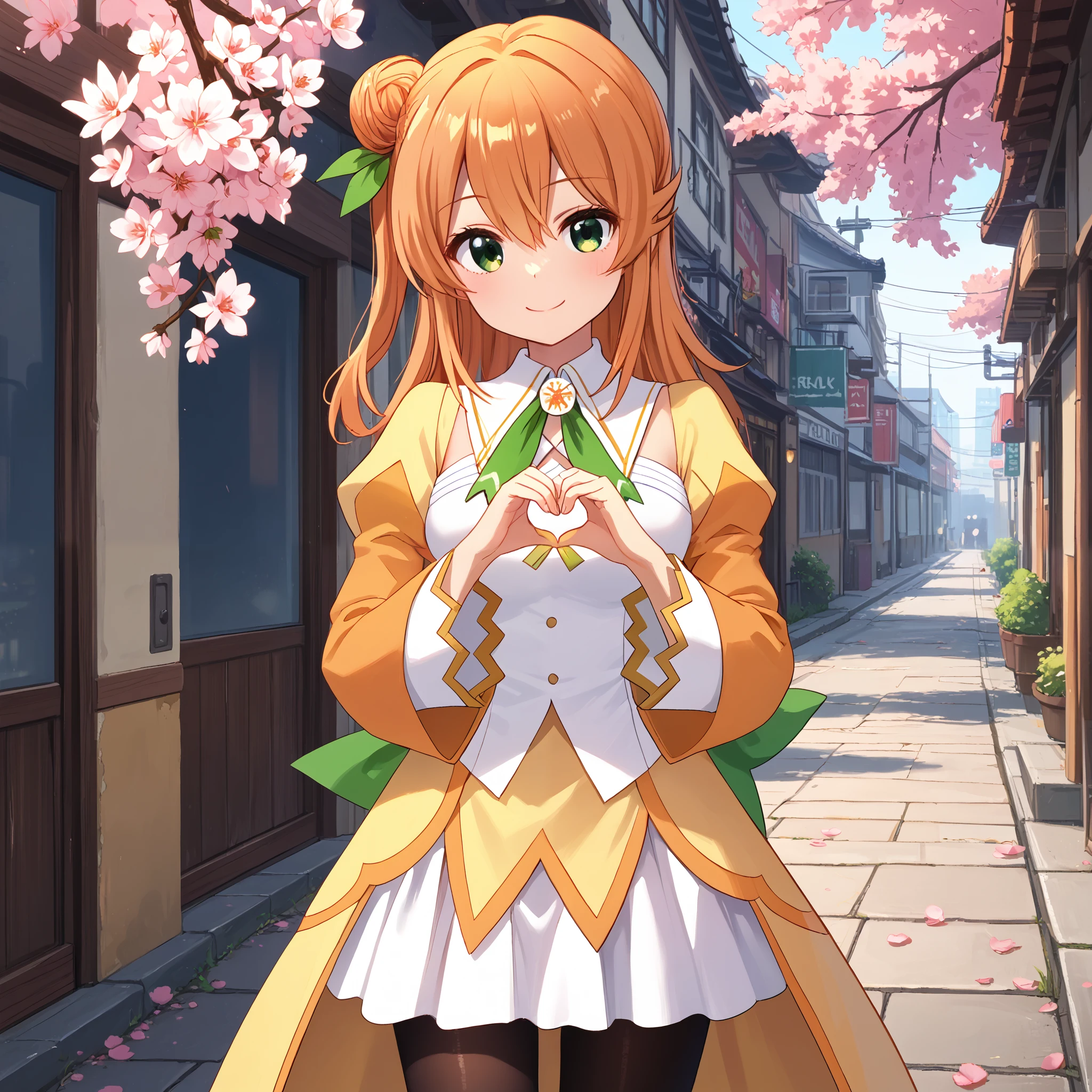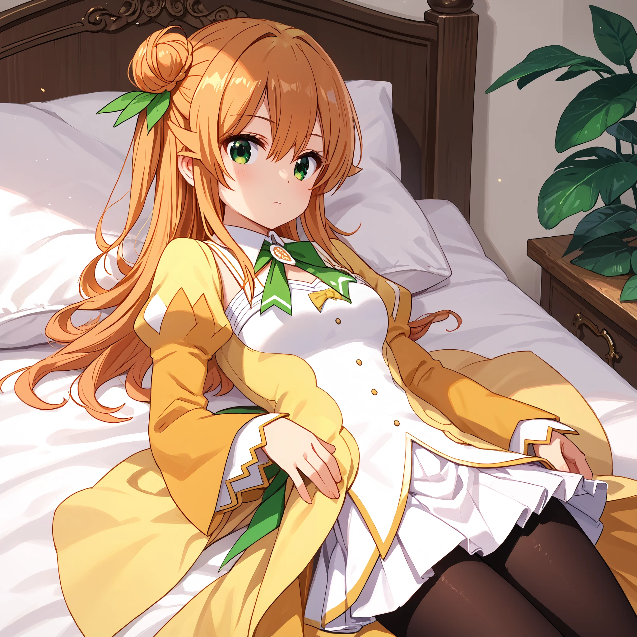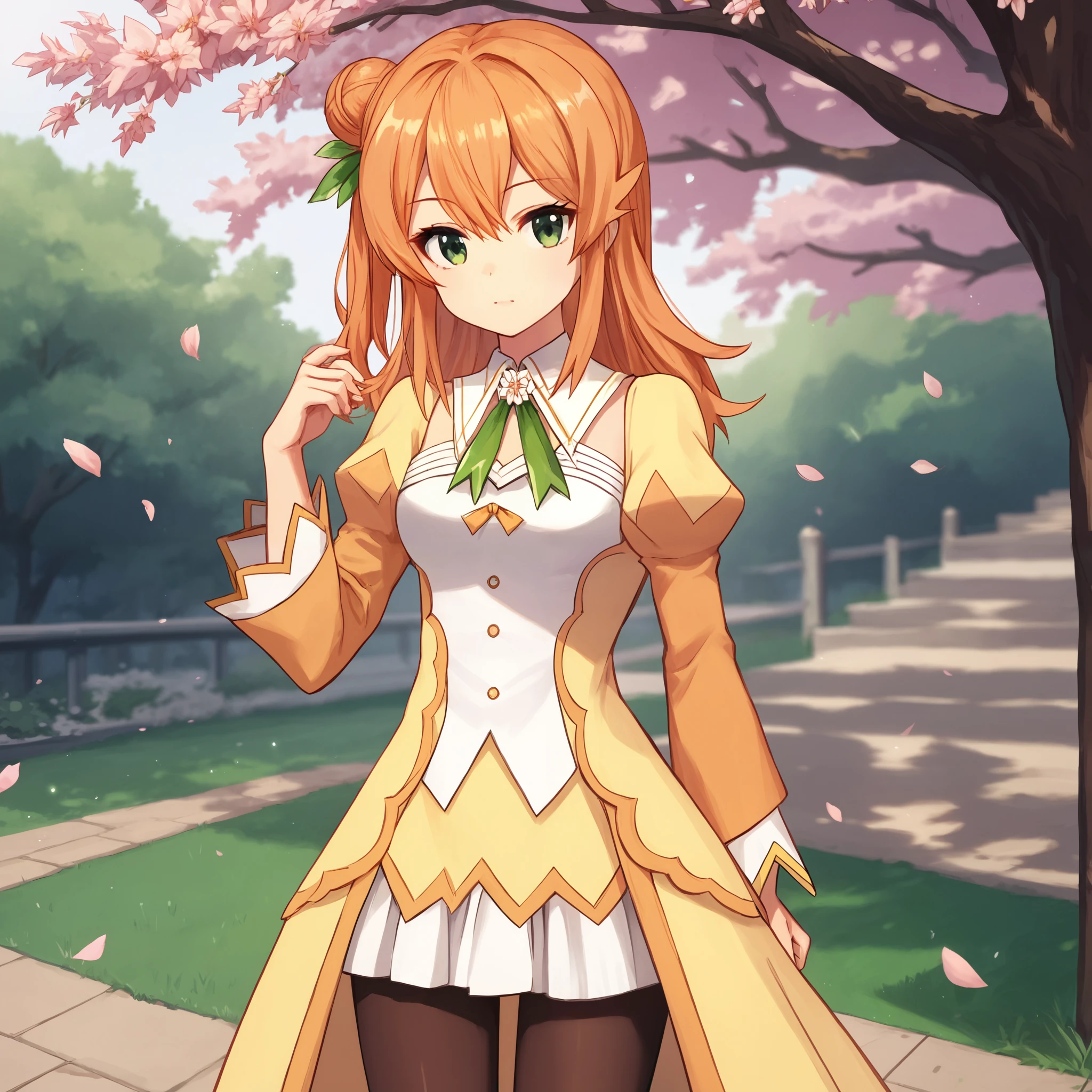 Magical Girl Uniform : hinatsuki mikan, single hair bun, long hair, orange hair, green eyes, magical girl, leaf hair ornament, long sleeves, neck ribbon, yellow dress, green bow, juliet sleeves, white skirt, waist cape, miniskirt, black pantyhose,Description