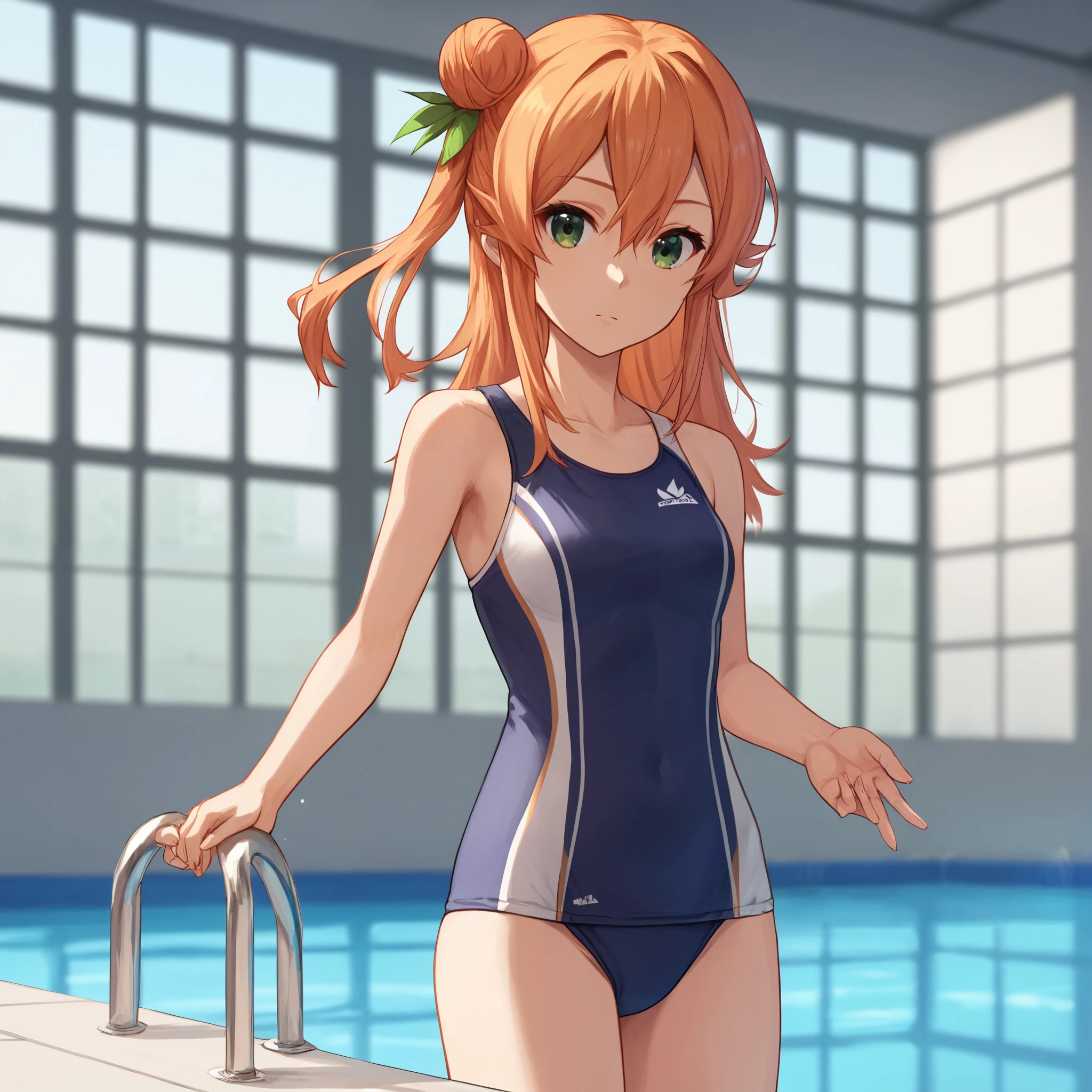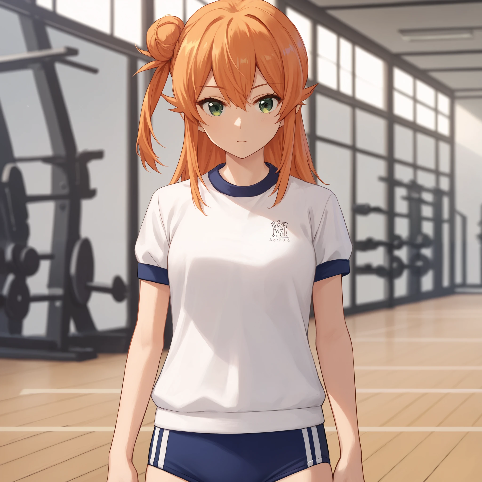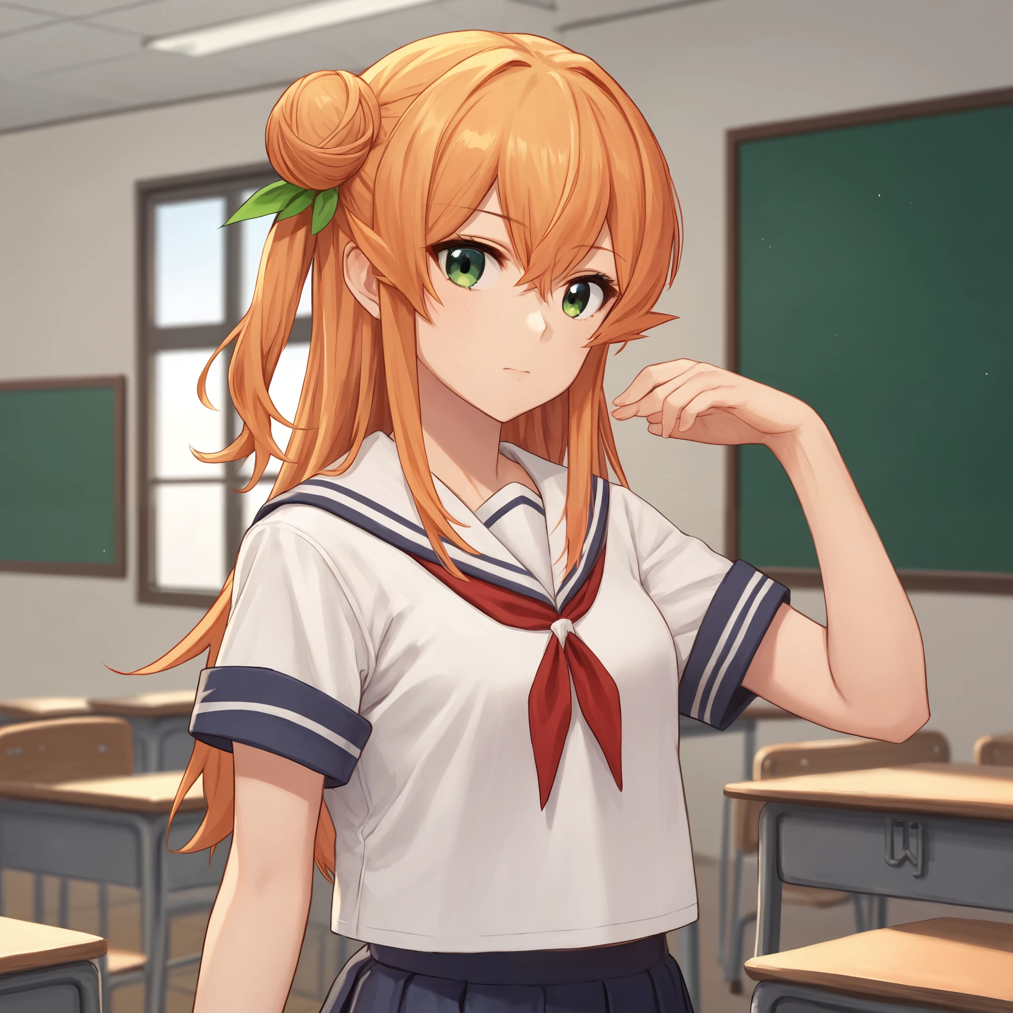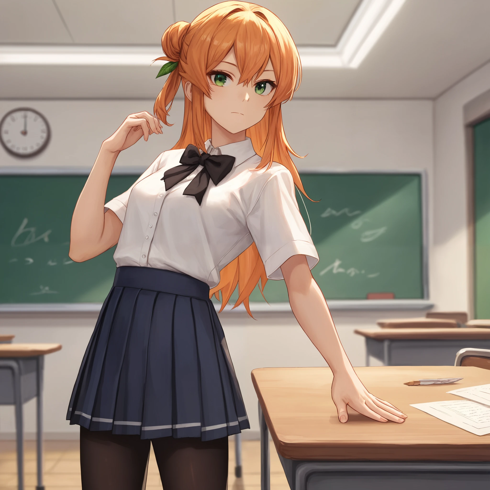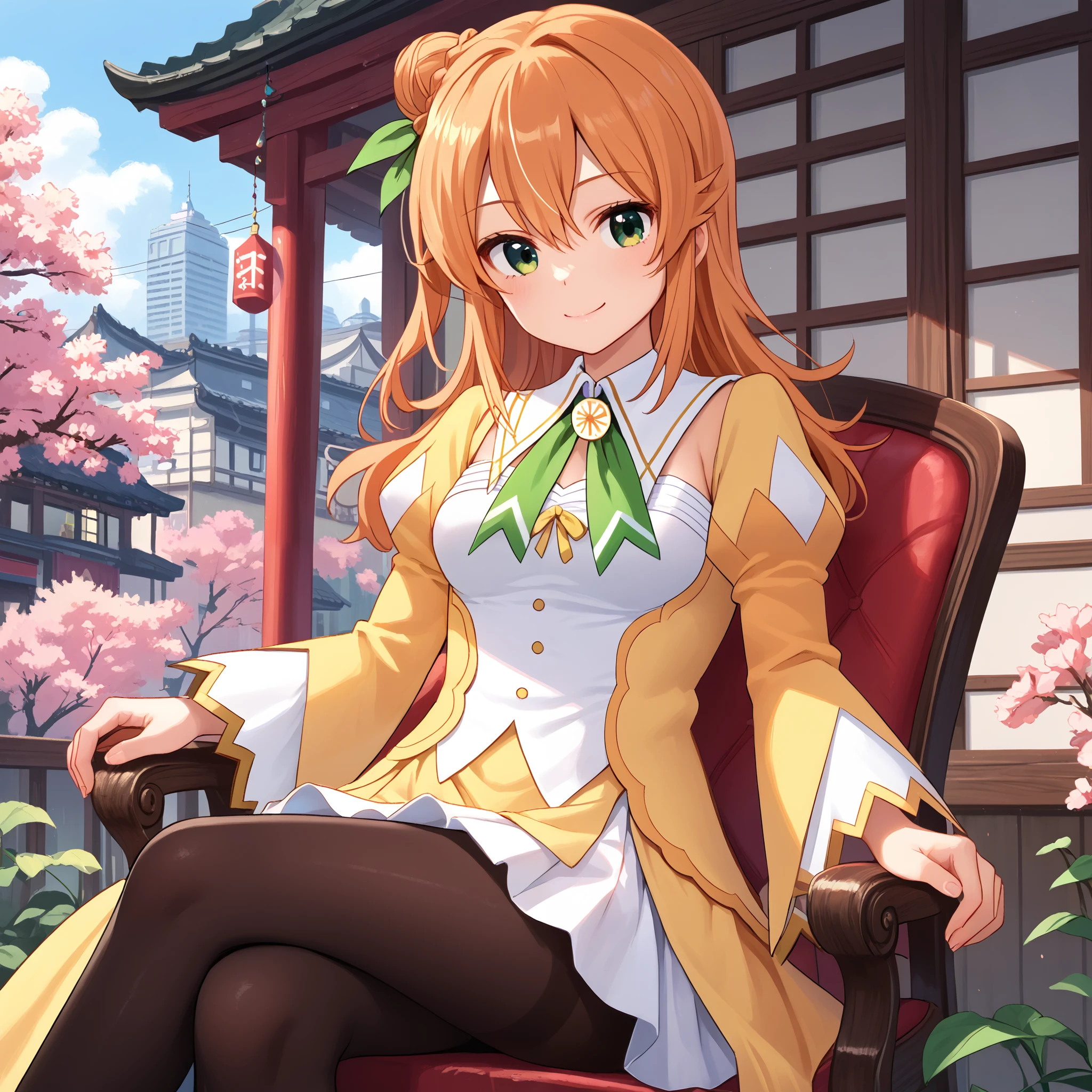 Magical Girl Uniform : hinatsuki mikan, single hair bun, long hair, orange hair, green eyes, magical girl, leaf hair ornament, long sleeves, neck ribbon, yellow dress, green bow, juliet sleeves, white skirt, waist cape, miniskirt, black pantyhose,Description