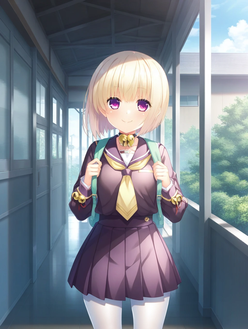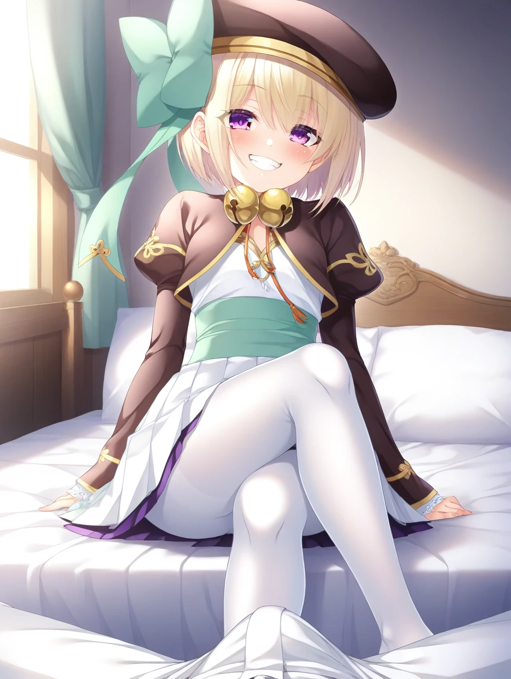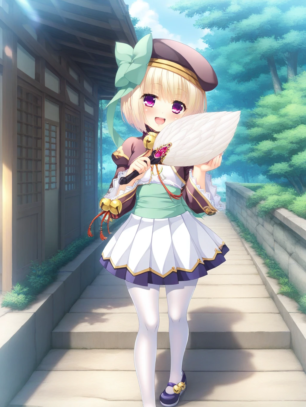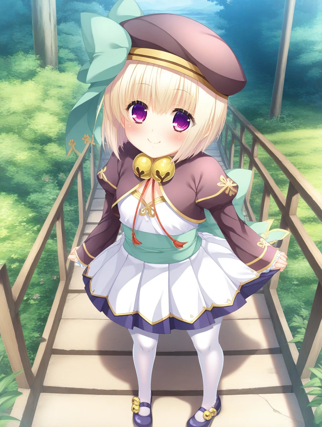 1girl,blonde hair,hat,solo,mary janes,shoes,short hair,pantyhose,smile,cropped jacket,bell,dress,white pantyhose,bow,looking at viewer,ribbon,skirt,purple eyes,long sleeves,blush,standing,beret,jingle bell,pleated skirt,shokatsuryou koumei,