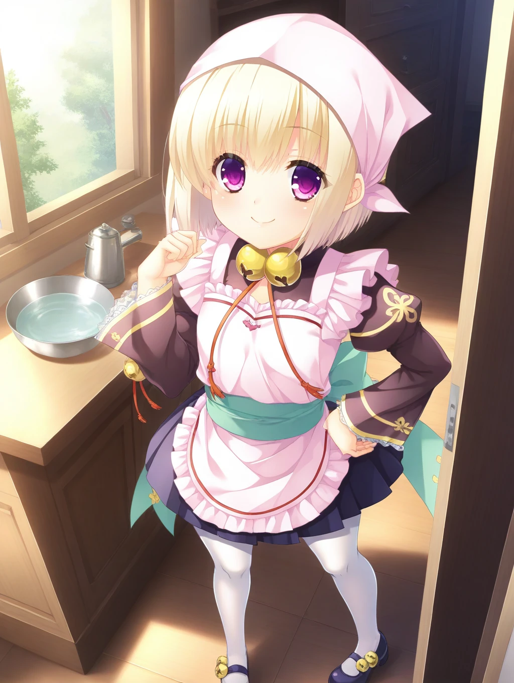 1girl,solo,bell,blonde hair,mary janes,shoes,pantyhose,apron,short hair,smile,jingle bell,white pantyhose,head scarf,long sleeves,purple eyes,skirt,standing,puffy sleeves,looking at viewer,juliet sleeves,shokatsuryou koumei