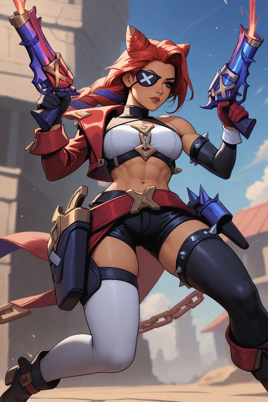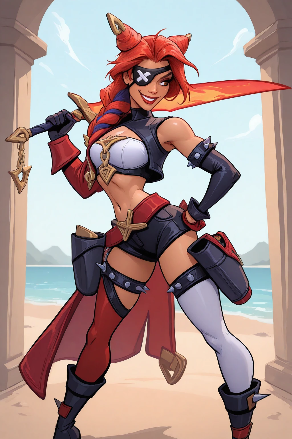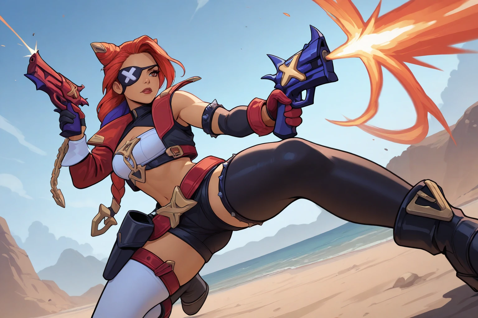 Trigger : SFSmira, long hair, multicolored hair, braided ponytail, double bun, hair ornament, eyepatch, red jacket, single bare shoulder, shoulder spikes, collared halterneck, cleavage cutout, single black detached sleeve, red glove, black glove, armlet with spikes, loose belt, pirate sash, shorts, holster, single thigh strap with spikes, asymmetrical legwear, boots