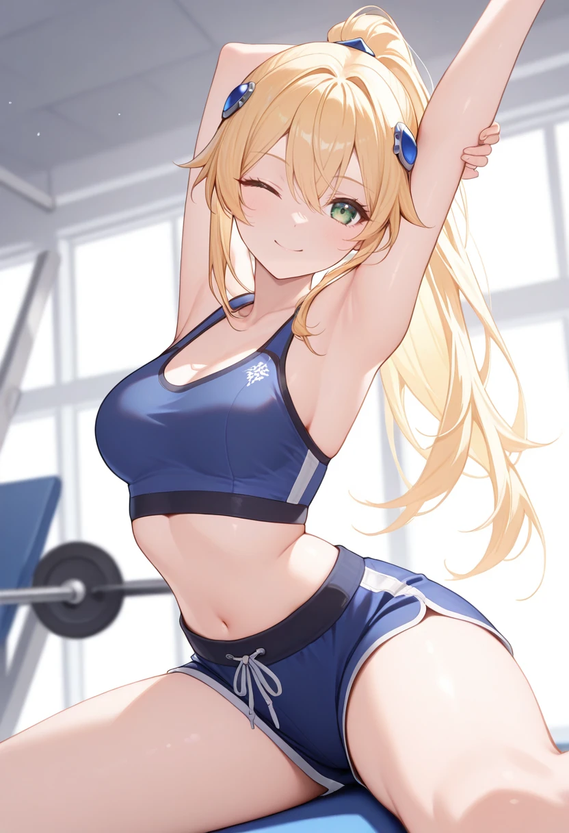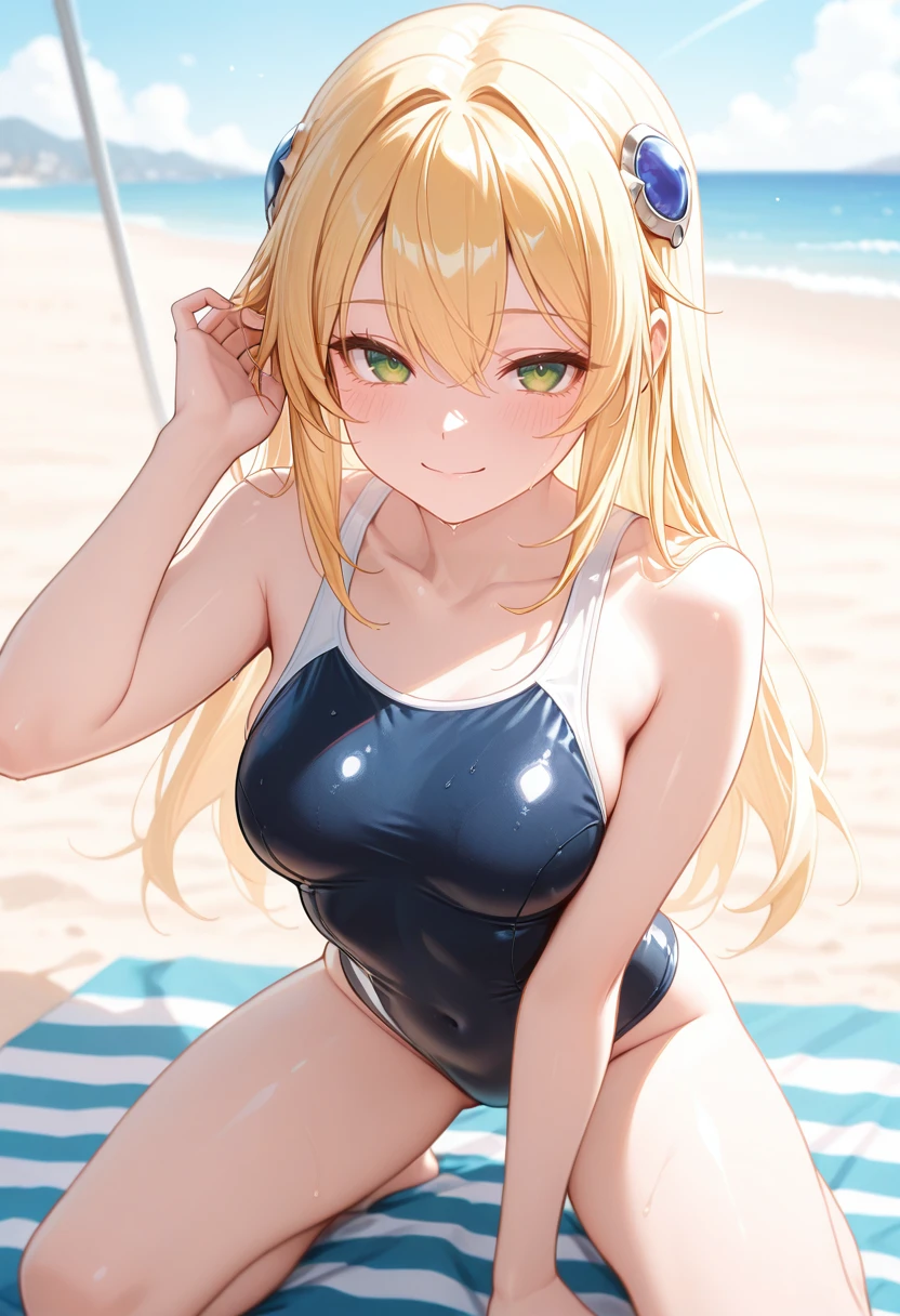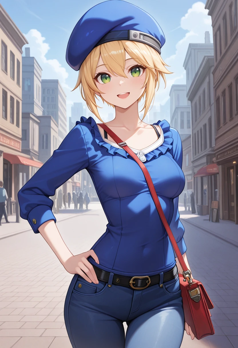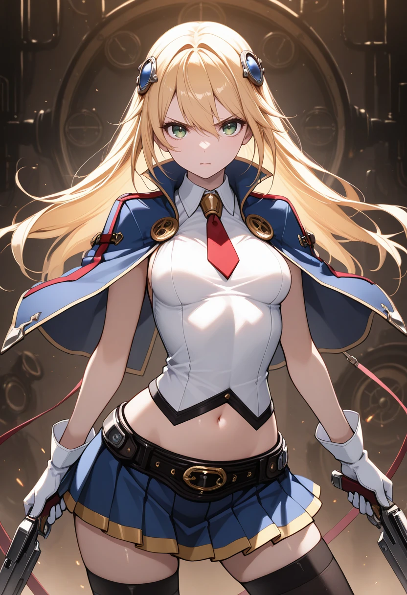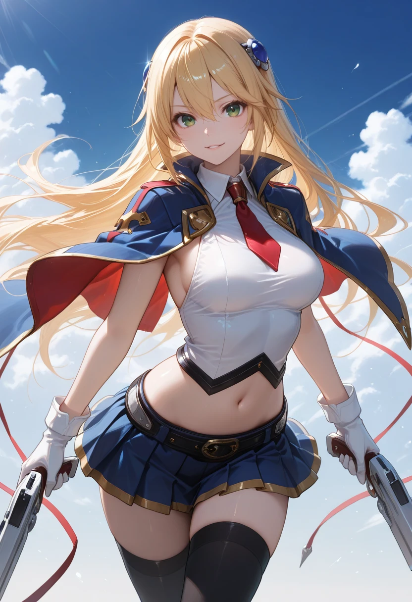 "NLLBLZB, blonde hair, long hair, hair ornament, green eyes, collared capelet, red necktie, white shirt, midriff, blue pleated skirt, black thighhighs, white gloves"