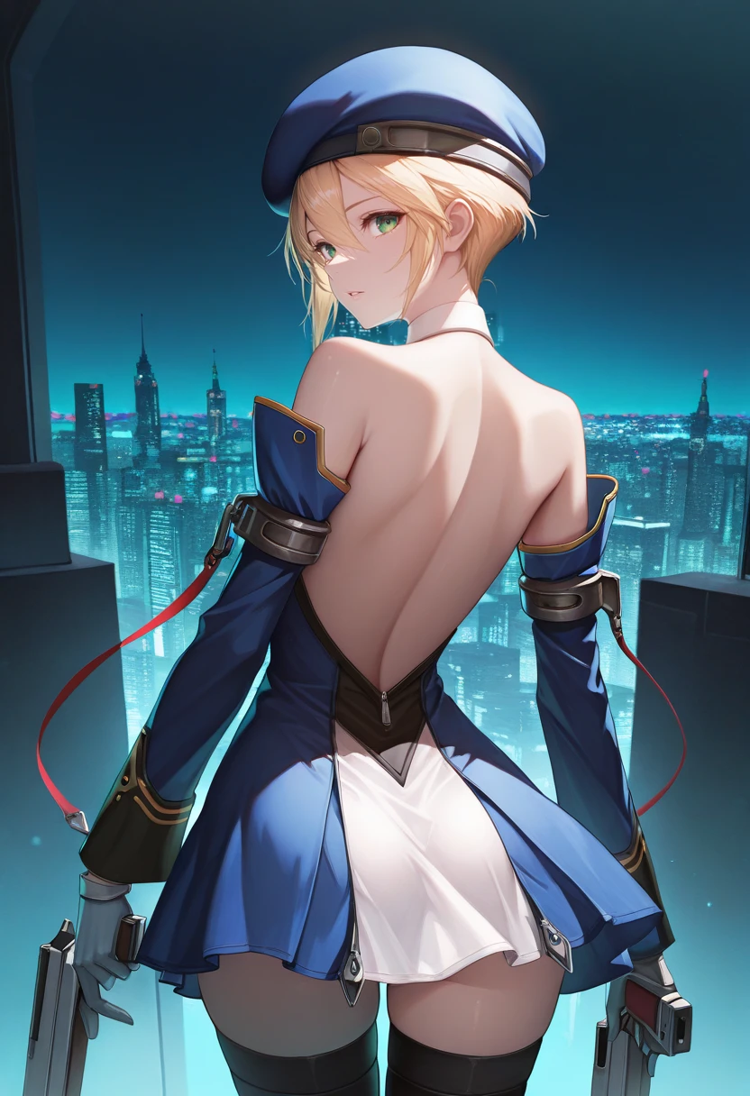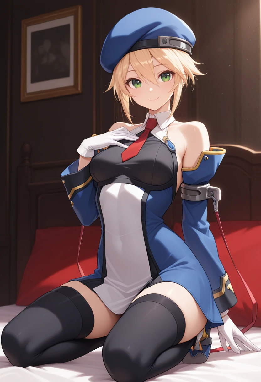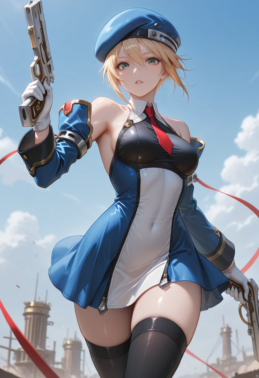 "NLLEVRM, beret, blonde hair, short hair, green eyes, red necktie, black top, multi-colored clothes, dress, detached sleeves, white gloves, black thighhighs"