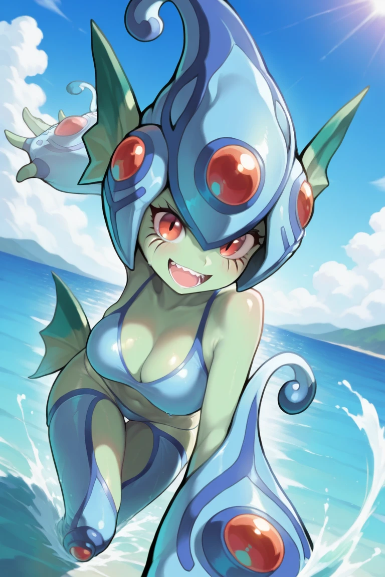 A Digimon that possesses power over Water which bears the might of one of the legendary Warrior Ten. It has a sharp intuition and an unstable mood, possibly because it had been in an area that was mostly active in a section of the ocean within a weather forecasting system. Its emotions are erratic; when it is in good mood, it shows off how graceful and lady-like it is, but when it gets upset, it cries hysterically like a baby.