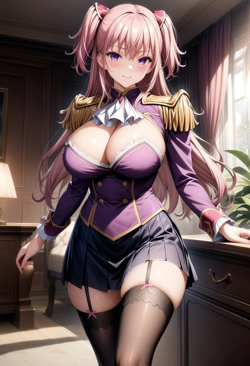 Trigger words: scherzen_a_xl, pink hair, long hair, two side up, bangs, purple eyes, large breasts, purple jacket, ascot, epaulettes, cleavage, purple skirt, thighhighs, black thighhighs, garter straps, high heels, black high heels,
