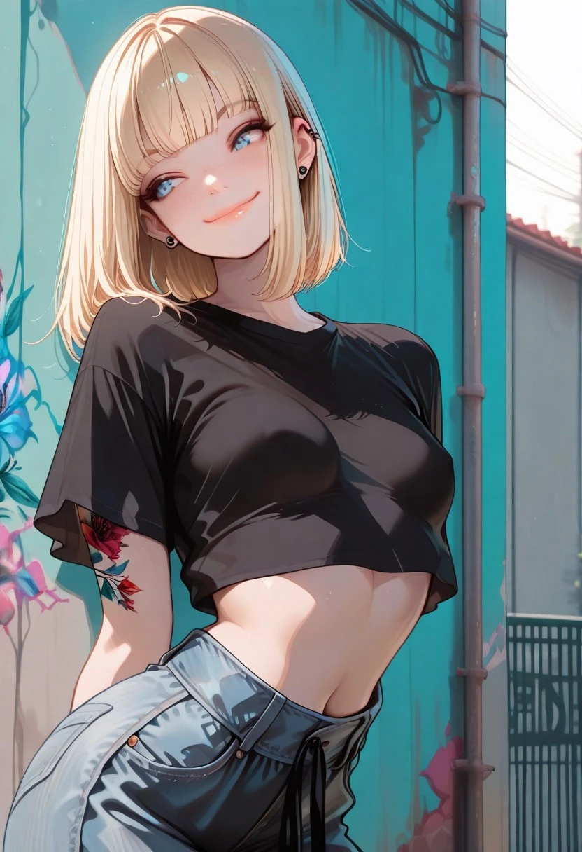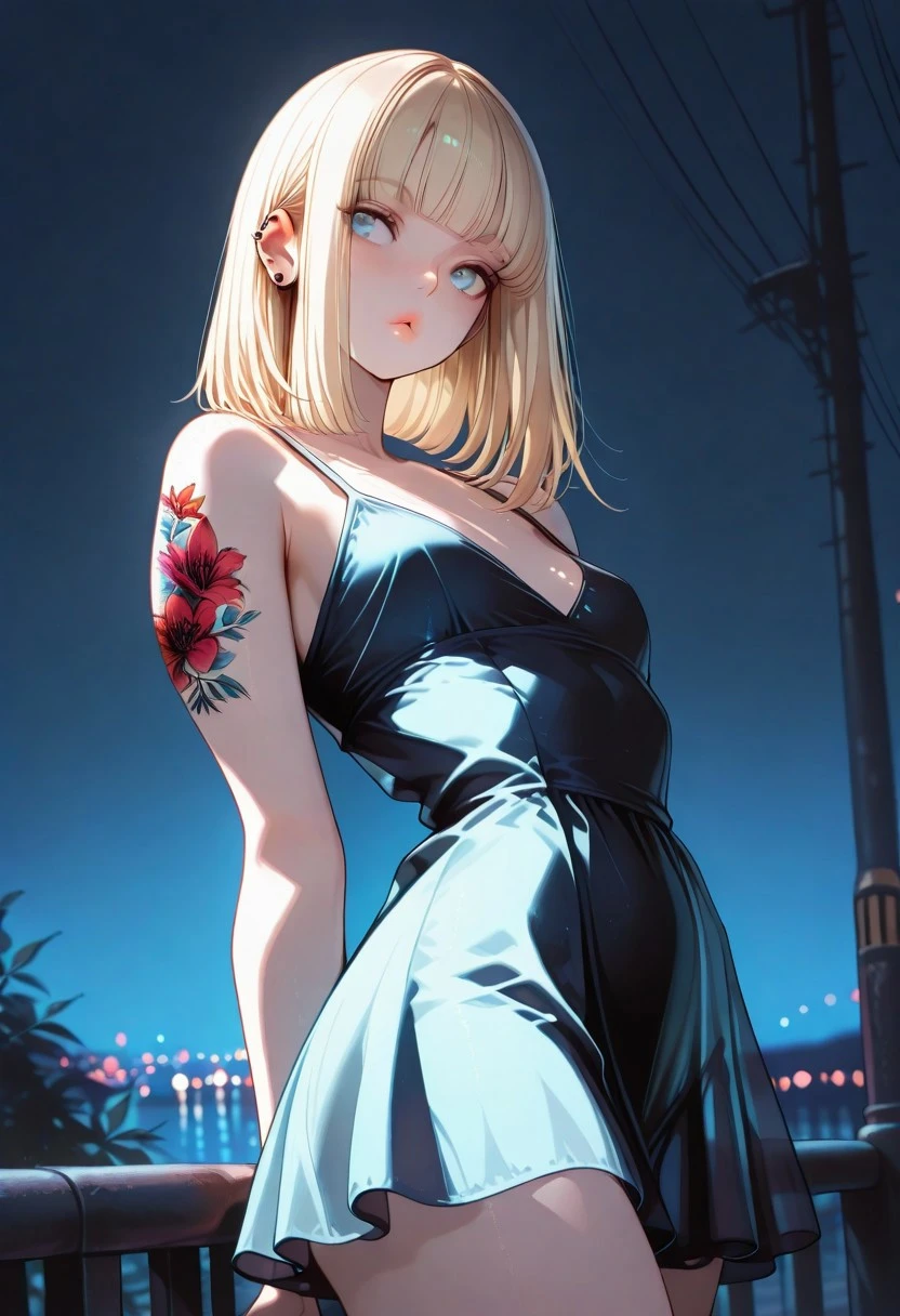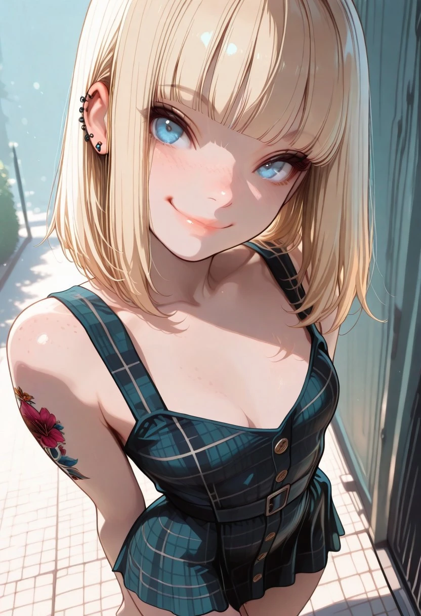 hime cut, medium hair, blonde hair, blunt bangs, blue eyes, small round lips, freckles, very small breasts, ear piercings, floral tattoo, tattoo on arm, slender