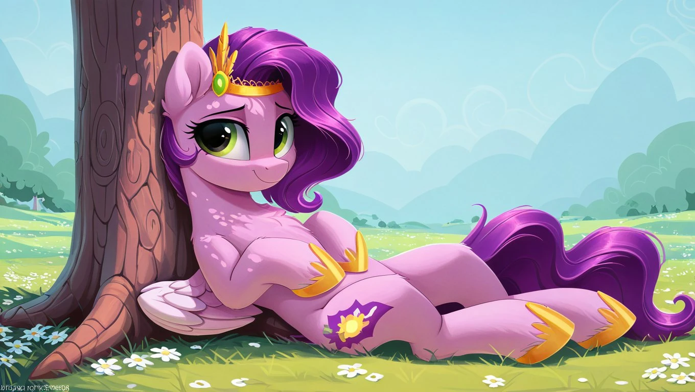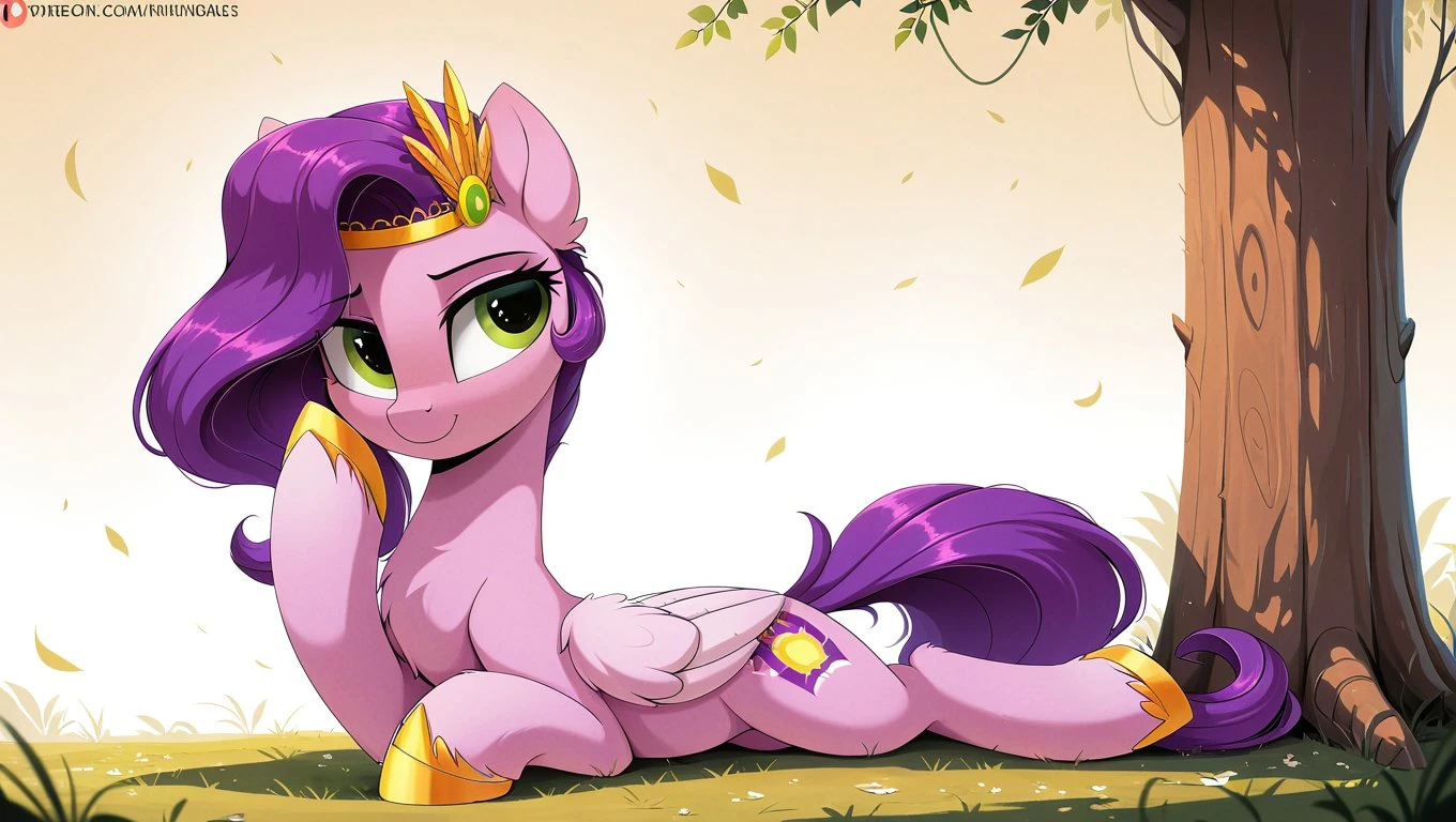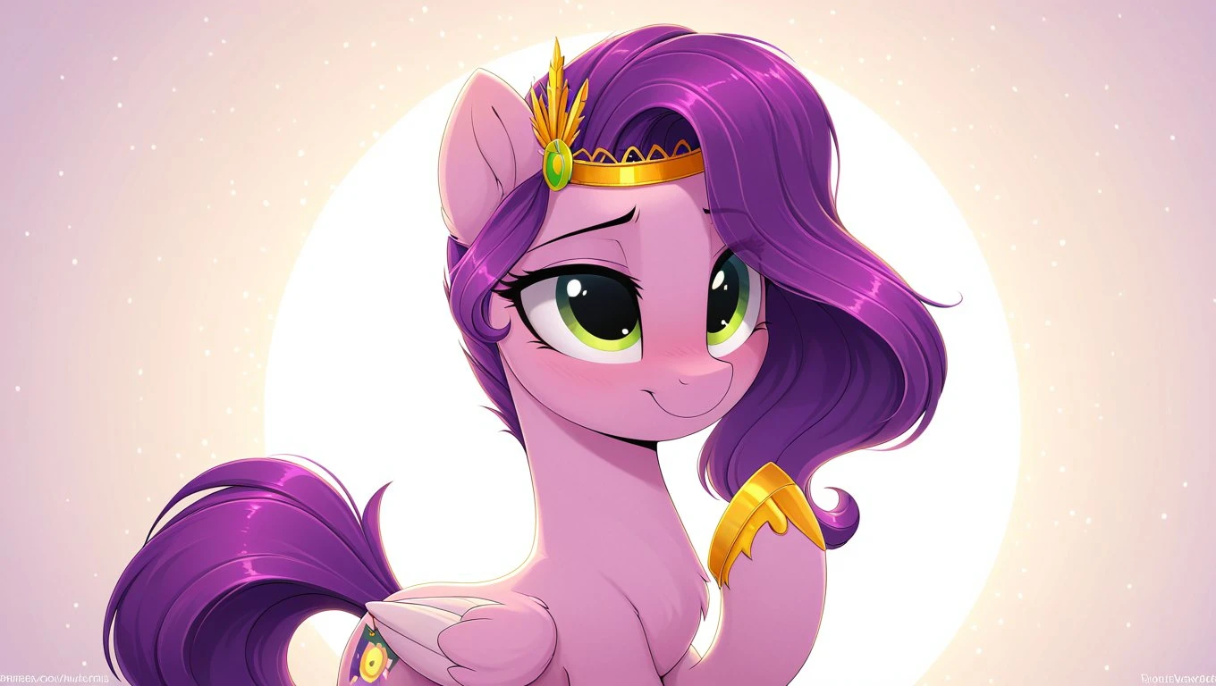 pipp petals,pony, PEGASUS, pink fur, purple hair, green eyes, white wings, gilded hooves, golden tiara