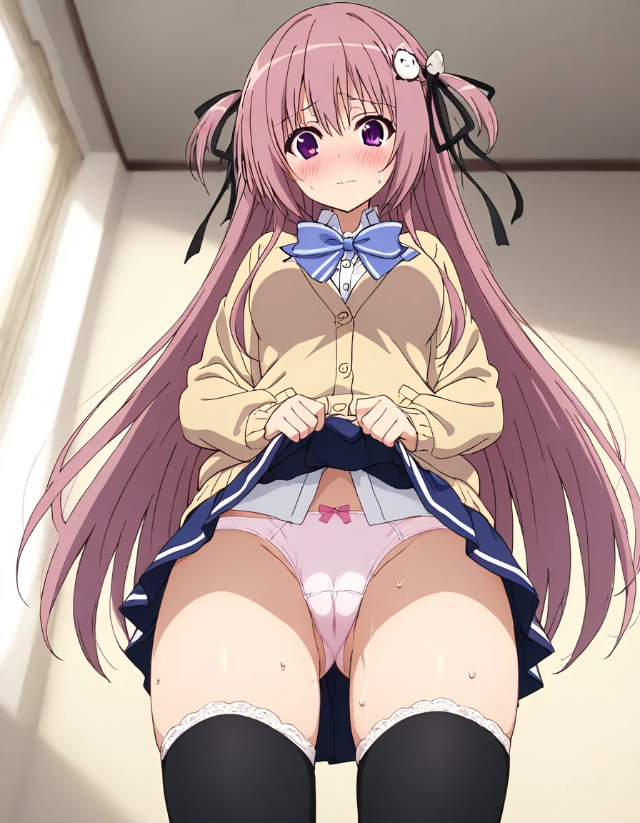 masterpiece , best quality , ultra-detailed,1girl, solo, purple eyes, two side up, very long hair, hair ornament, hair ribbon, school uniform, black thighhighs, ribbon, skirt, zettai ryouiki, bow,cardigan ,loafers,<lora:Hakata_Kanamoriebiten金森羽片えびてん_公立海老栖川高校天悶部:1>