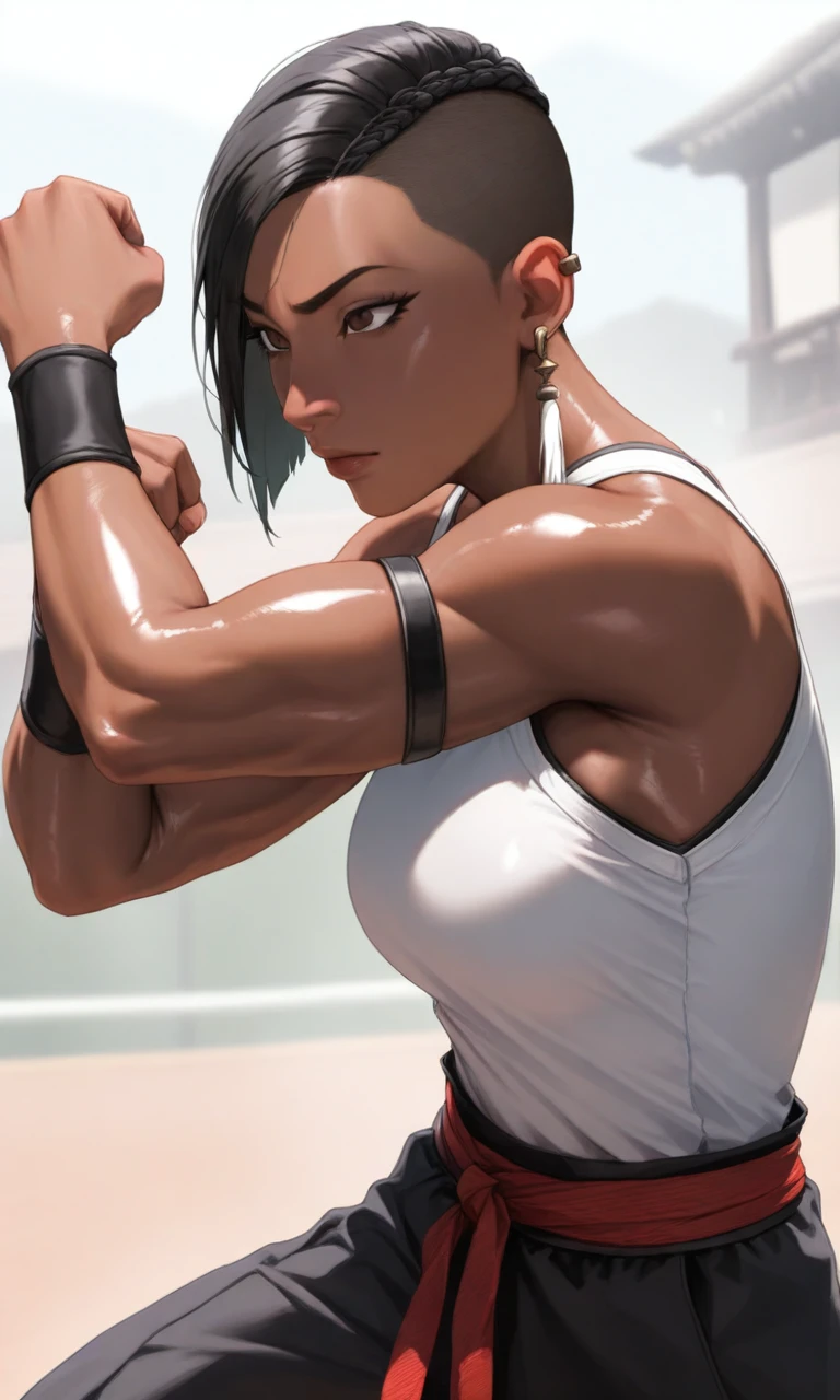 Namaari, Chinese, female, dark skin, black hair, short hair, undercut hair, toned body, brown eyes, narrow eyes, arm band, one earring,