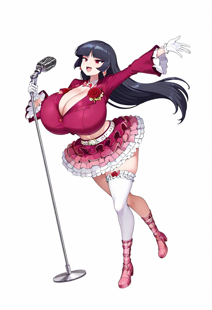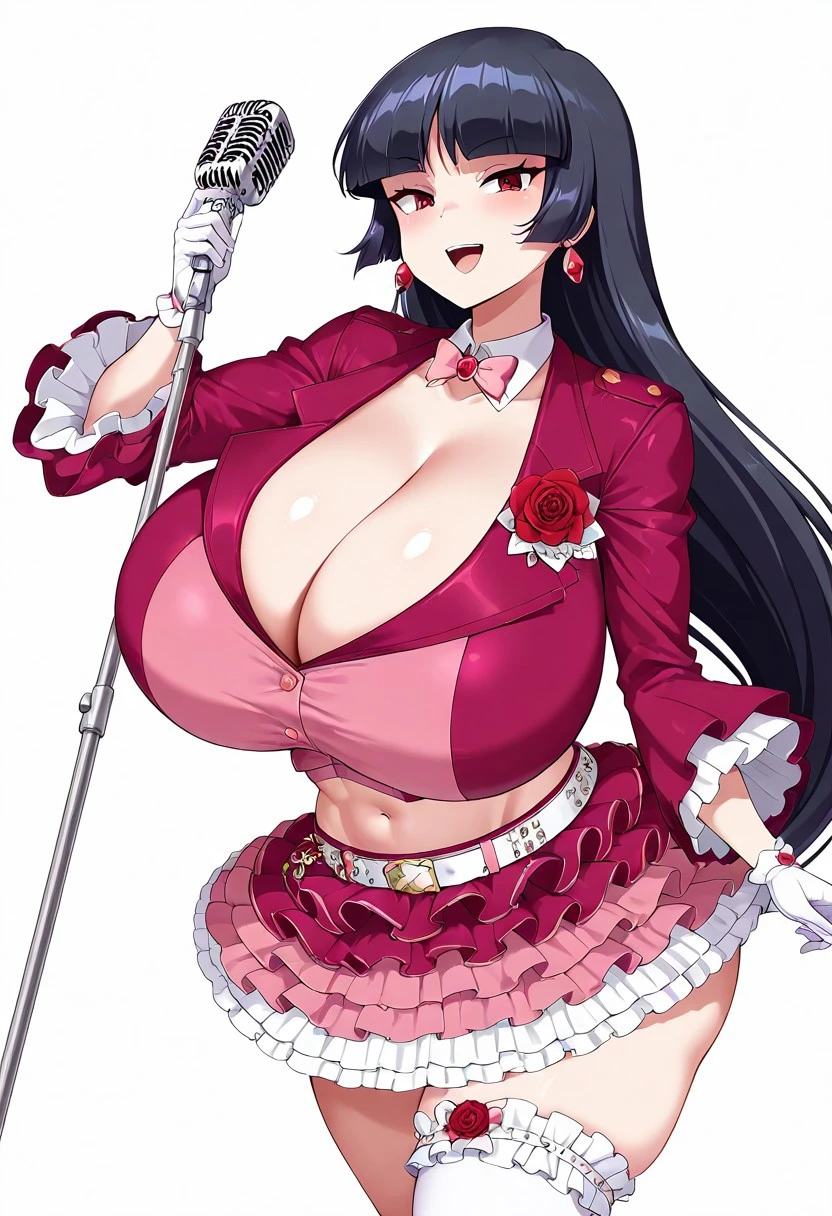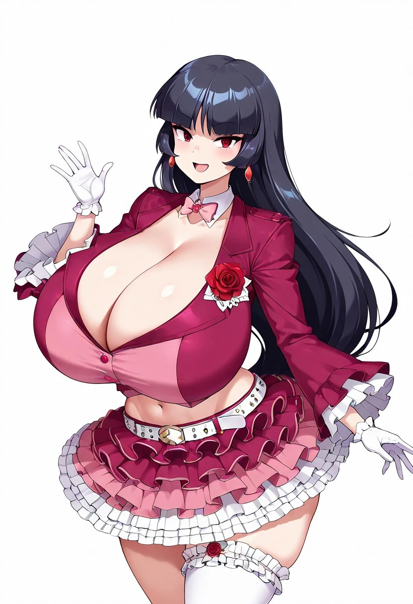 saenocos,cleavage,white gloves,midriff,detached collar,red rose,frilled skirt,pink skirt,layered skirt,white belt,pink bowtie,idol,jacket,frills,white single thighhigh,Rose corsage,pink jacket,earrings, crop top,