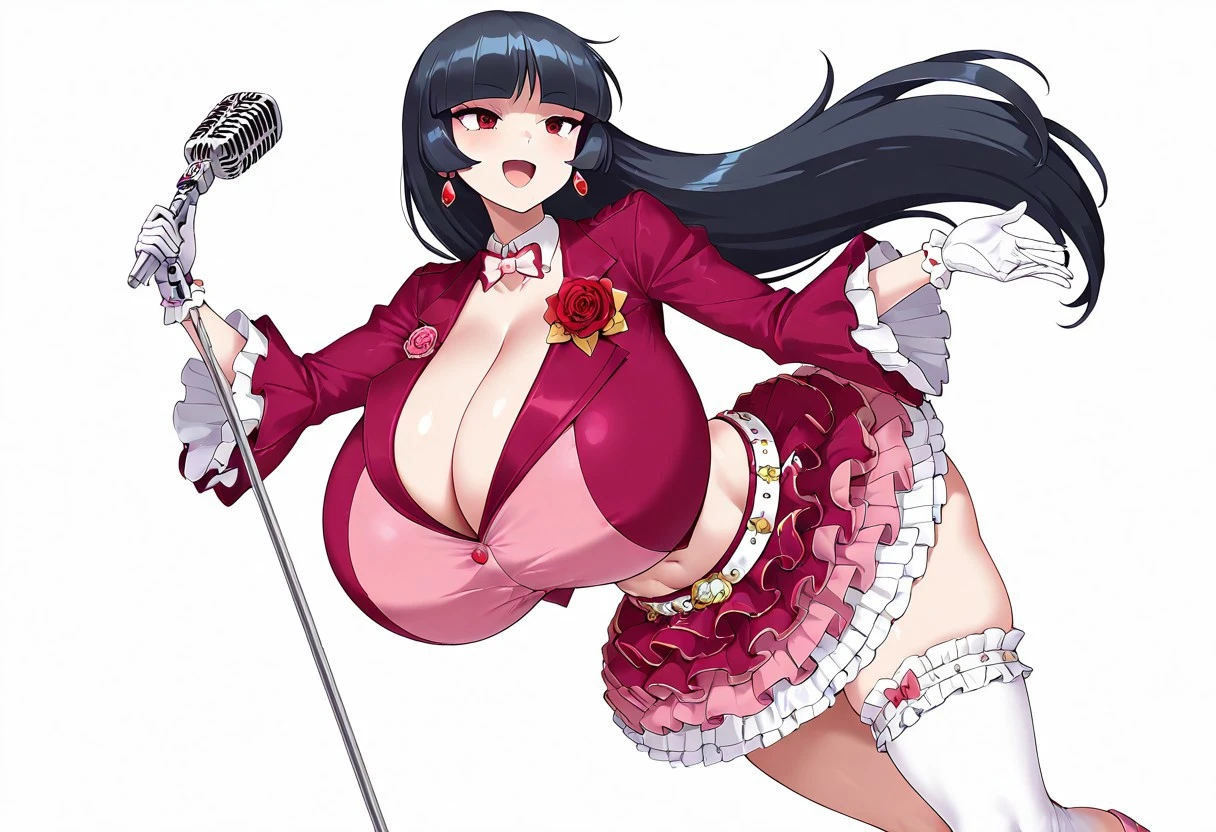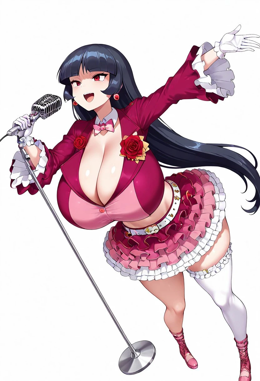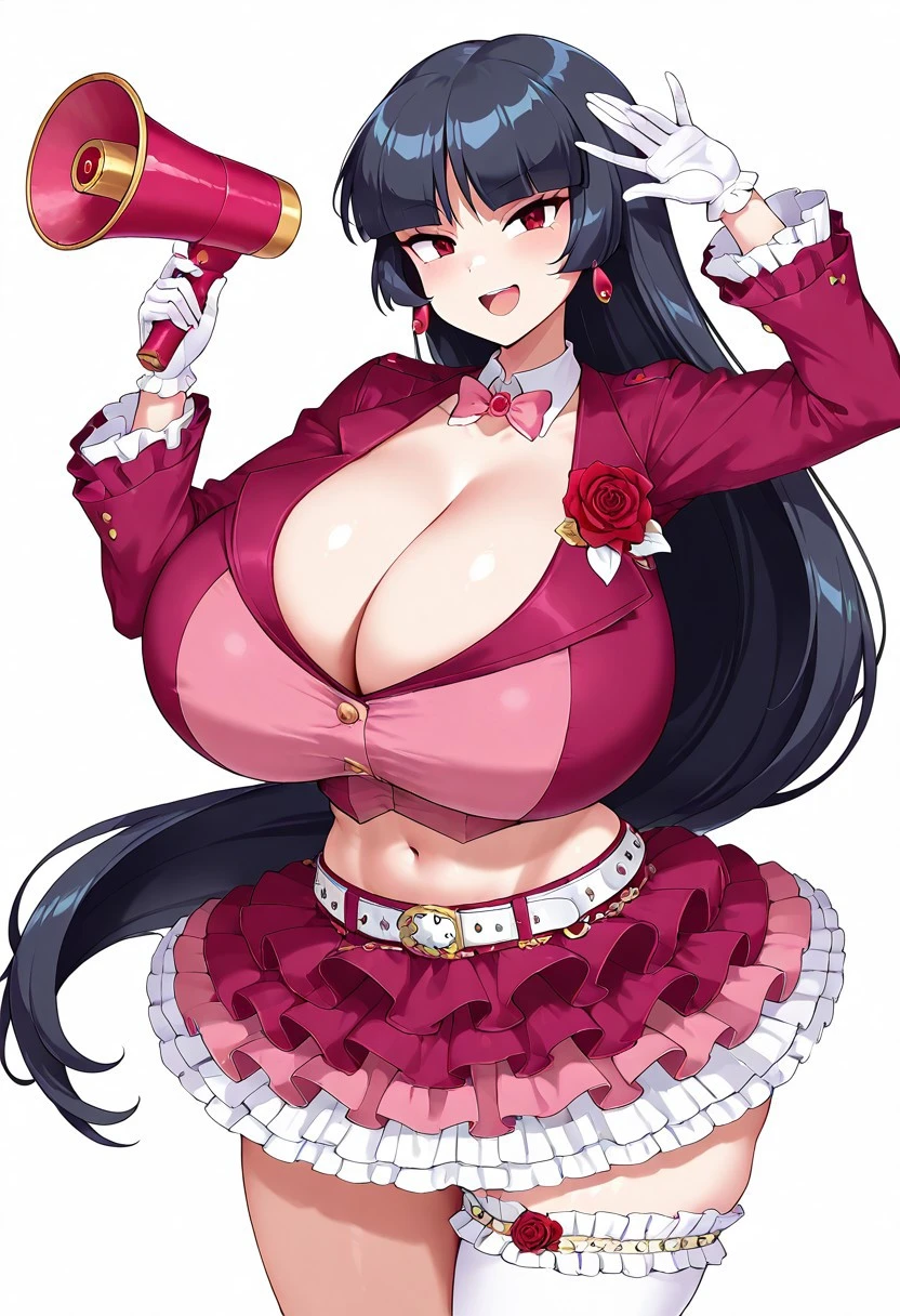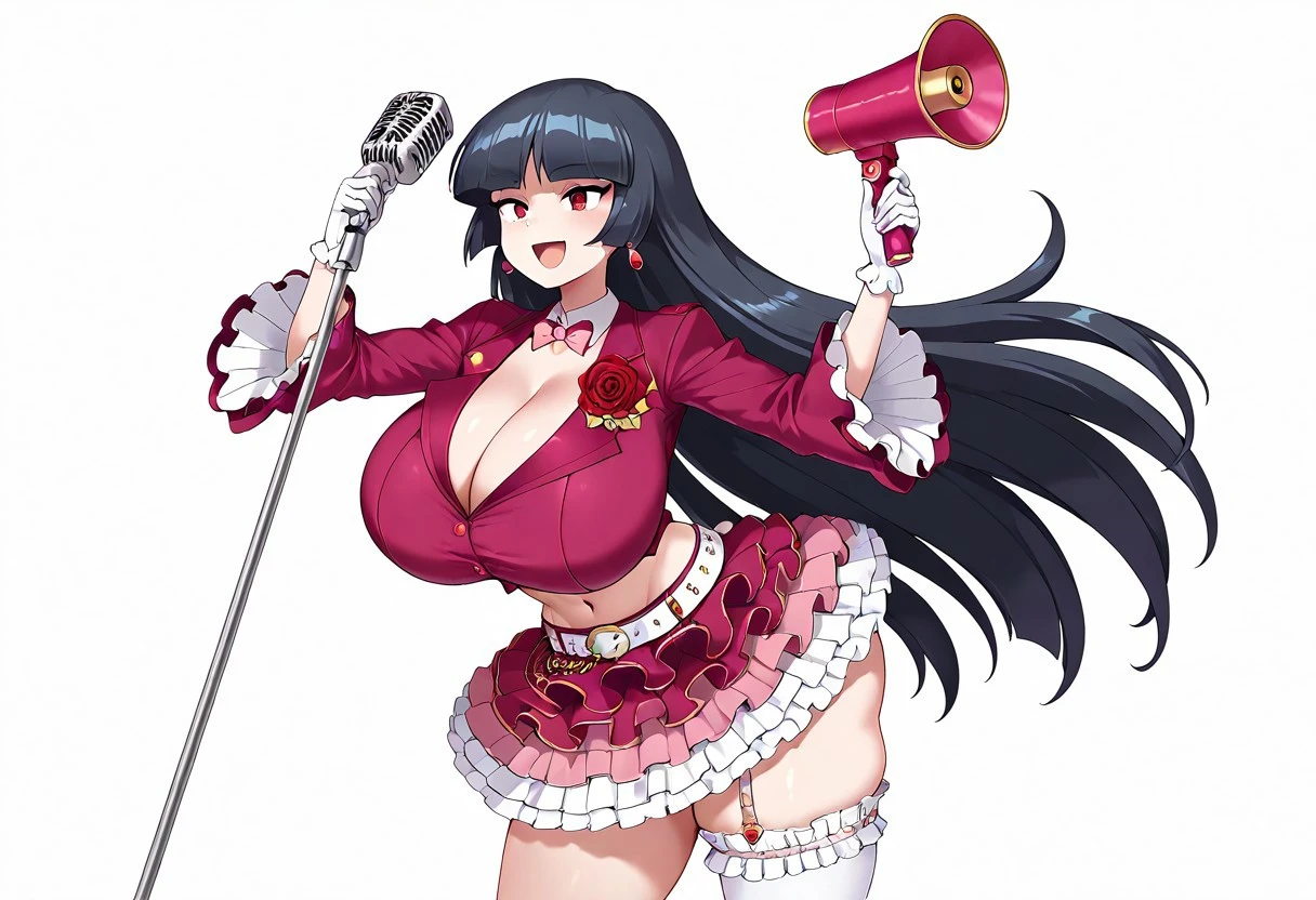 saenocos,cleavage,white gloves,midriff,detached collar,red rose,frilled skirt,pink skirt,layered skirt,white belt,pink bowtie,idol,jacket,frills,white single thighhigh,Rose corsage,pink jacket,earrings, crop top,