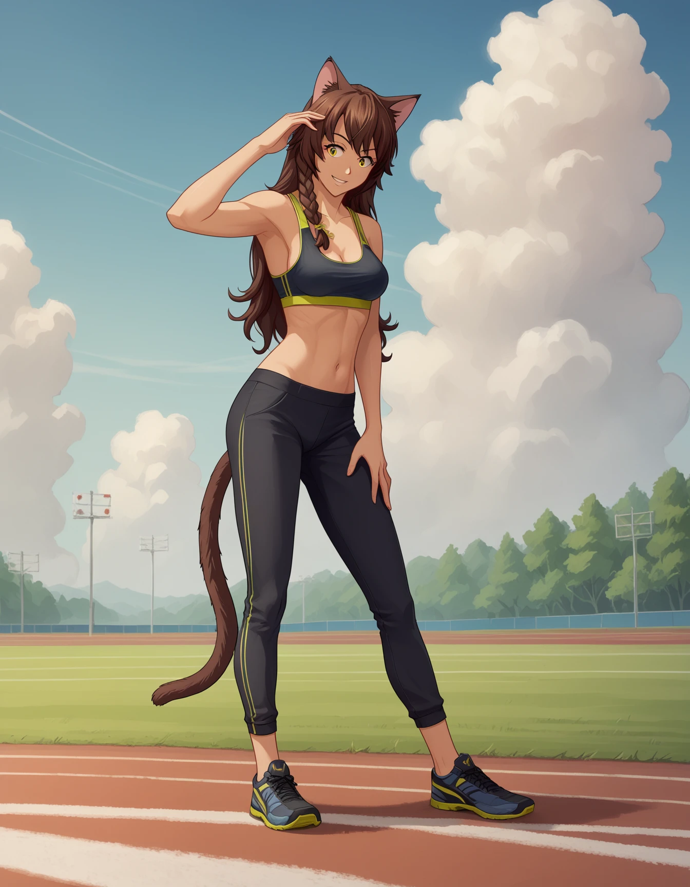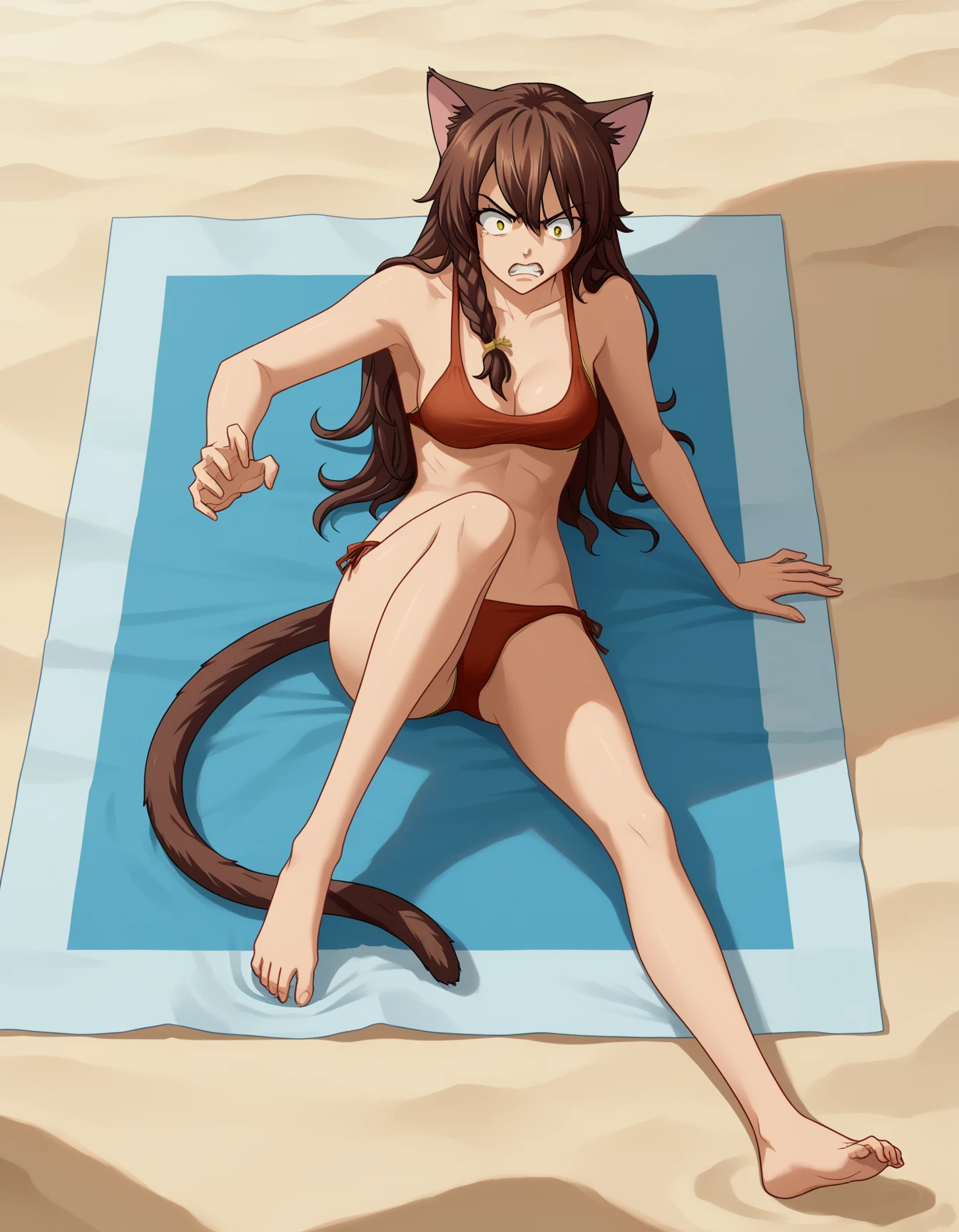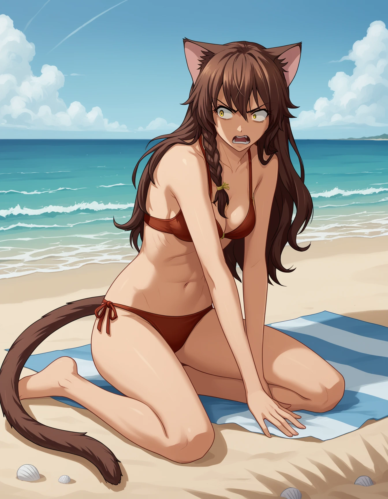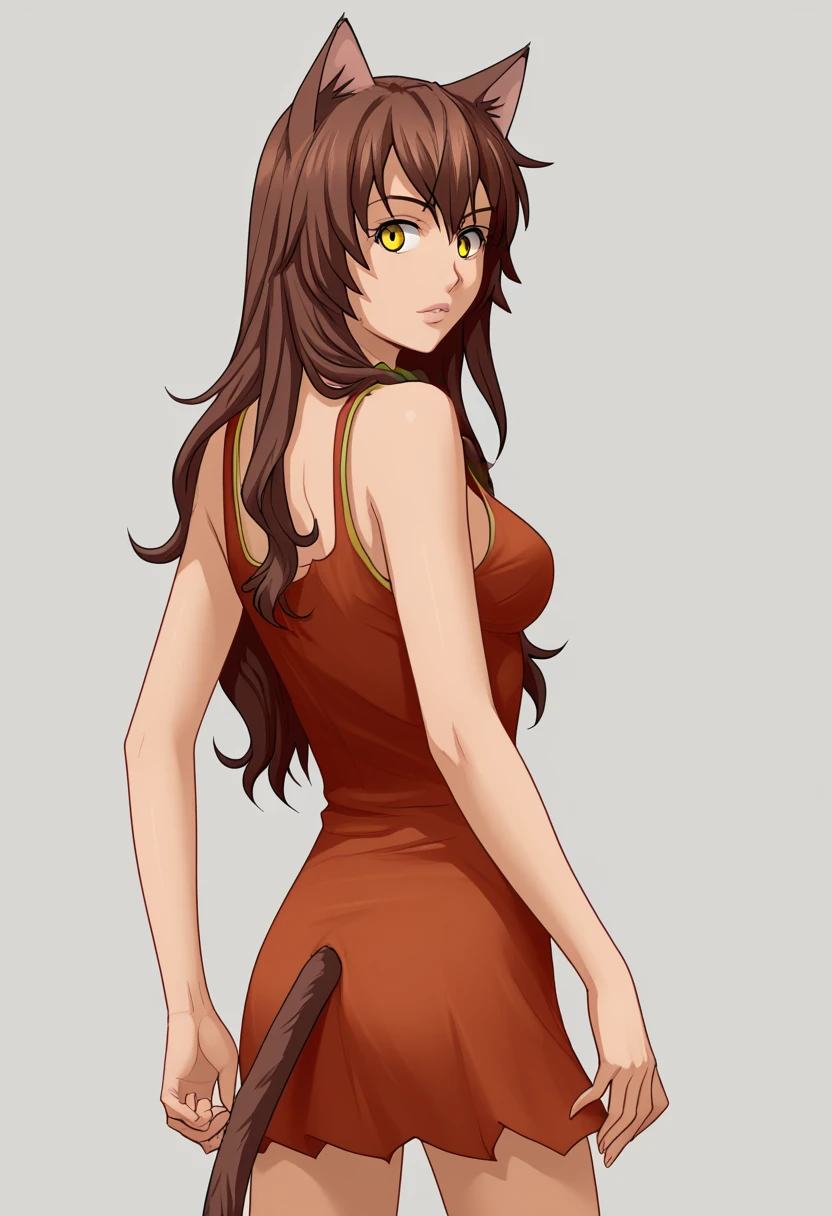 uv, long hair, animal ears, brown hair, yellow eyes, cat ears, cat tail, side braid, single braid,