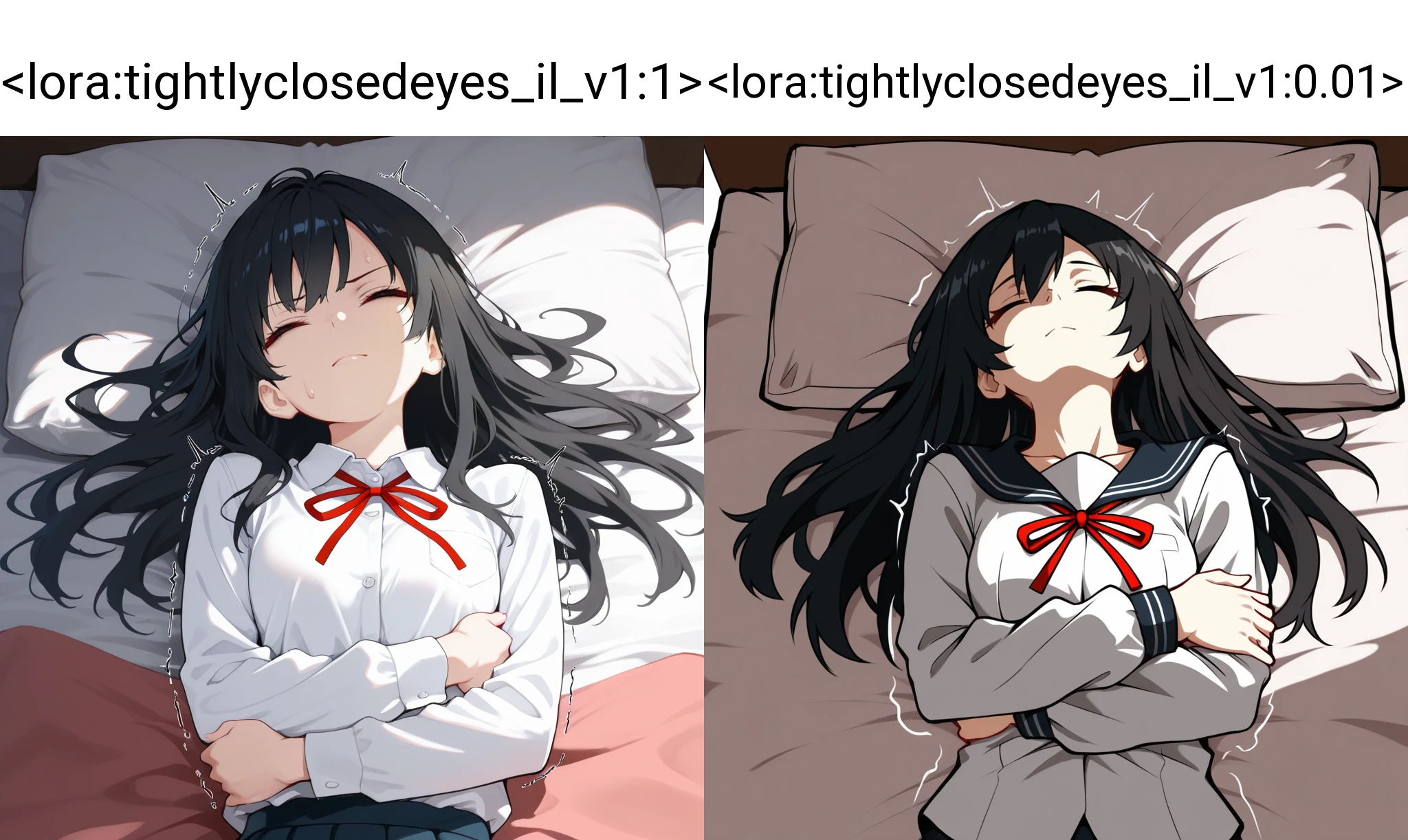 This LoRA makes it easier to express eyes tightly closed due to pain or suffering, rather than the gentle closed eyes seen during sleep.