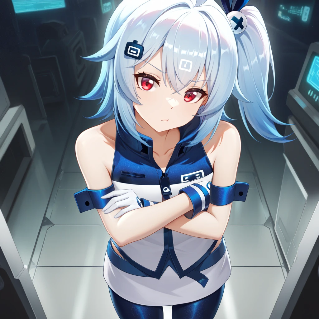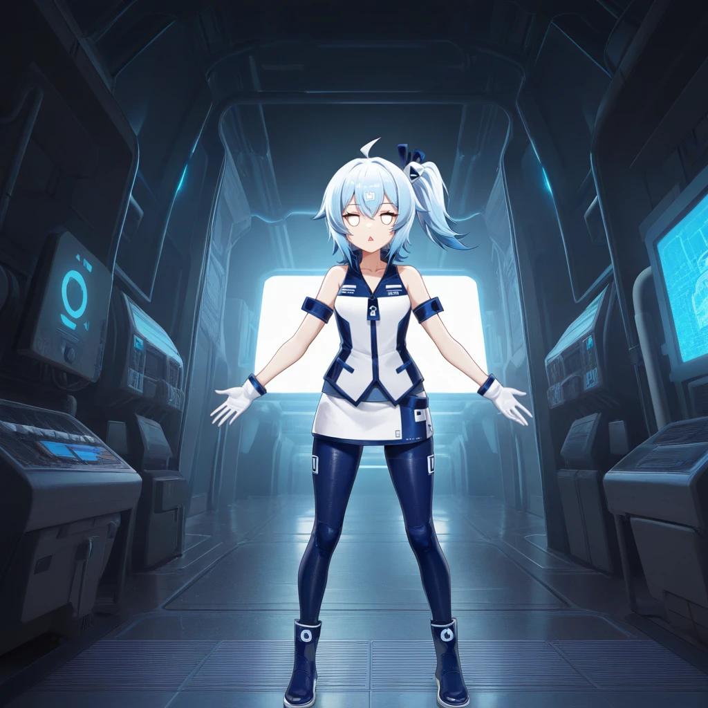 BiliG33, Bg3_Rcq, bili girl 33, power symbol, light blue hair, ahoge, red eyes, medium hair, side ponytail, blue bodysuit, bodysuit, racing suit, white shrug, shrug (clothing), white sleeves, long sleeves, white cuffs, white armor, white gloves, gloves, blue pants, pants, race queen, armored pants, white boots, knee boots, light blue boots, two-tone footwear,Casual Outfit:
