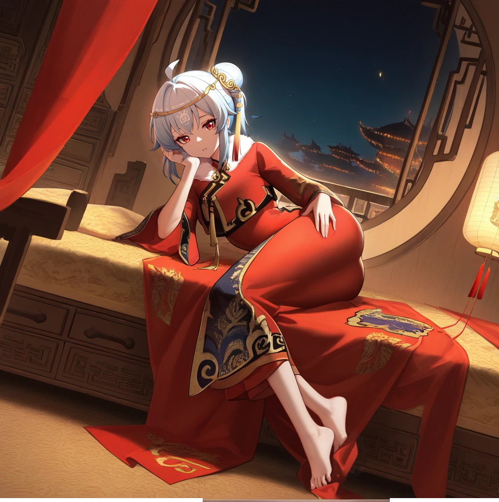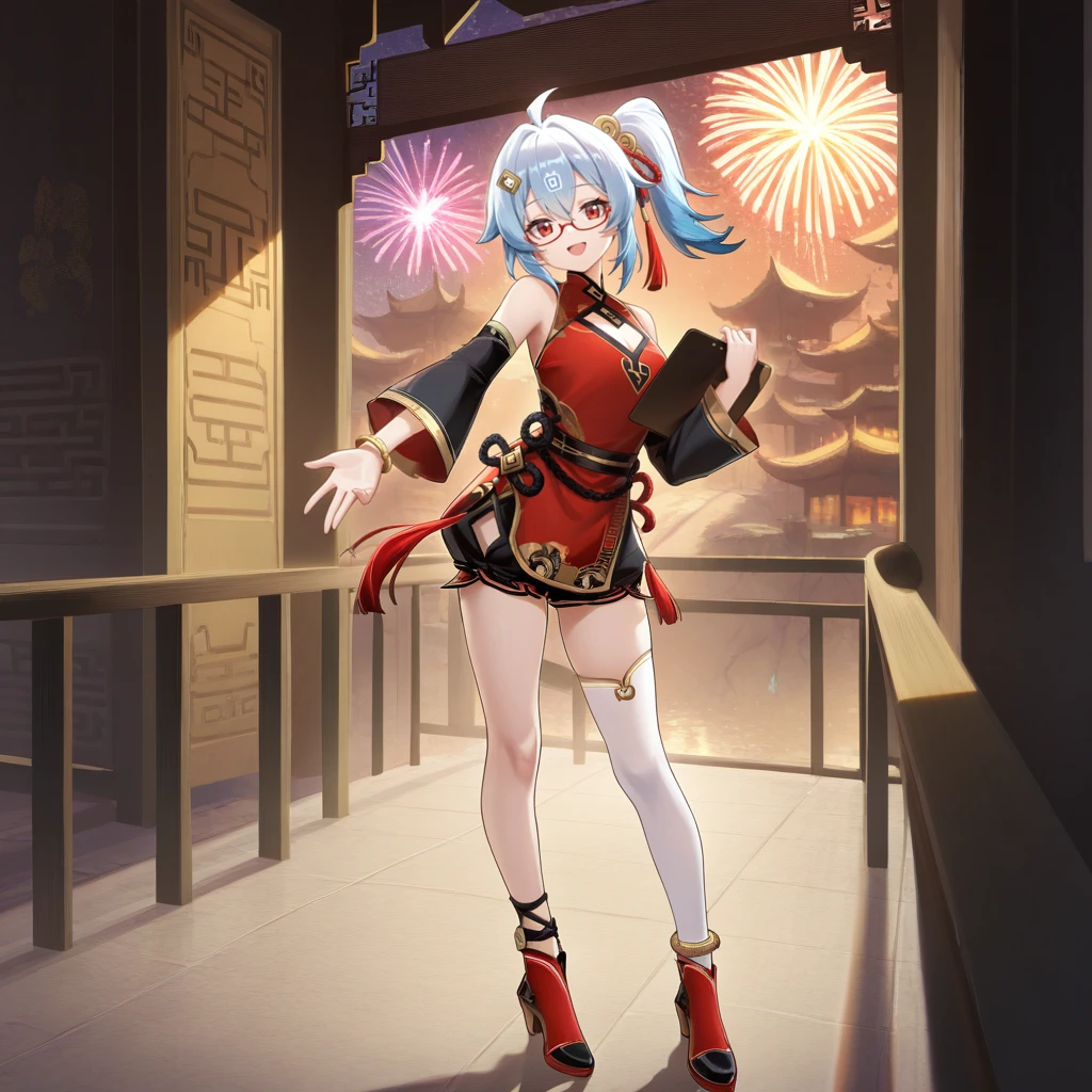 BiliG33, Bg3_Nyr, bili girl 33, power symbol, light blue hair, ahoge, red eyes, medium hair, side ponytail, china dress, sleeveless, red dress, rope around waist, black rope, chinese knot, red tassel, puffy shorts, shorts under dress, leg cutout, gold bracelet, black shorts, detached sleeves, black sleeves, wide sleeves, cleavage cutout, bare shoulders, red-framed eyewear, glasses, under-rim eyewear, gold hairclip, tassel hair ornament, single thighhigh, white thighhighs, anklet, red boots, ankle lace-up, block heels,Formal Dress Outfit: