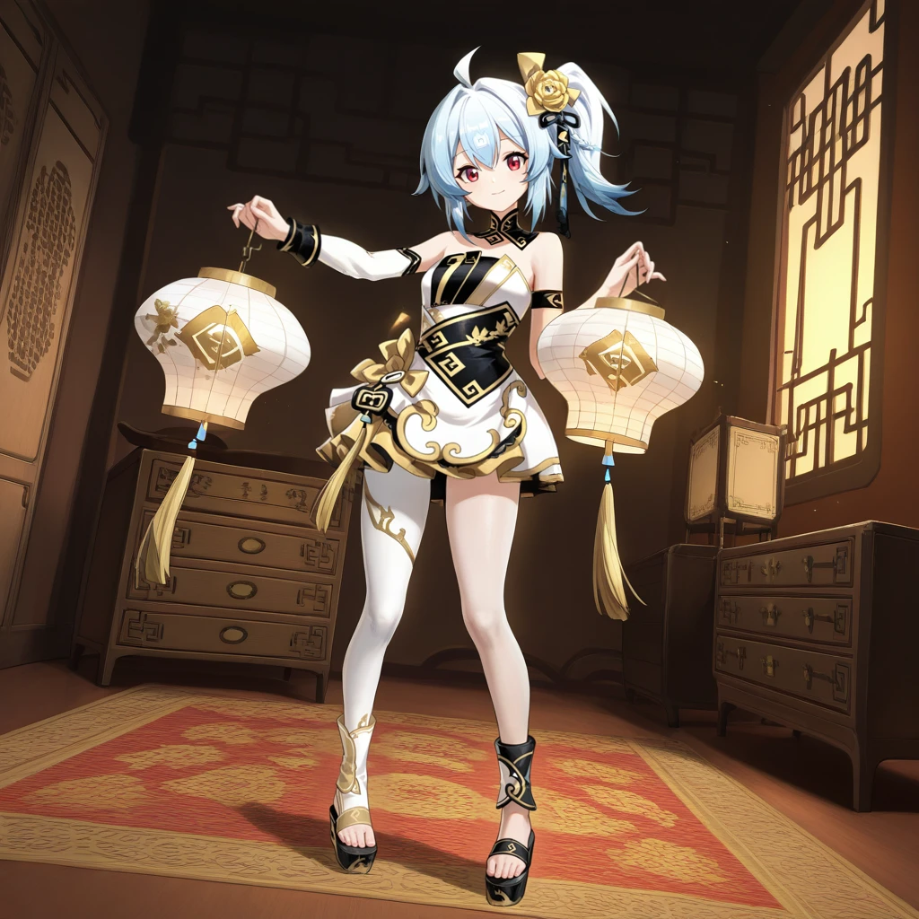 BiliG33, Bg3_Alt, bili girl 33, power symbol, light blue hair, ahoge, red eyes, side ponytail, medium hair, sphere hair ornament, yellow bow, hair bow, strapless dress, chinese clothes, single detached sleeve, white sleeves, black wrist cuffs, black armband, hair flower, yellow flower, dress flower, layered dress, multicolored dress, yellow dress, white dress, black trim, black collar, detached collar, single detached legging, white leggings, ankle cuffs, mismatched ankle cuffs, platform sandals, black sandals,Chinese 03 Outfit: (With Chinese Wedding Dress)