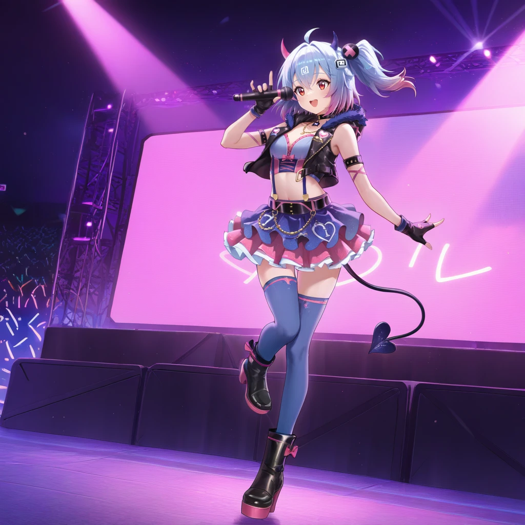 BiliG33, Bg3_Idol, bili girl 33, power symbol, light blue hair, ahoge, red eyes, medium hair, side ponytail, tv hair ornament, gradient hair, pink hair, demon horns, idol, idol clothes, mismatched horns, fur-trimmed jacket, cropped jacket, black choker, demon tail, pendant choker, sleeveless jacket, black jacket, fur trim, pink trim, blue bustier, bustier, pink bow, pink underbust, cross-laced clothes, black belt, large belt, suspenders, bare shoulders, suspender skirt, layered skirt, blue skirt, pink skirt, blue thighhighs, fingerless gloves, black gloves, arm belt, platform heels, black boots, pink colored shoe sole,Chinese 01 Outfit: (With Fur Coat)