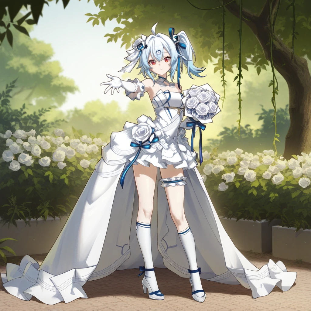 BiliG33, Bg3_Wed, bili girl 33, power symbol, light blue hair, ahoge, red eyes, medium hair, side ponytail, tv hair ornament, white veil, bridal veil, hair flower, white rose, wedding dress, strapless, white gorget, gorget, bare shoulders, frilled armband, white armband, dress flower, high-low dress, flower thigh strap, blue ribbon, hair ribbon, white gloves, elbow gloves, white dress, white kneehighs, kneehighs, white footwear, high heels, blue ankle strap,Idol Outfit: