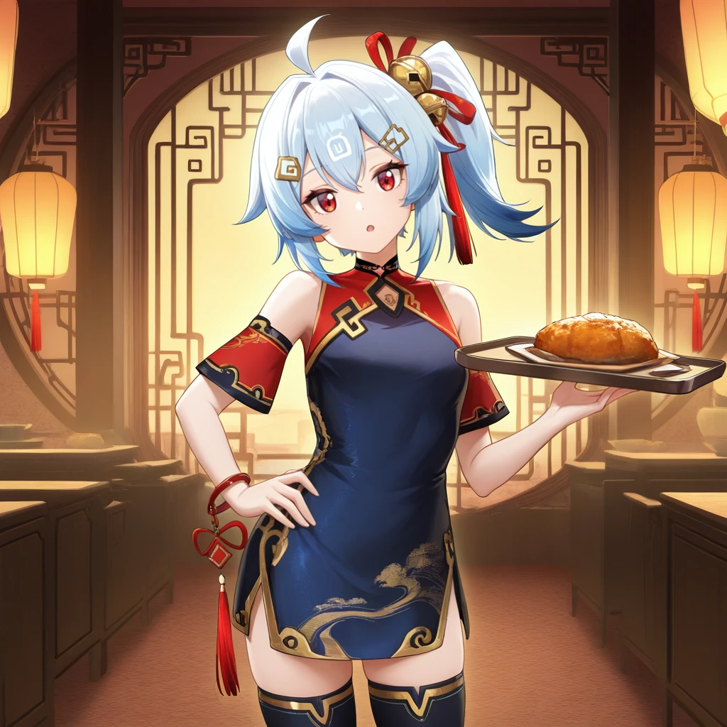 BiliG33, Bg3_CN, bili girl 33, power symbol, light blue hair, ahoge, red eyes, side ponytail, medium hair, blue dress, chinese clothes, sleeveless dress, detached sleeves, red sleeves, short sleeves, red ribbon, hair ribbon, hair bell, black choker, clothing cutout, gold trim, red shirt, sleeveless shirt, shirt under dress, bare shoulders, hairclip, red bracelet, black thighhighs, short dress, side slit, red tassel, fur-trimmed footwear, red anklet, ankle bell, blue footwear, high heel boots, ankle boots,Optional: For her fur coat+capelet add "fur-trimmed capelet, blue capelet, hooded capelet, red coat, sleeveless coat, open coat, fur-trimmed coat, fur-trimmed gloves, blue gloves,"