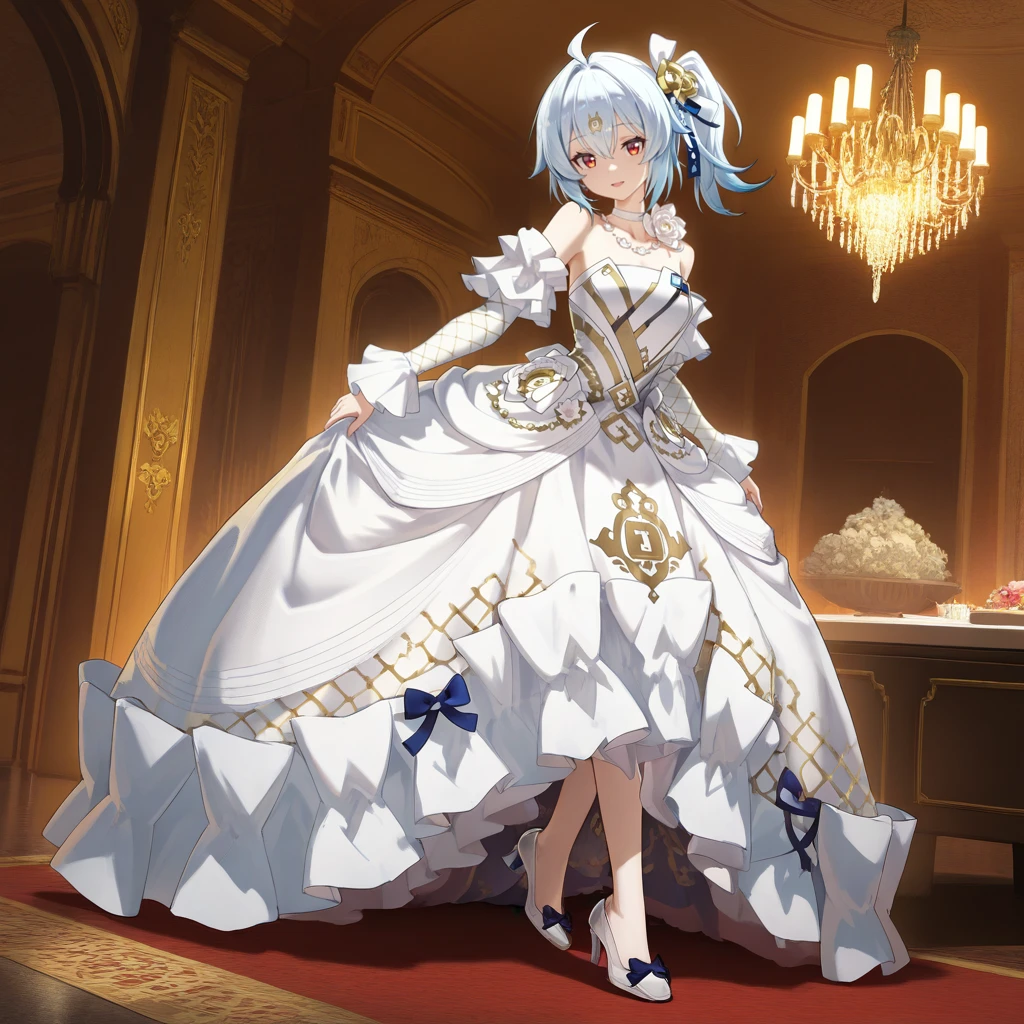 BiliG33, Bg3_Drs, bili girl 33, power symbol, light blue hair, ahoge, red eyes, medium hair, side ponytail, strapless shirt, white shirt, shirt under dress, white dress, long dress, frilled dress, hoop dress, neck flower, white flower, white choker, necklace, bare shoulders, detached sleeves, frilled sleeves, white sleeves, sleeves past wrists, gold flower, dress flower, white overskirt, overskirt, gown, flower hair ornament, hair bow, white bow, white pumps, pumps, footwear bow, blue bow,Race Queen Merch Outfit: