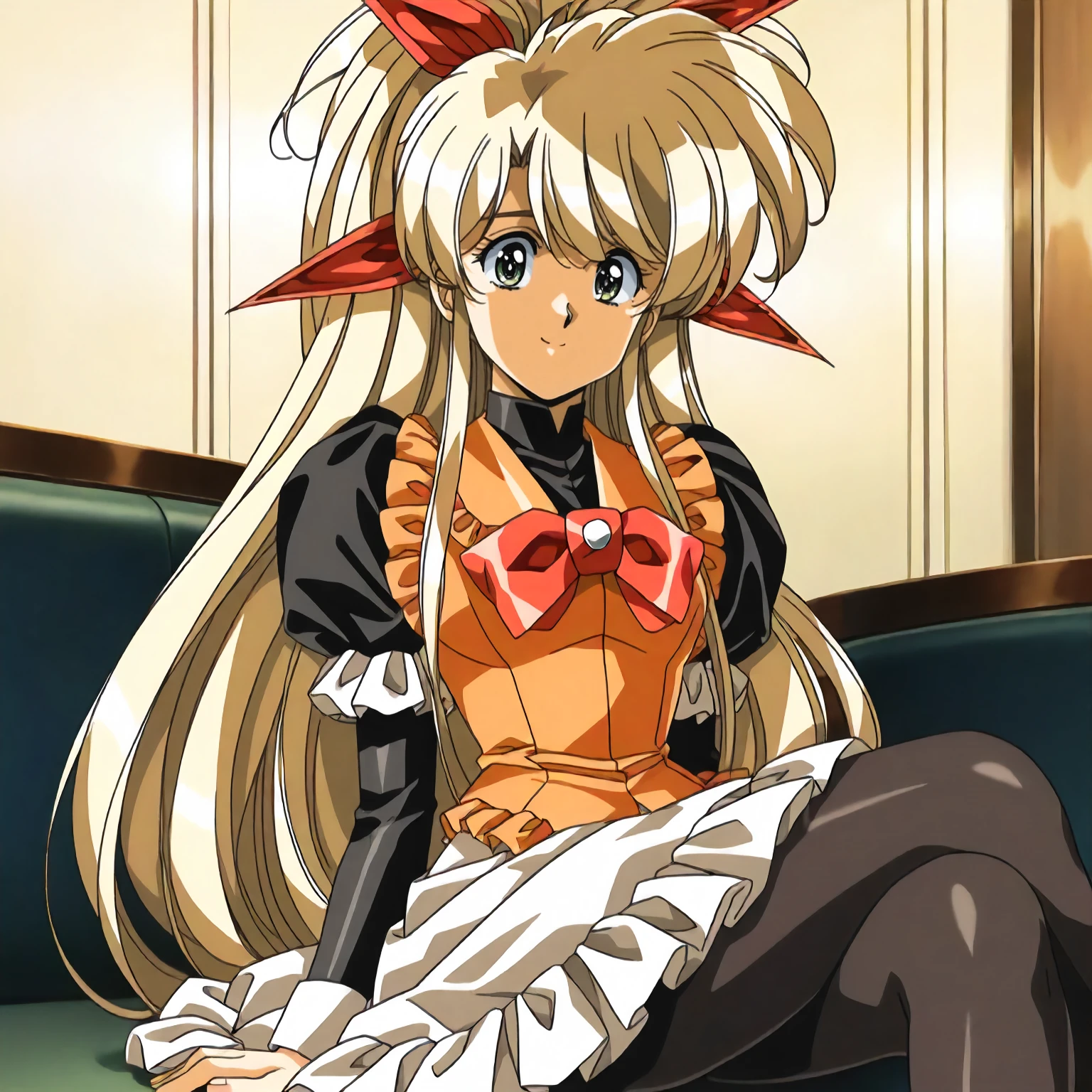 anime coloring,retro artstyle, faye\(front_innocent\),1girl,blonde hair,high ponytail,red hairbow,very long sidelocks,green eyes,