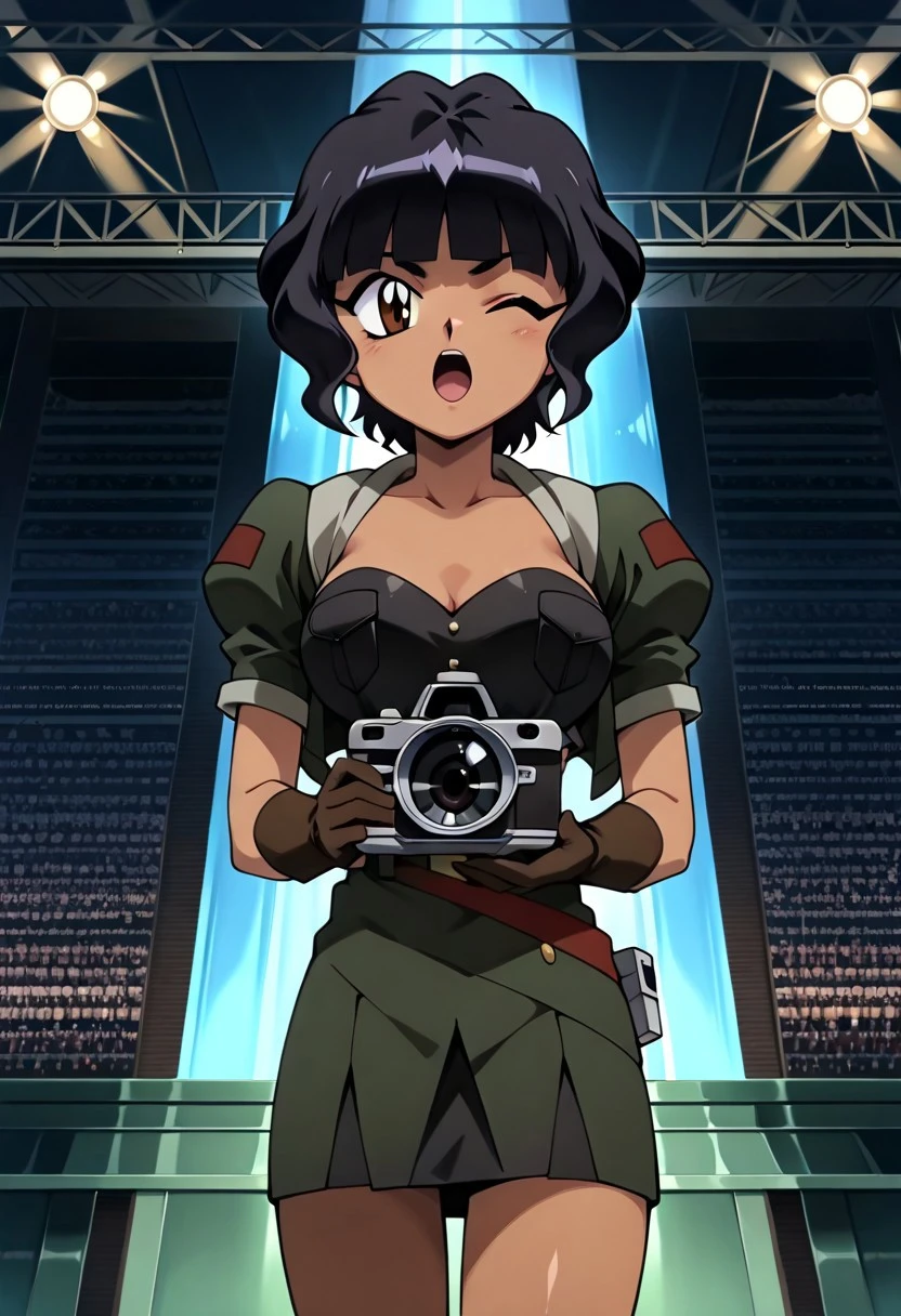 dark skin, dark-skinned female, breasts, black hair, gloves, short hair, cleavage, skirt, thighhighs, smile, brown eyes,