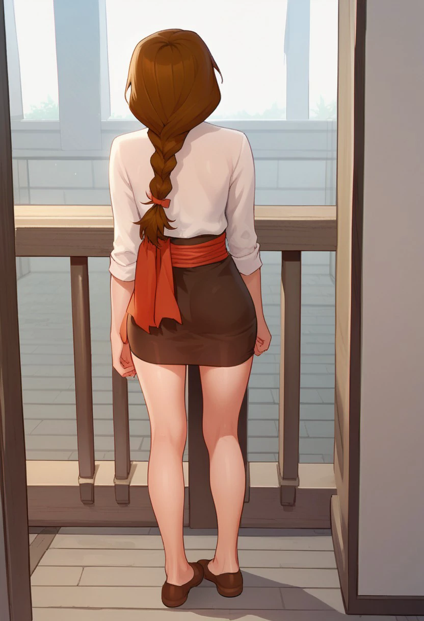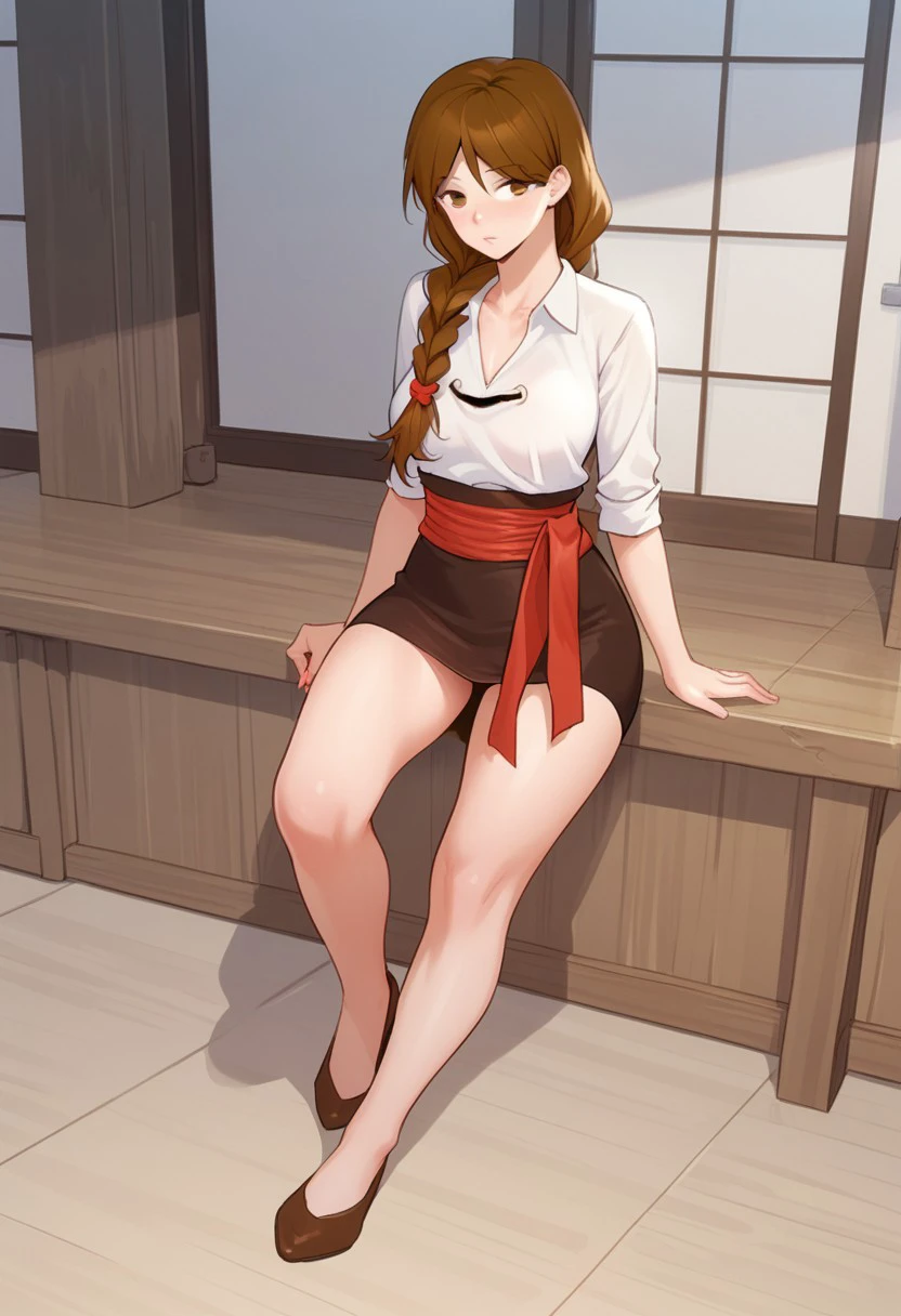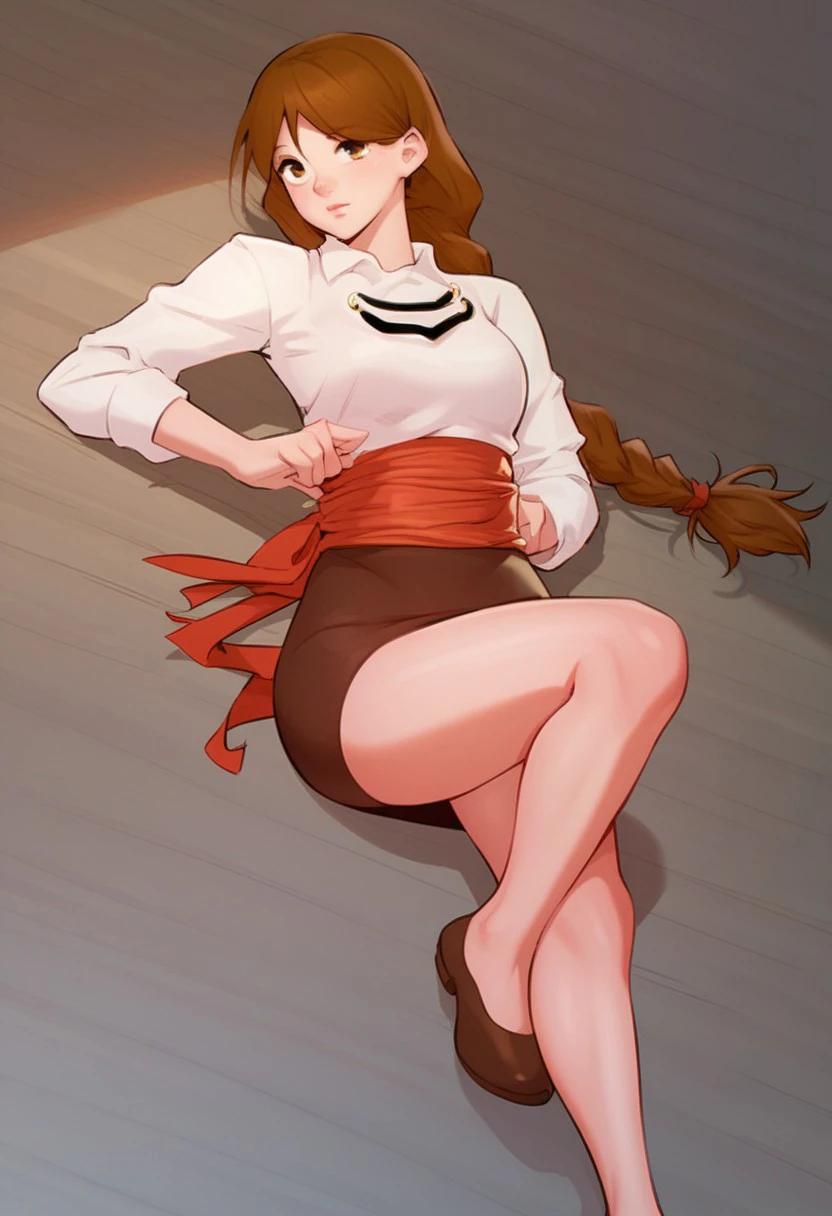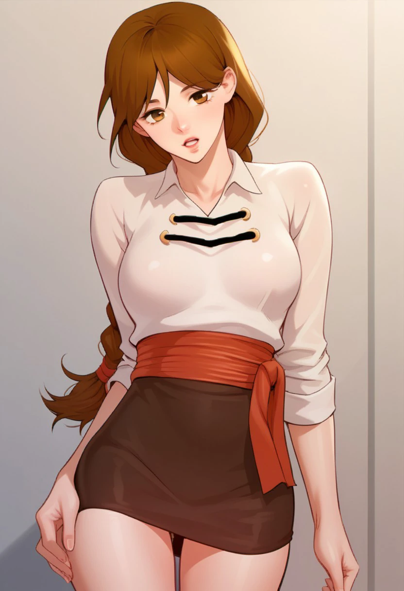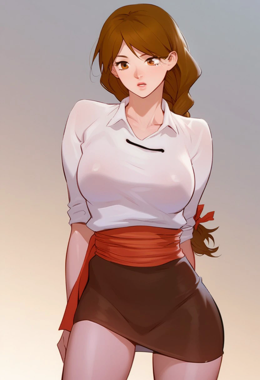 white shirt, red sash, brown miniskirt, pencil skirt,