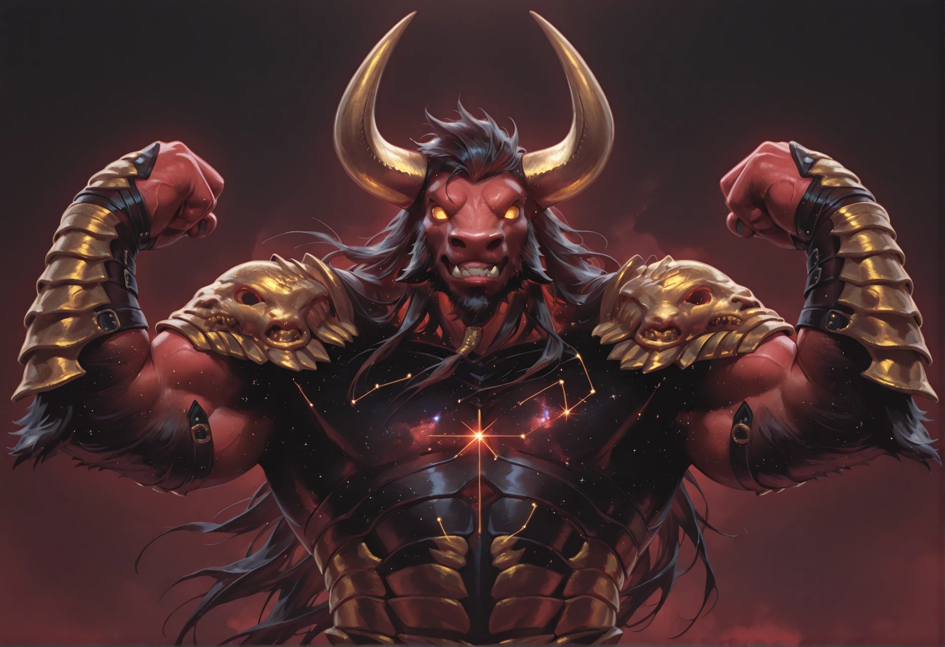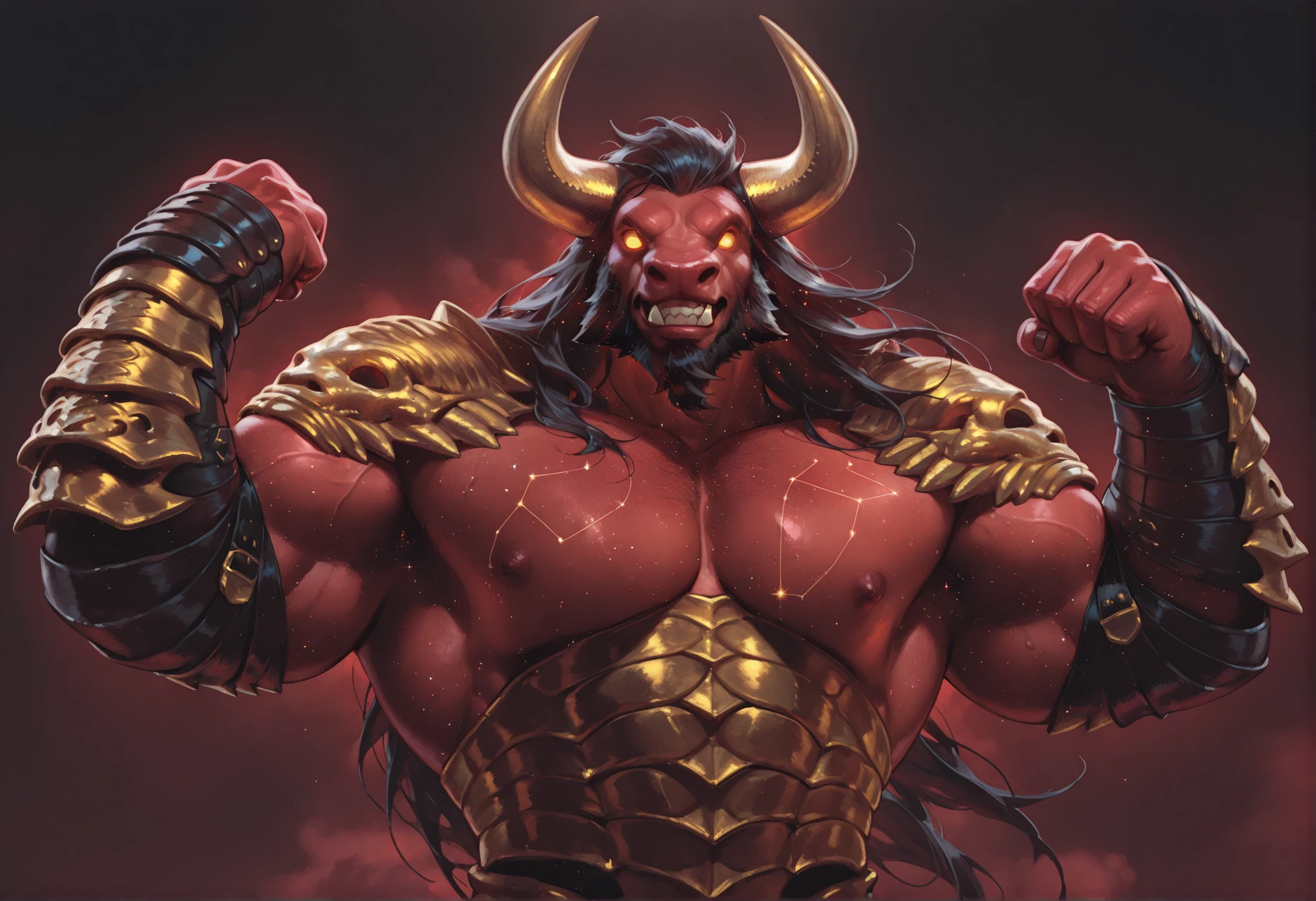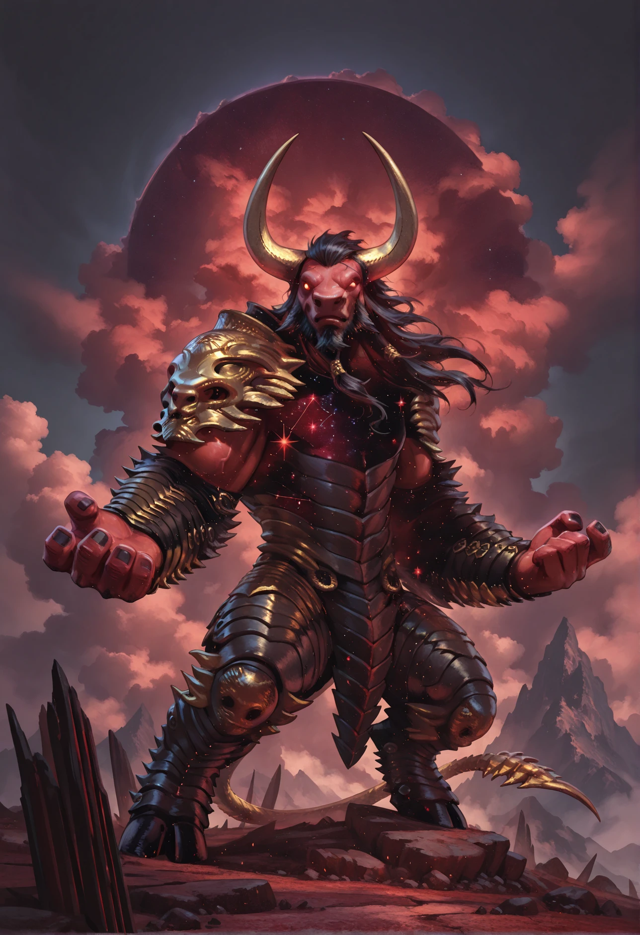 Tags: red skin, minotaur, black hair, armor, holding axe (optional), tail, horns, glowing eyes, constellation effect (optional), muscular, long hair, giant