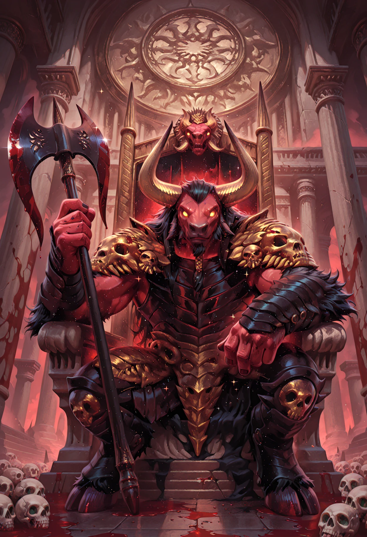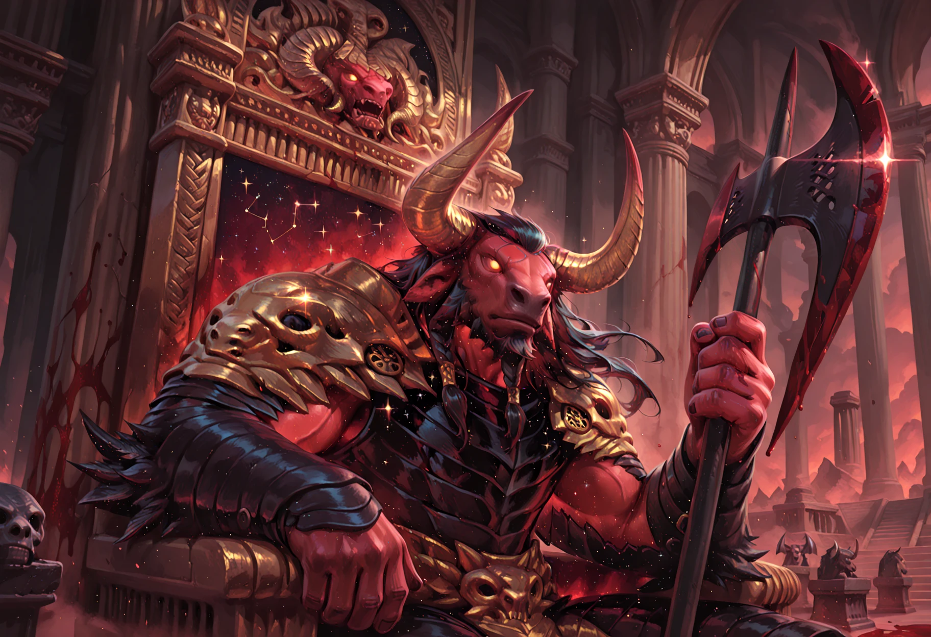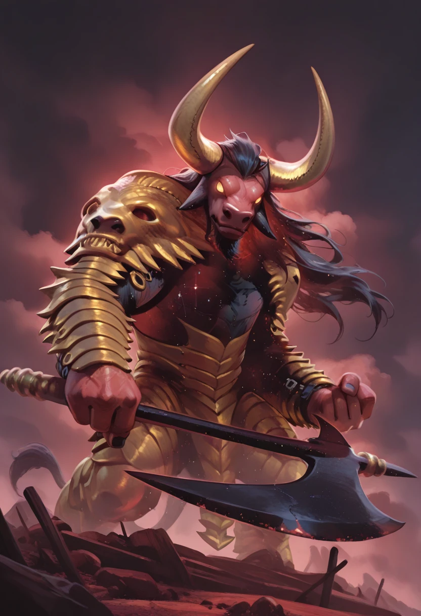 Tags: red skin, minotaur, black hair, armor, holding axe (optional), tail, horns, glowing eyes, constellation effect (optional), muscular, long hair, giant